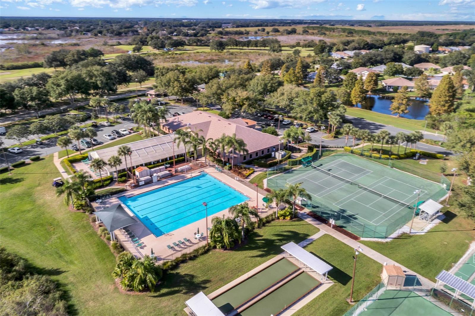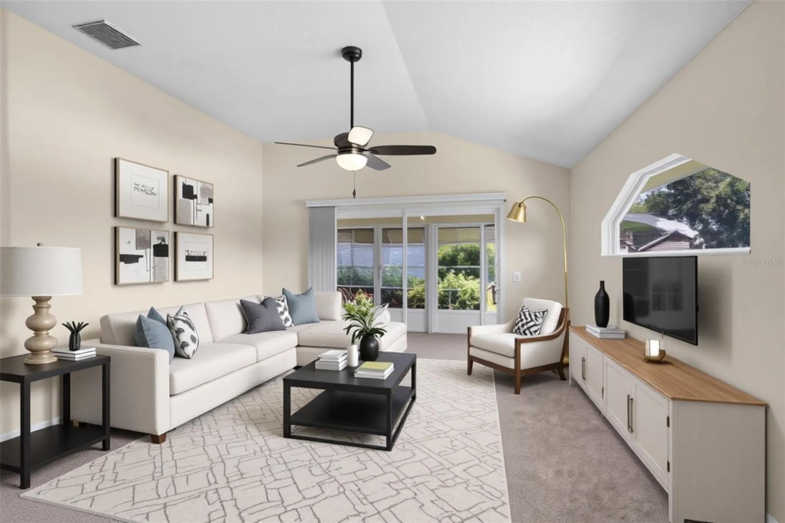 One or more photo(s) has been virtually staged. Located in the highly sought-after Royal Highlands 55+ gated golf course community—a premier resident-owned neighborhood known for its vibrant lifestyle, top-tier amenities, and unbeatable location. This charming 2-bedroom, 2-bathroom home features vaulted ceilings in the open-concept living area and primary suite, creating a spacious and airy atmosphere. A versatile office/bonus room offers the perfect space for remote work or hobbies. Brand-new carpet, new stainless steel appliances, and a bright laundry room with extra closet storage add to the home's move-in-ready appeal. Washer and dryer are included. The home also features a 2-car garage and a screened-in garage enclosure—perfect for fresh air without the bugs, transforming the space into a usable hangout or hobby area. Enjoy the bright and airy Florida room complete with sealed concrete flooring that offers both durability and style. This versatile space is perfect for a sunroom, play area, or indoor-outdoor retreat, ideal for relaxing and enjoying the peaceful neighborhood setting. This home is located on a desirable corner lot and features a 2024 roof, making it a low-maintenance and comfortable option for your next chapter. Royal Highlands offers resort-style amenities, including: 18-hole championship golf course, restaurant and pro shop, indoor and outdoor pools, lighted tennis courts, pickleball, shuffleboard, and bocce ball courts, a softball field, billiards, fitness center, card rooms, and library. The community’s Great Hall hosts regular social functions, concerts, plays, and fitness classes. HOA fees are low and include cable and internet. Secure RV/boat parking and storage are also available. The community has a 24/7 manned security gate for peace of mind. Perfect for those seeking to stay active, be social, and live the luxurious retiree lifestyle, this home offers opportunities for fun and connection every day. Whether it’s swimming, golfing, joining clubs, or simply enjoying quiet evenings in the Florida room, this home and community are built for enjoying life to the fullest. Located just minutes from The Villages and with convenient access to the Florida Turnpike, I-75, Orlando attractions!