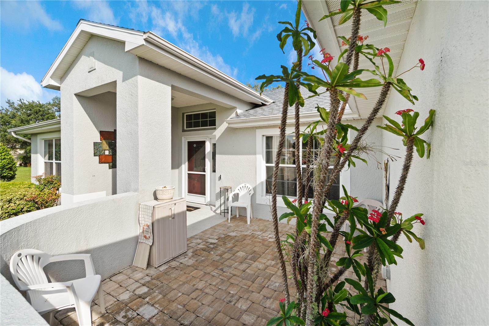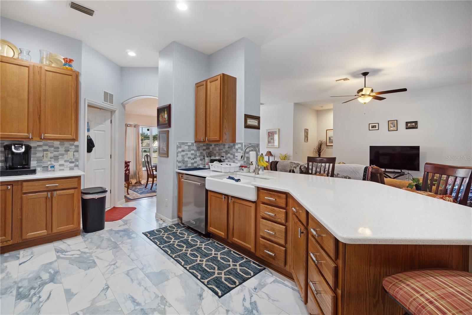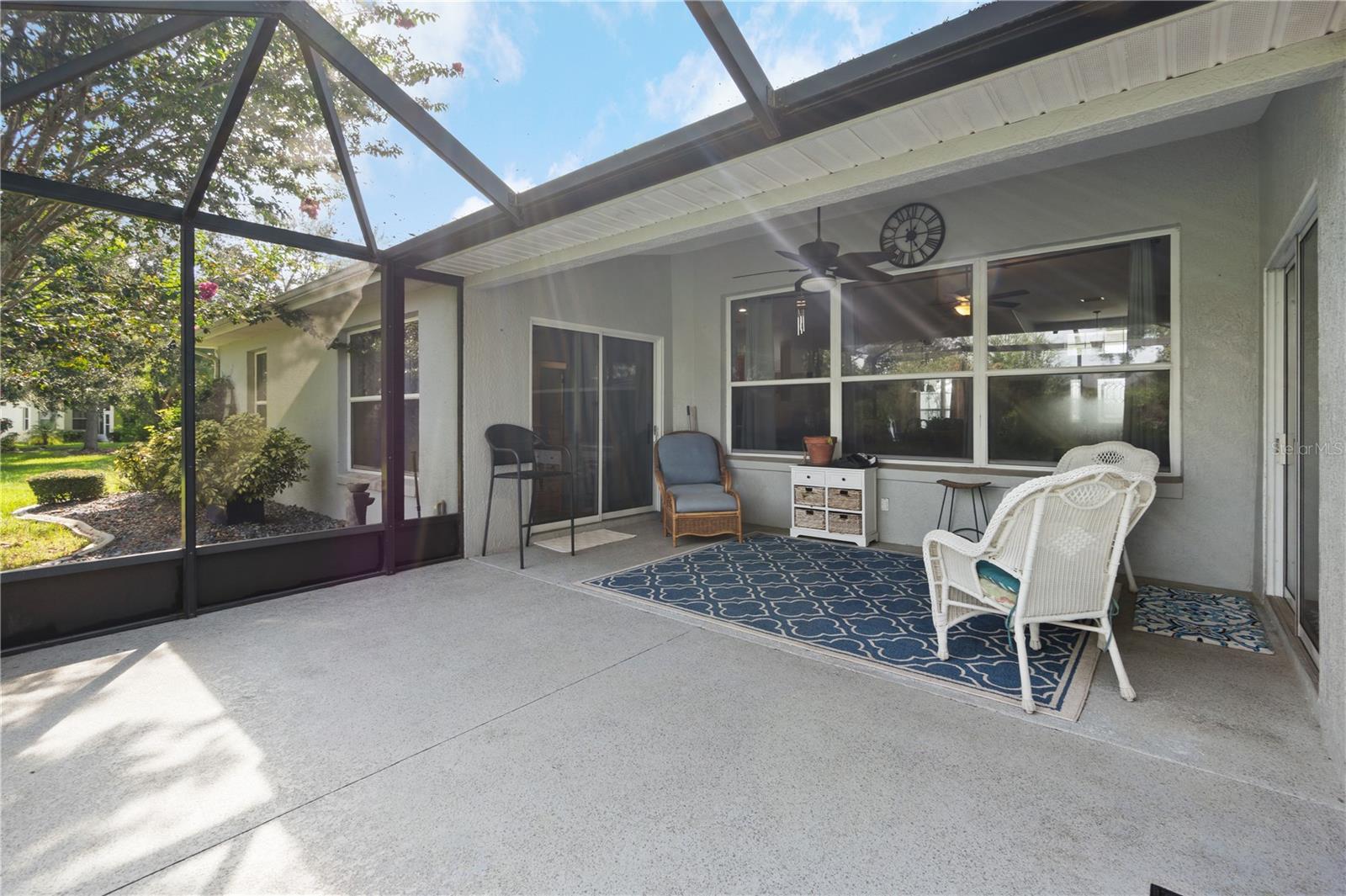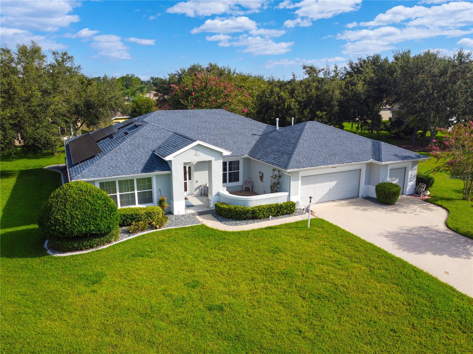Prepare to be impressed by this beautiful 3-bedroom, 2-bath home located in the highly desirable Legacy of Leesburg community! From the moment you arrive, you’ll notice the extended driveway, lush landscaping, and the convenience of a 2-car garage plus a separate golf cart garage. A charming front courtyard welcomes you inside, where you’re greeted by a formal living room and a versatile flex space perfect for a home office or reading nook. The kitchen, truly the heart of the home, is a chef’s delight with stainless steel appliances, quartz countertops, a farmhouse sink, handsome backsplash, breakfast bar seating, and a cozy breakfast nook with sliding glass doors leading out to the screened lanai. The spacious primary suite features walk-in closets, dual sinks, a glass enclosed shower, and a linen closet. On the opposite side of the home, two additional bedrooms share a full bath one of which is currently set up as a custom home office with built-in desk and cabinetry. Step through the laundry room into the garage, where you’ll find not only two full size parking spaces and a golf cart garage, but also a large workshop with abundant storage for tools and equipment. The central vacuum system is also conveniently located here. Additional highlights include an oversized lot of more than half an acre and energy savings with a solar power system under an affordable, transferable lease. Legacy of Leesburg is a gated, active-adult community offering an incredible lifestyle with walking trails, clubhouse, library, billiards, resort-style heated pool, social events, RV & boat storage, cable, internet, and lawn maintenance including. Conveniently located near major highways, shopping, and dining.
