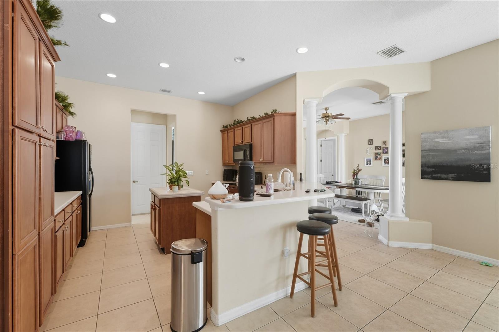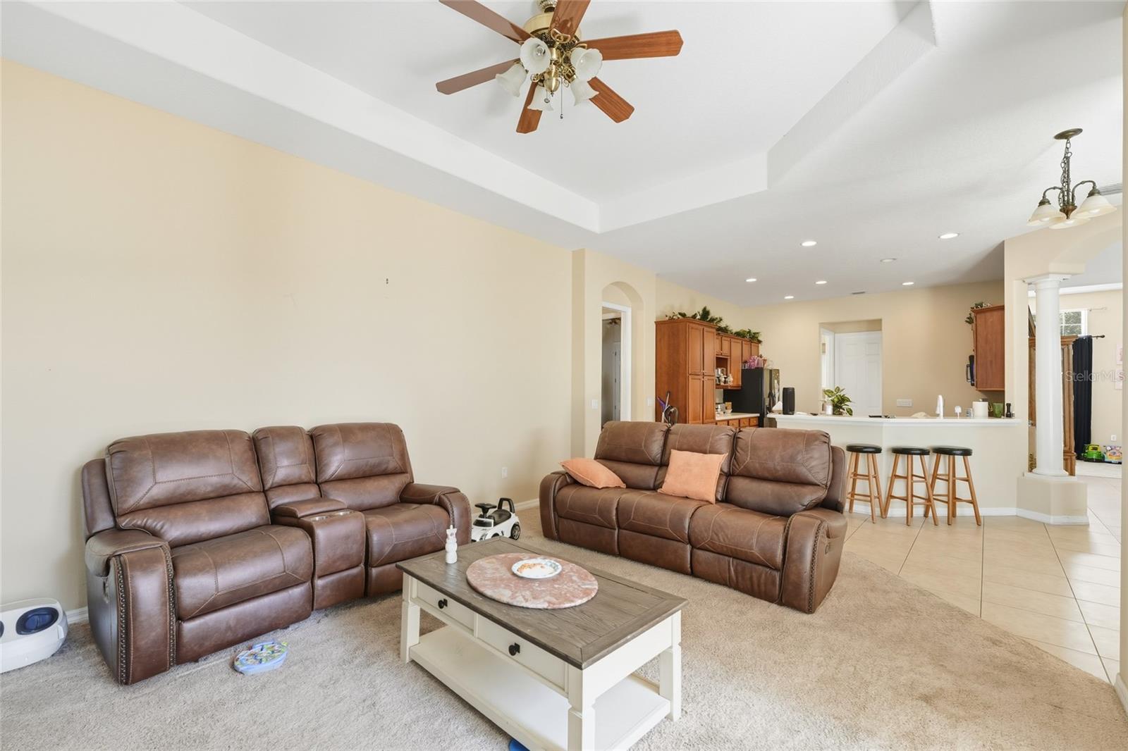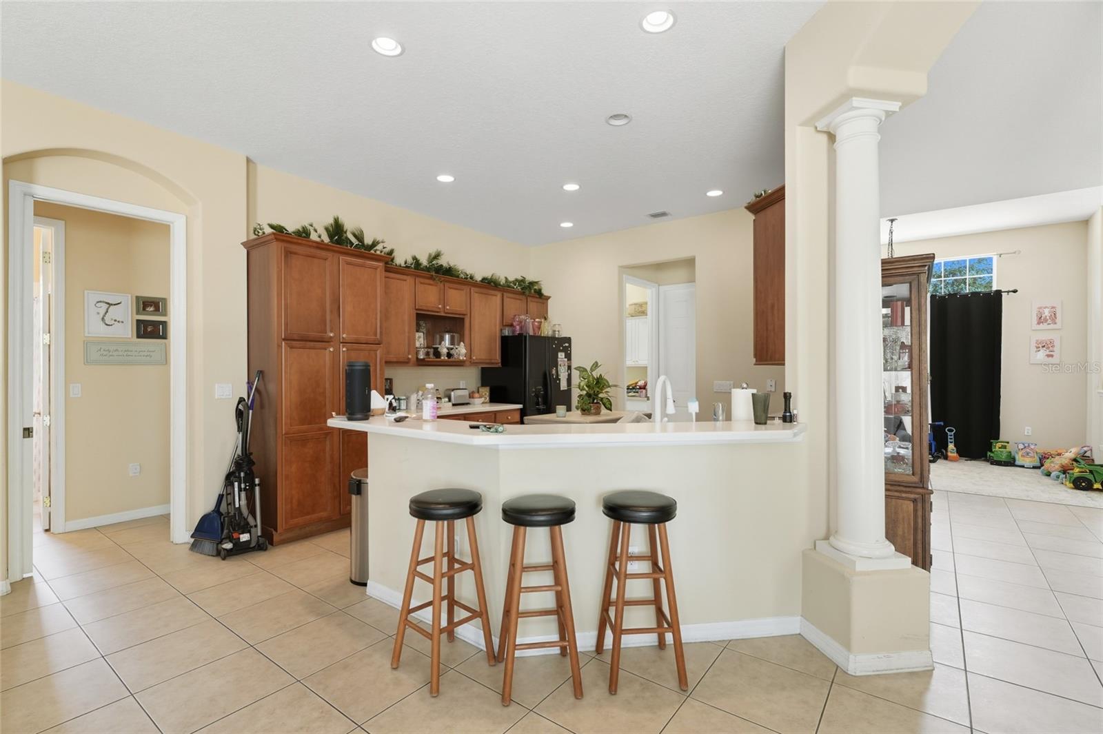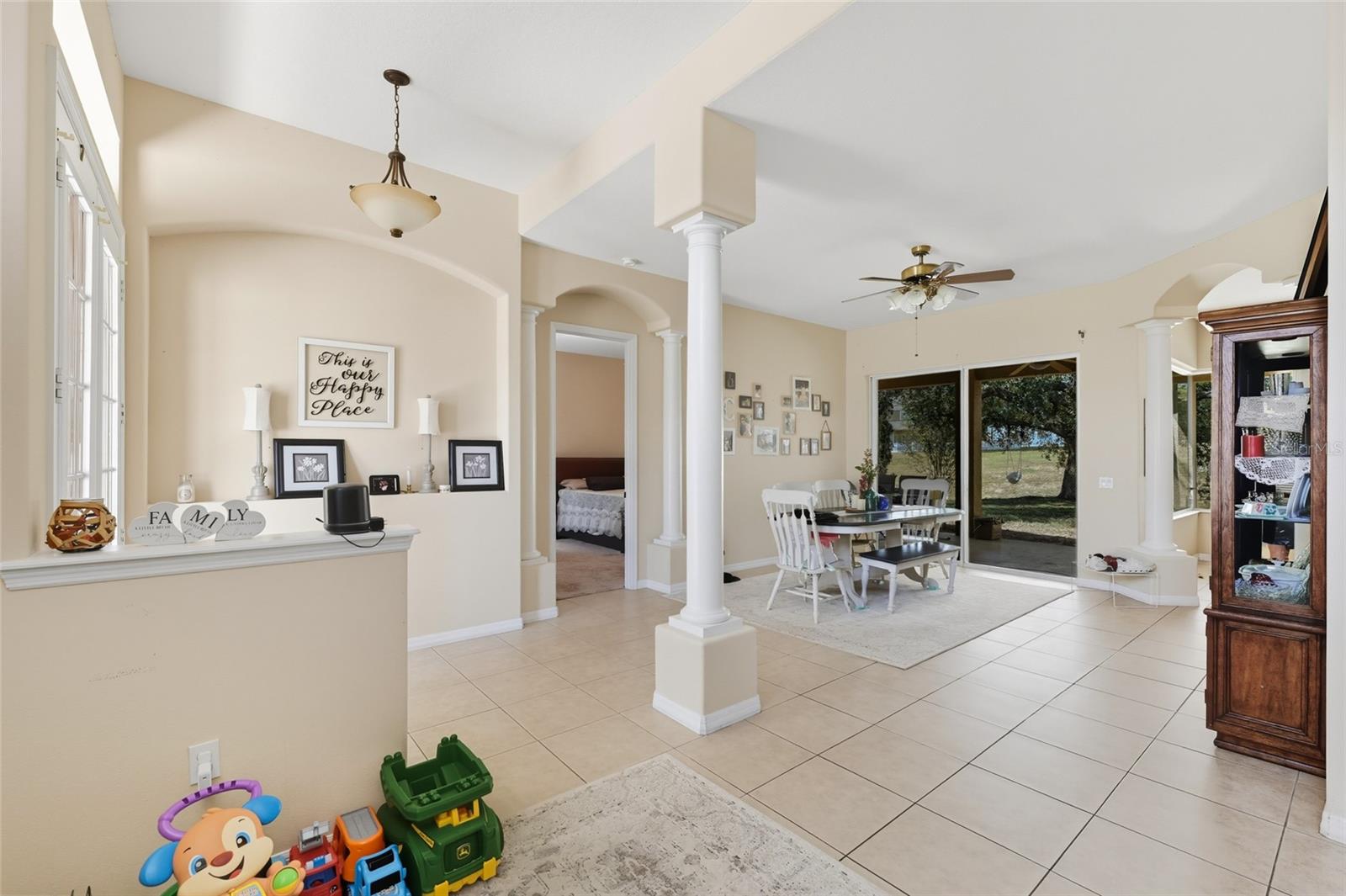 Exceptional Opportunity! Welcome to 33213 Irongate Dr, Leesburg, FL 34788 a stunning 2,163 SqFt, 3-bedroom, 2-bath home featuring a smart and functional layout with separate living and dining rooms, a cozy family room with custom built-in shelves, and a bright breakfast nook that opens to a spacious patio perfect for entertaining or relaxing. With 10-foot ceilings, elegant columns, rounded corners, and decorative plant shelves, the home feels open, stylish, and welcoming. Ceramic tile flooring flows throughout the main living areas, while the family room and bedrooms provide comfort and warmth. The kitchen is a chef’s dream, featuring an island, Corian countertops, and plenty of cabinet space. The master suite is truly a retreat, with two walk-in closets and a luxurious bath complete with a garden tub, separate shower, and dual vanities. Located in the desirable Stonegate gated community, residents enjoy excellent amenities including a sparkling pool, playground, and clubhouse. Conveniently close to Lake Square Mall, shopping, dining, and more this home is an absolute must-see!