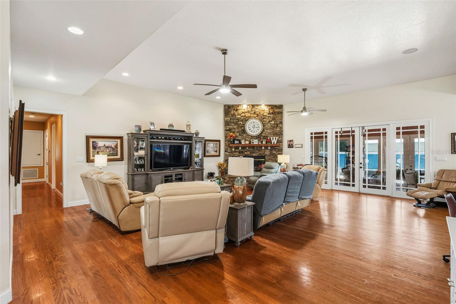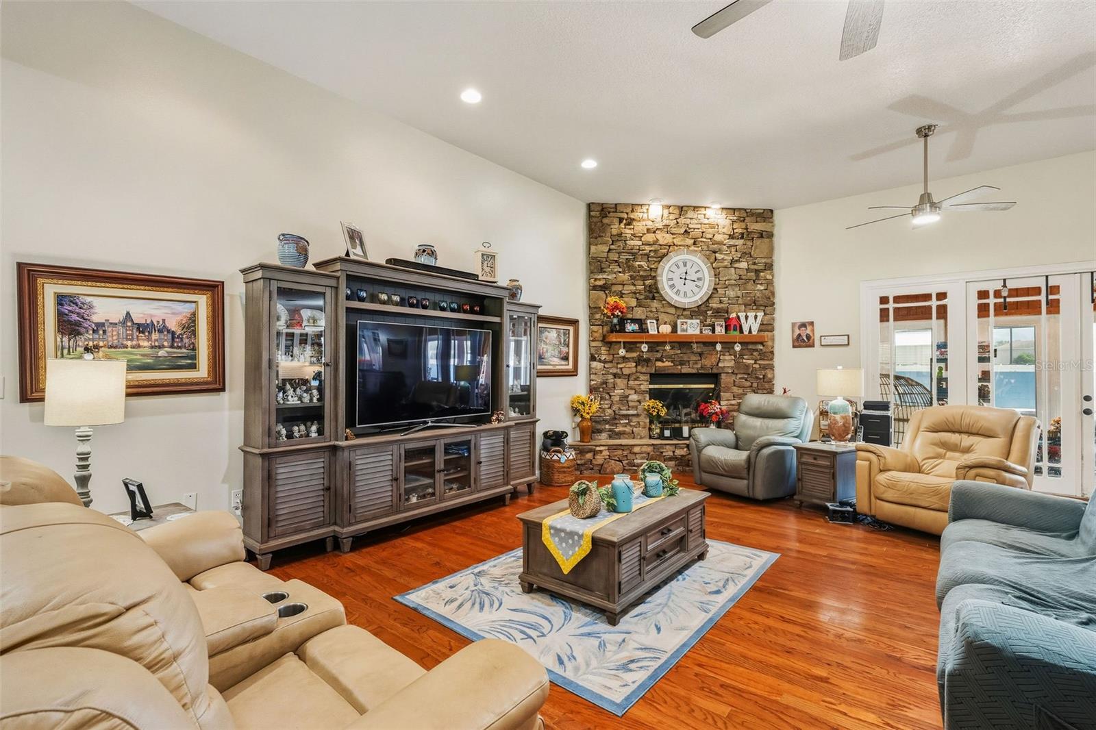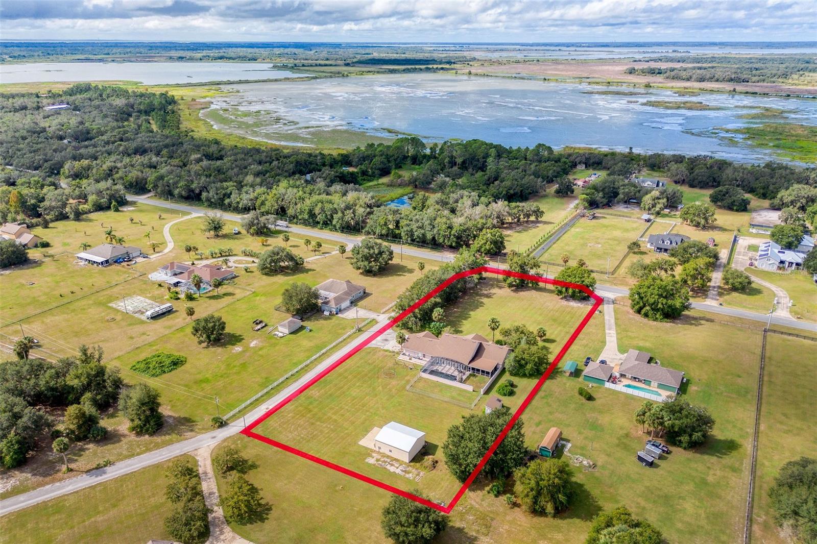 One or more photo(s) has been virtually staged. Welcome to your dream retreat in the heart of Central Florida — a stunning 4,495 sq ft custom residence nestled on 2.3 acres with no HOA and ample space to park boats, RVs, or build the lifestyle you’ve always envisioned. This expansive 5 Bed, 3.5 Bath home begins with a grand foyer entry, gleaming hardwood floors, and a true open concept great room plan with soaring 12-foot ceilings. A stone-accented gas fireplace anchors the main living space, framed by custom built-ins and picture windows that pour in natural light. The kitchen is freshly updated with granite countertops, stainless appliances, a large island, and a breakfast nook big enough to seat the entire family. Entertain effortlessly with connected formal and informal dining areas. Unwind in the Florida sunroom, a showstopper with warm tongue-and-groove ceilings, ceramic tile floors, and panoramic views of the screened black-bottom lagoon-style pool. Adjacent is a summer porch/kitchen perfect for weekend barbecues and gatherings. The primary suite is an absolute sanctuary — oversized and private, with a luxurious en-suite bath featuring dual vanities, a soaking tub, and walk-in shower. Don’t miss the California-style custom walk-in closet — a storage lover’s dream! All secondary bedrooms are generously sized with Jack-and-Jill bathrooms and ample closet space — perfect for a growing family or multi-generational living. Car collectors and hobbyists will fall in love with the brand-new detached garage/workshop, complete with high ceilings, concrete flooring, and power — ideal for tools, toys, or treasured vehicles. Additional outbuildings offer even more storage and function. With room to roam, no HOA restrictions, and an unbeatable location in Leesburg, this property blends country serenity with everyday convenience. Come live the Florida acreage lifestyle without compromise!