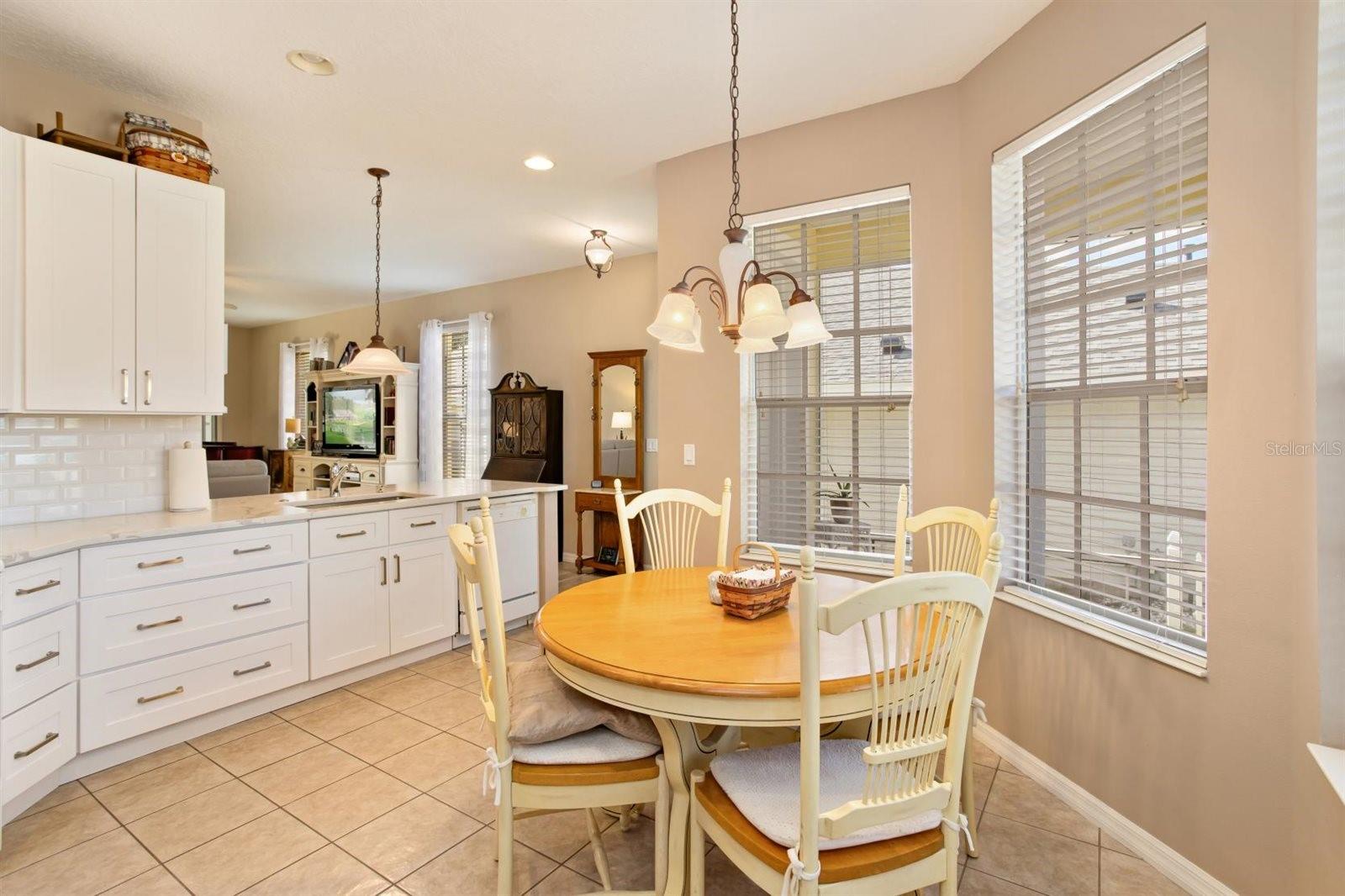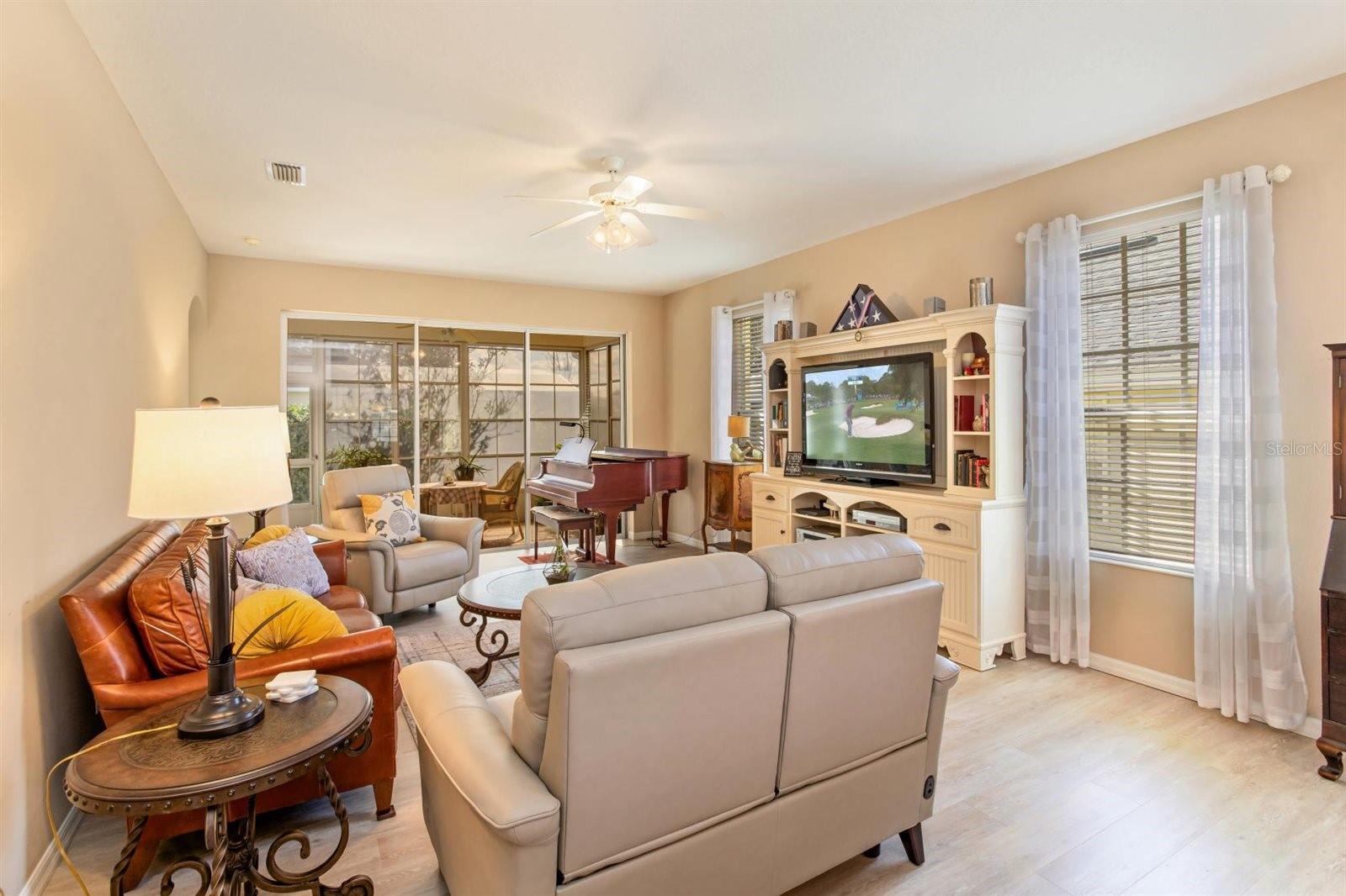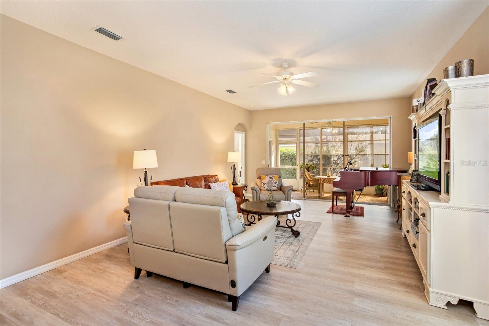 TRULY A MUST SEE SINGLE-STORY CBS HOME located in the desirable 55+ GATED COMMUNITY of Royal Highlands offering an incredible ARRAY of AMENITIES. This magnificently UPGRADED residence features an OPEN-CONCEPT LAYOUT, ideal for entertaining, highlighted by HIGH CEILINGS, LUXURY VINYL FLOORING, and a BEAUTIFUL REMODELED KITCHEN. The kitchen showcases QUARTZ COUNTERTOPS, a stylish TILE BACKSPLASH, SOFT-CLOSE CABINETRY, STAINLESS STEEL FRENCH-DOOR REFRIGERATOR, ELECTRIC RANGE, and a large BREAKFAST BAR with COUNTER-HEIGHT SEATING overlooking the great room. A SUN-FILLED BREAKFAST NOOK with three café windows provides abundant NATURAL LIGHT and the perfect spot for morning coffee. The SPACIOUS GREAT ROOM offers flexible dining and living space with TRIPLE SLIDERS leading to a FULLY-ENCLOSED 15X8 LANAI surrounded by expansive windows—ideal for year-round enjoyment. The PRIMARY SUITE features VAULTED CEILINGS, LUXURY VINYL FLOORING, a WALK-IN CLOSET, and sliders to the lanai. The PRIMARY BATH includes a COMFORT-HEIGHT VANITY, LARGE GARDEN TUB, and SEPARATE SHOWER. The guest area offers two additional bedrooms (one ideal as an office or den) and a full guest bath. The REMODELED LAUNDRY ROOM features new white cabinetry and a full-size stackable washer and dryer, maximizing storage and functionality. The 2-CAR GARAGE includes a WIFI-ENABLED GARAGE DOOR OPENER and SLIDING SCREEN DOORS for added privacy and shade. This CONCRETE BLOCK HOME offers exceptional added value with numerous quality upgrades, including a PAVER DRIVEWAY, EXPANSIVE FRONT PAVER PATIO, REAR PAVER PATIO DECK, WHOLE-HOUSE WATER SOFTENER, REVERSE OSMOSIS, RAIN GUTTERS, new TAP ATTIC INSULATION in the garage, and a TRANSFERABLE TERMITE WARRANTY. ROYAL HIGHLANDS is a premier, resident-owned 55+ community surrounded by CONSERVATION LAND, PONDS and LAKES, featuring an 18-HOLE GOLF COURSE with PRO SHOP and RESTAURANT and amenities galore: Clubhouse/Recreation Center, Fitness Center, Two Pools (indoor and outdoor), Lighted Tennis Courts, Pickleball, Bocce, Shuffleboard, Billiards Room, Library, Activity Rooms-Card Rooms, Arts and Crafts, Softball Field, RV/Boat storage, and a Grand Hall for Concerts/Social Events. Golf carts are allowed, and HOA dues include Wi-Fi and Cable. Conveniently located off N Hwy 27, just one mile to the FL Turnpike and convenient to shopping, dining, and medical facilities, with easy access to Clermont, Minneola, Leesburg, Orlando International Airport, theme parks, downtown Orlando, and The Villages. SUPER CLEAN AND TRULY MOVE-IN READY, this home offers COMFORT, QUALITY, and the LIFESTYLE YOU DESERVE! NEW ROOF (2022), WATER HEATER (2022), and EXTERIOR PAINT (2023).