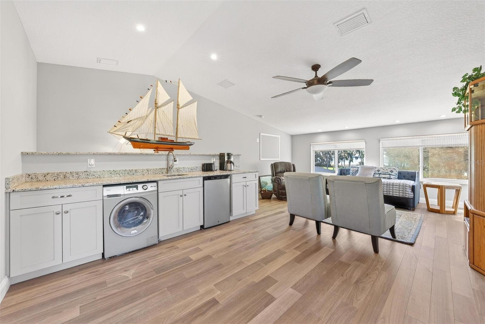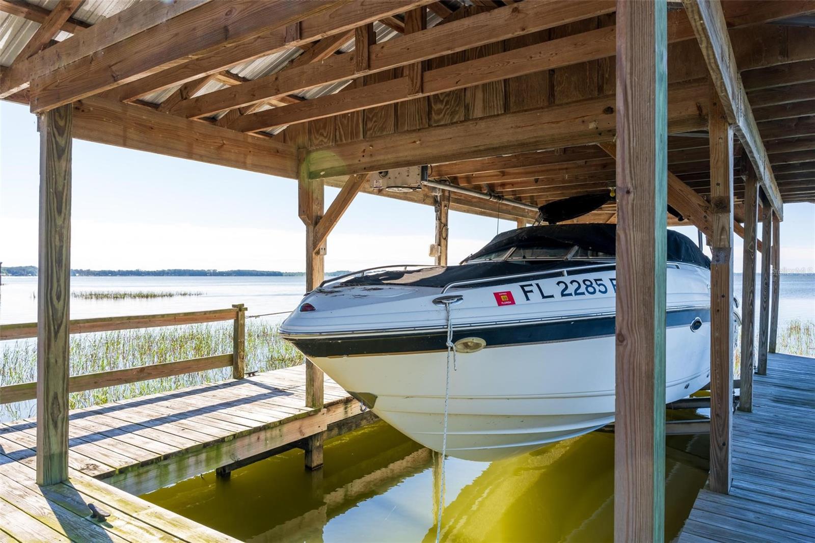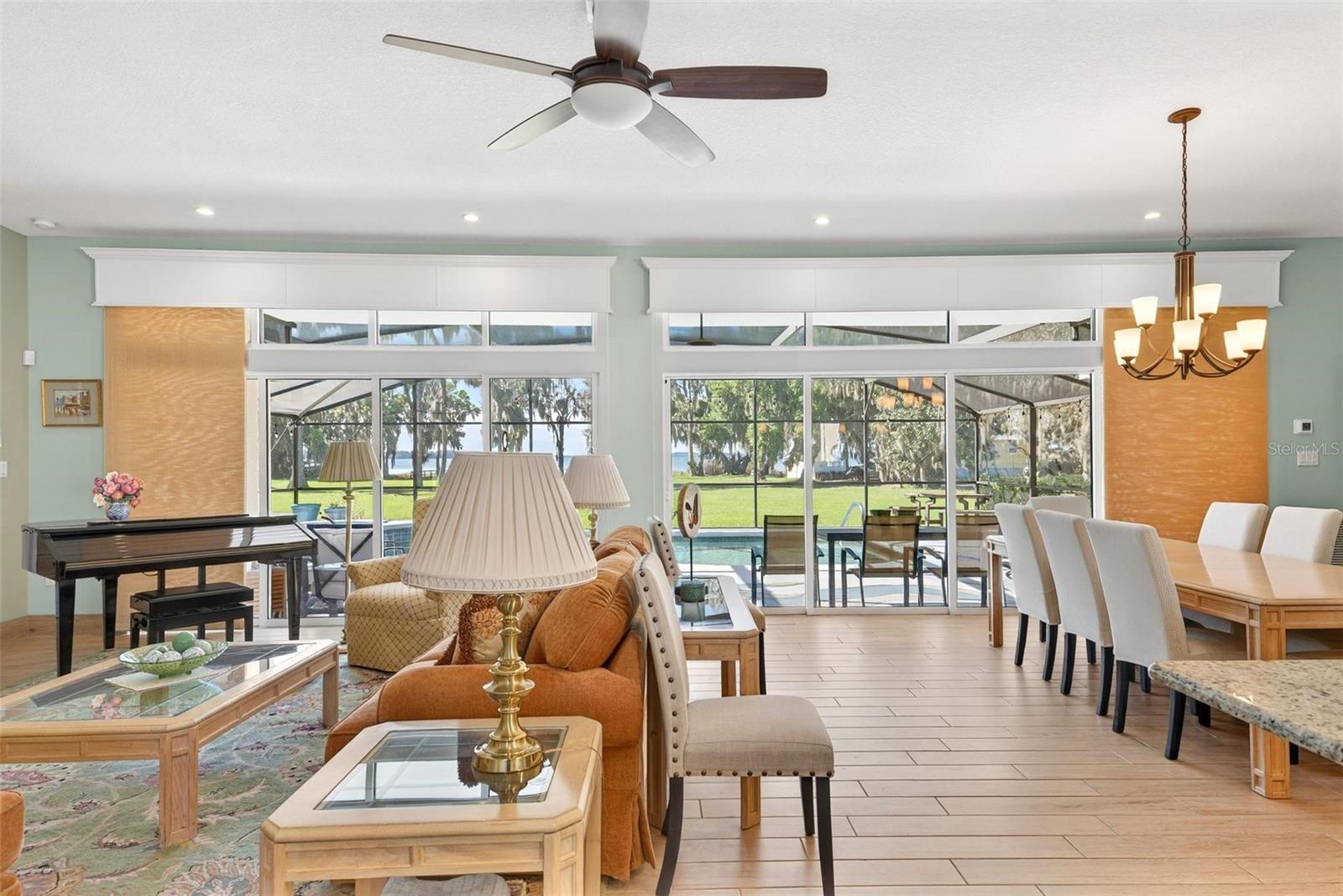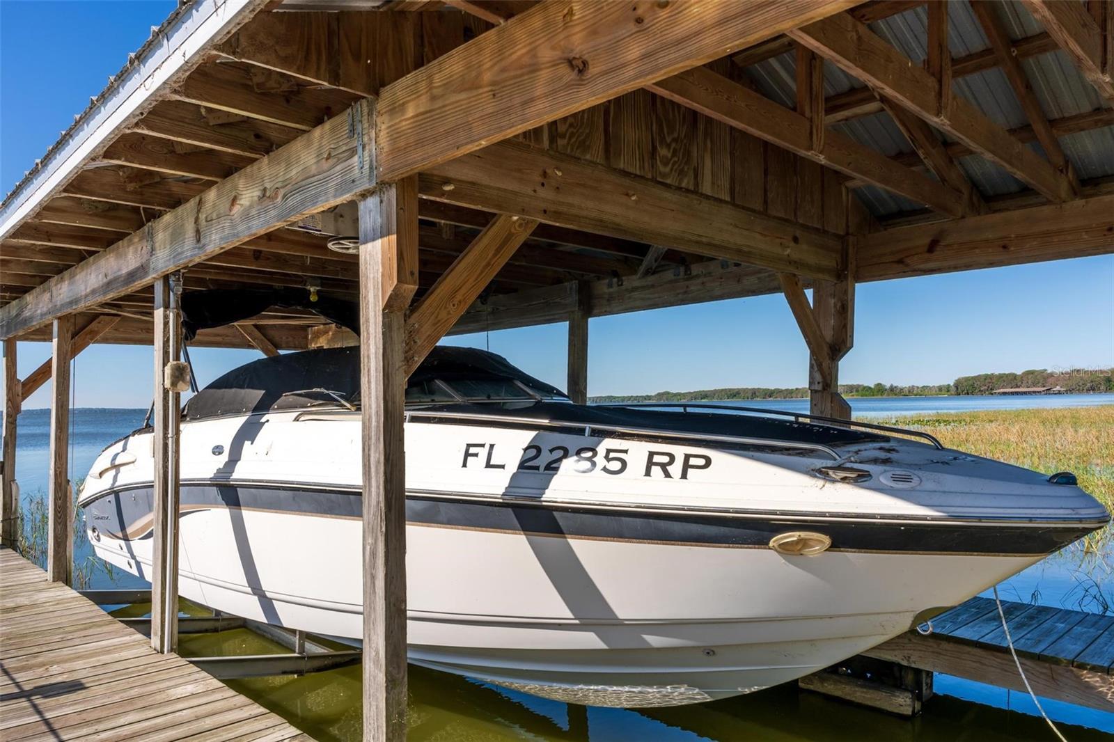 Welcome to 10220 Bumblebee Lane in Leesburg, a truly one-of-a-kind lakefront estate on the legendary Harris Chain of Lakes where luxury, versatility, and lifestyle collide on a sprawling 1.35-acre property with a 164’ dock fully equipped with power, water, lighting, and a mechanical lift setting the tone for unforgettable days and nights on the water before you ever step inside; once you do, the home immediately captivates with breathtaking panoramic views through dual 12’ accordion sliders that open to the pool and lake beyond, showcasing a completely renovated 34’ x 25’ open-concept living, dining, and kitchen space with soaring cathedral ceilings and an entertainer’s dream kitchen featuring an oversized island, farmhouse sink, premium KitchenAid appliances, and even two dishwashers for those lively gatherings, while the thoughtfully designed layout offers three bedrooms downstairs plus a private approximately 725 sq ft upstairs in-law suite with its own exterior and interior entrances, kitchenette, washer/dryer combo, and full bath, perfect for multigenerational living, guests, or income potential, along with a hidden 4’ x 30’ walkable storage corridor cleverly tucked behind the walls; the primary suite delivers a true retreat with French doors to the pool, dual walk-in closets, split granite vanities, a jacuzzi tub, and an accessible walk-in shower, complemented by wide 36” doorways, spacious hallways, accessible bathrooms, and a seamless garage entry all designed for ease and comfort, while outside you’ll also find a dedicated full bath for pool and lake days, a powered 12x12 shed, and a 40’ x 10’ storage container with ventilation, skylight, and industrial storage; the expansive grounds provide ample room for RVs, boats, trailers, future additions, or simply enjoying the privacy and space rarely found on the Chain, with mature landscaping and open skies creating a peaceful retreat just minutes from town, and when it comes to lifestyle, boating from your backyard opens the door to iconic destinations like the scenic Dora Canal, waterfront dining in Tavares at Tiki West Raw Bar & Grill or Ironworks Steakhouse, or an afternoon in charming Mount Dora with stops at The Goblin Market or Pisces Rising for dining and live entertainment, plus convenient access to Orlando, world-renowned attractions, and Florida’s beautiful east and west coast beaches, making this not just a home but a gateway to the ultimate Central Florida lake life—opportunities like this are rare, so if you’ve been dreaming of owning on the Chain, this is your moment.