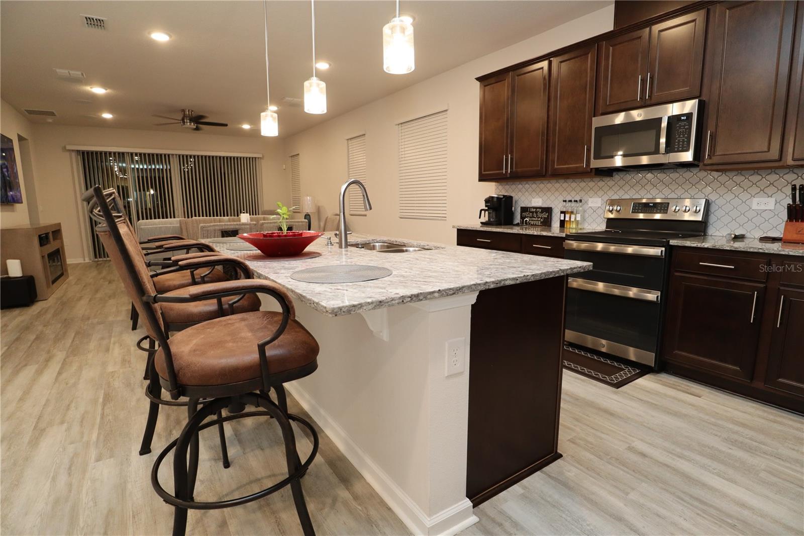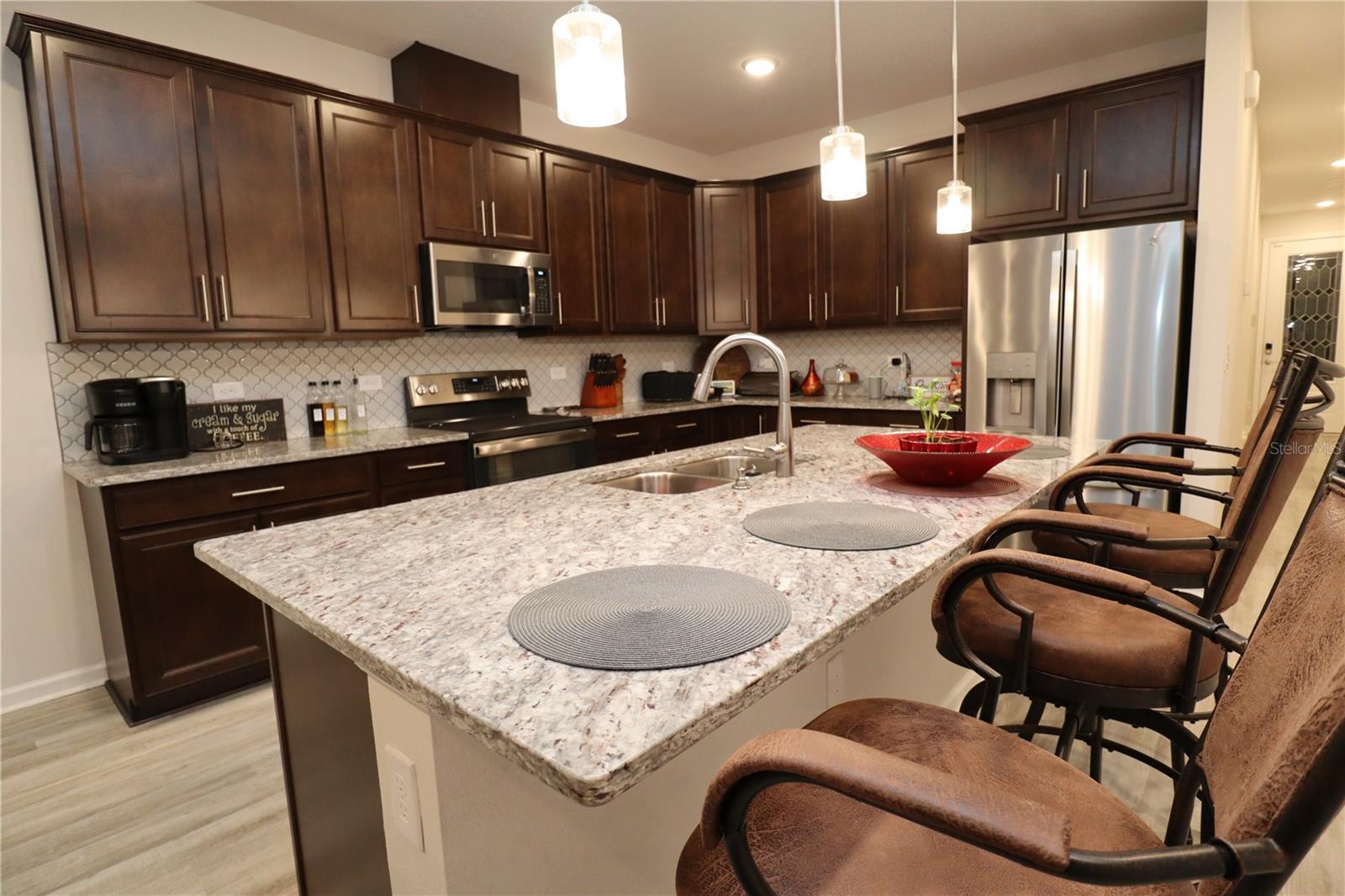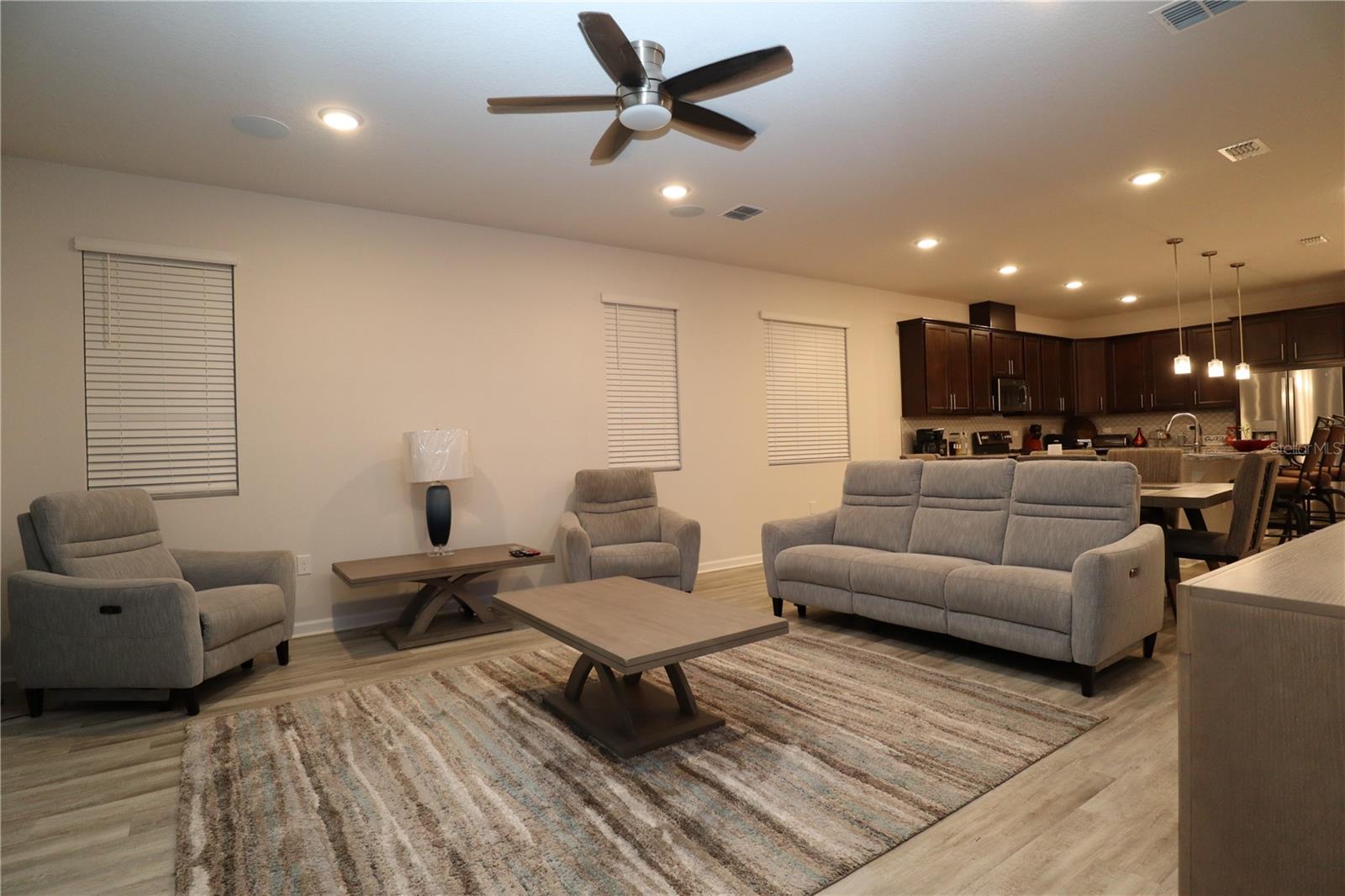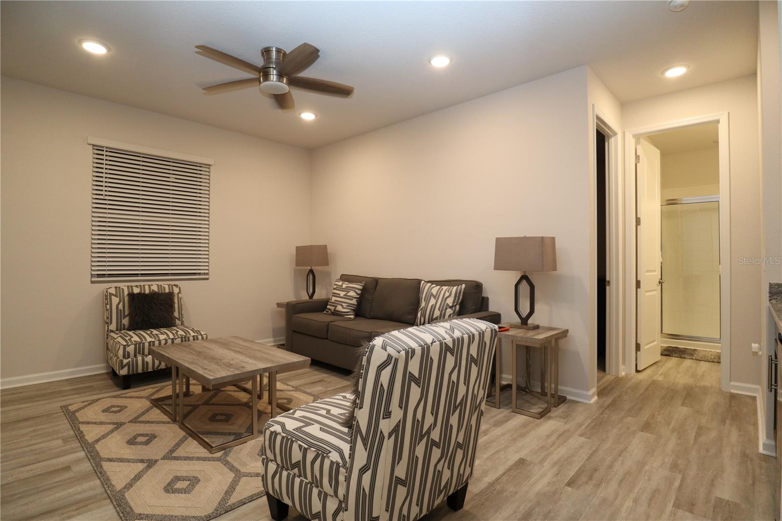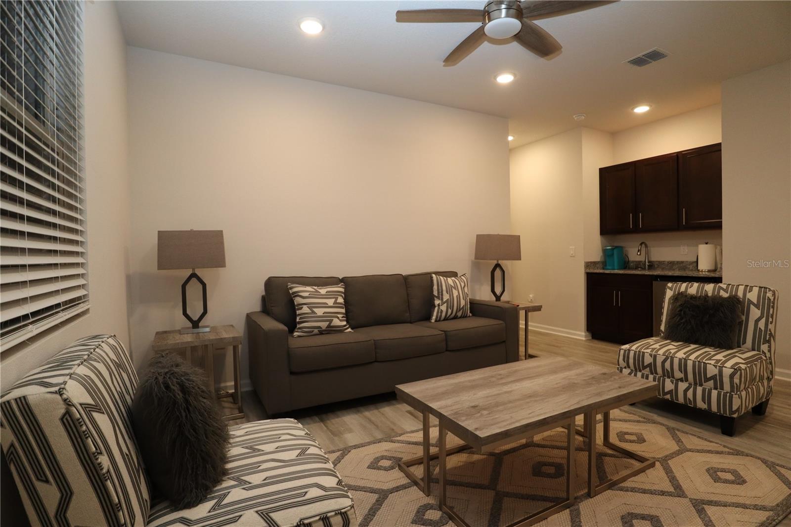 Look no further! This beautifully designed home, newly built in 2022, is the ideal blend of luxury and functionality. With 4 spacious bedrooms, 3 full bathrooms, and an impressive layout which includes an in-law studio apartment. This home is crafted for comfort and convenience as it's located near Lake County's Lake Square Mall, many stores and restaurants. Step inside to find soaring 12-foot ceilings and an open-concept kitchen, dining, and living area. The kitchen is a showstopper with its custom backsplash and seamlessly blends with the dining and living spaces, creating a perfect atmosphere for entertaining. Enjoy premium Bose surround sound speakers installed in the living room ceiling, elevating your audio experience. Ceilings fans are located throughout to maintain a comfortable breeze while you relax. The home includes two laundry rooms – one dedicated to the main living area and a second, stackable washer and dryer set in the studio suite. This versatile suite offers a private retreat with a bedroom, full bathroom, living room, and a wet bar/kitchenette, perfect for guests, in-laws, or rental potential. Equipped with an ADT alarm system for added peace of mind, this home is ready for you to move in and start living. With ample linen closets and thoughtful storage throughout, this home perfectly combines style, comfort, and security. Don’t miss out on this exceptional property!