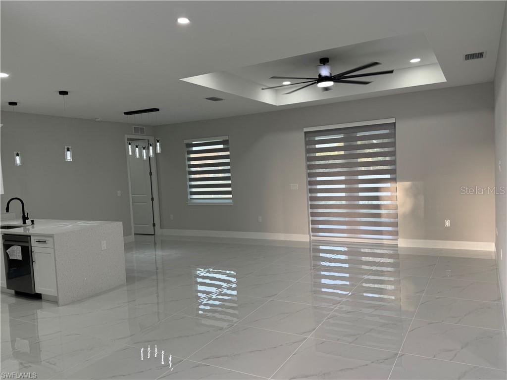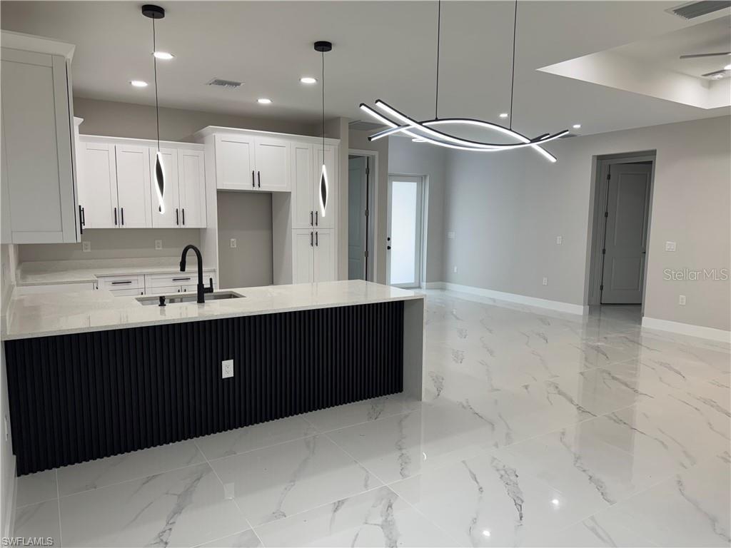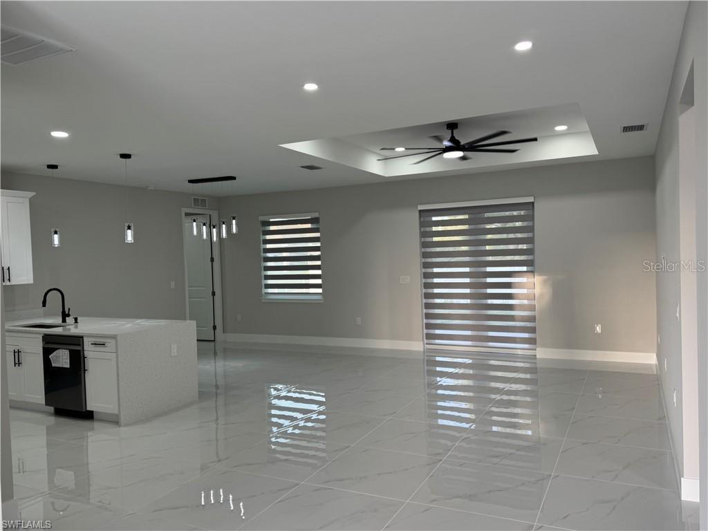 Welcome to an exceptional new construction residence in the heart of Lehigh Acres, where contemporary luxury meets thoughtful design. This impeccably crafted home presents an enticing blend of sophistication and practical living spaces, offering three bedrooms and two well-appointed bathrooms. Step through the elegant double-door entry into a home that exemplifies modern Florida living. The great room design creates an impressive sense of openness, seamlessly connecting living spaces and establishing an ideal environment for both entertaining and daily life. The heart of this home is its beautifully conceived kitchen, featuring a traditional eat-in design enhanced by a generous island that doubles as a casual dining space. Culinary enthusiasts will appreciate the complete suite of new stainless steel appliances, including a refrigerator, dishwasher, microwave, and range. The kitchen's intricate aesthetic is elevated by premium quartz countertops, which extend into the bathrooms, maintaining a cohesive design throughout. The primary bedroom suite stands as a private retreat, boasting a spacious walk-in closet and an elegant bathroom with dual sinks. Two additional bedrooms provides comfortable accommodations for family members or guests, while the second full bathroom ensures convenience for all. Throughout the residence, premium porcelain tile flooring creates a seamless flow, reflecting light and contributing to the home's bright, airy atmosphere. Safety and durability were paramount in the design, with impact windows and doors providing peace of mind during Florida's seasonal weather. The covered lanai extends the living space outdoors, offering a serene setting for morning coffee or evening relaxation. Professional landscaping enhances the front yard, creating immediate curb appeal and a welcoming approach to your new home. This residence's location proves equally impressive, positioned just blocks from Lee Boulevard and offering swift access to Fort Myers. The neighborhood boasts exceptional educational opportunities, with elementary, middle, and high schools mere moments away, along with a public library for lifelong learning. Daily conveniences are equally accessible, with shopping and dining options within easy reach. For the practically minded, it's worth noting that this property sits outside designated flood zones, offering additional peace of mind. The inclusion of a washer and dryer adds to the move-in ready appeal of this thoughtfully designed home. This new construction represents more than just a house; it's an opportunity to embrace a lifestyle where comfort meets convenience, where modern amenities blend seamlessly with practical living, and where every detail has been carefully considered to create an exceptional living experience. Don't let this remarkable opportunity pass you by - schedule your private showing today and step into your future home.