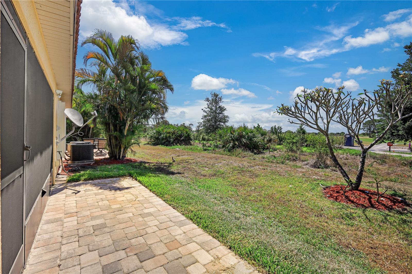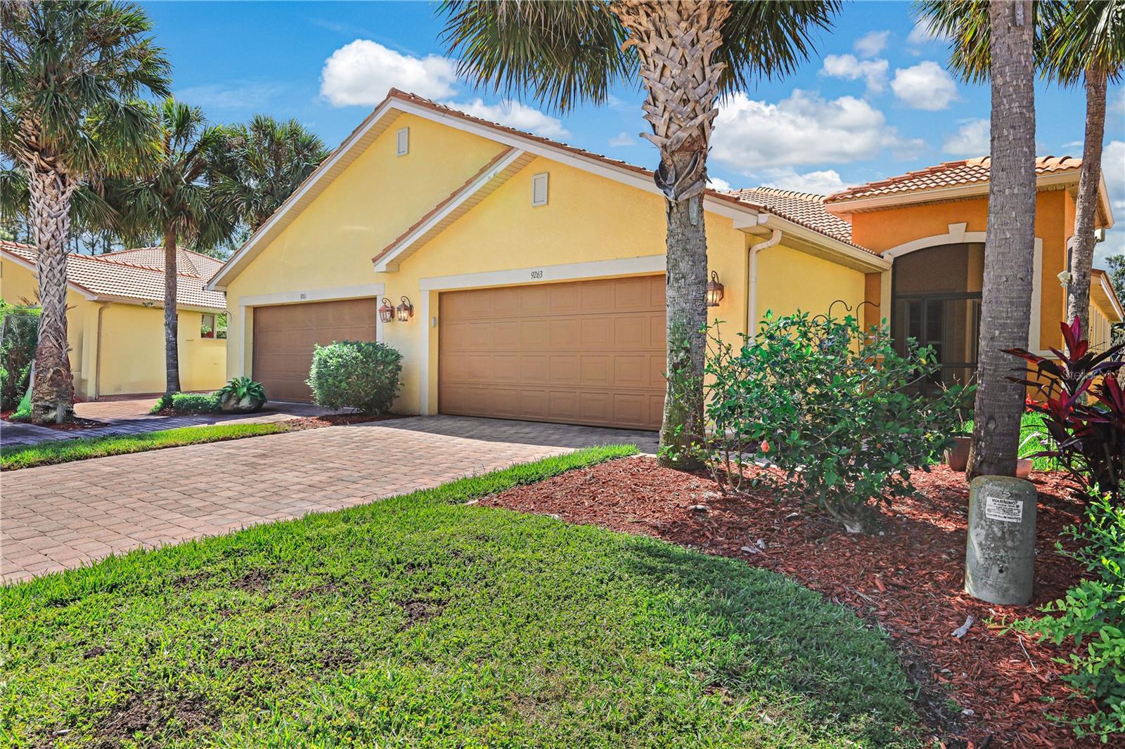 Welcome to Vistana Villas! This beautifully updated attached villa stands out with its original concrete block construction—offering enhanced durability compared to the later-built wood frame homes in the Community. Featuring a tile roof and 2-car garage, this home boasts a spacious great room with vaulted ceilings and tile flooring. The remodeled kitchen includes granite counters, tile backsplash, upgraded white Shaker cabinets with crown molding, and stainless steel appliances. A leaded glass front door adds charm and natural light to the entryway. The primary suite offers luxury vinyl plank flooring, dual sinks, and a tub/shower combo in the bath. Additional highlights include accordion storm shutters, a generator with exterior hookup, and a brand-new stacked washer/dryer in the laundry room. Both lanais have been recently rescreened, and the rear lanai opens to an extended brick paver patio with peaceful preserve and golf course views. The gated community features a pool with cabana, playground, underground utilities, and low HOA fees. Not in a flood zone and just 30 minutes to RSW Airport—this villa is a must-see!