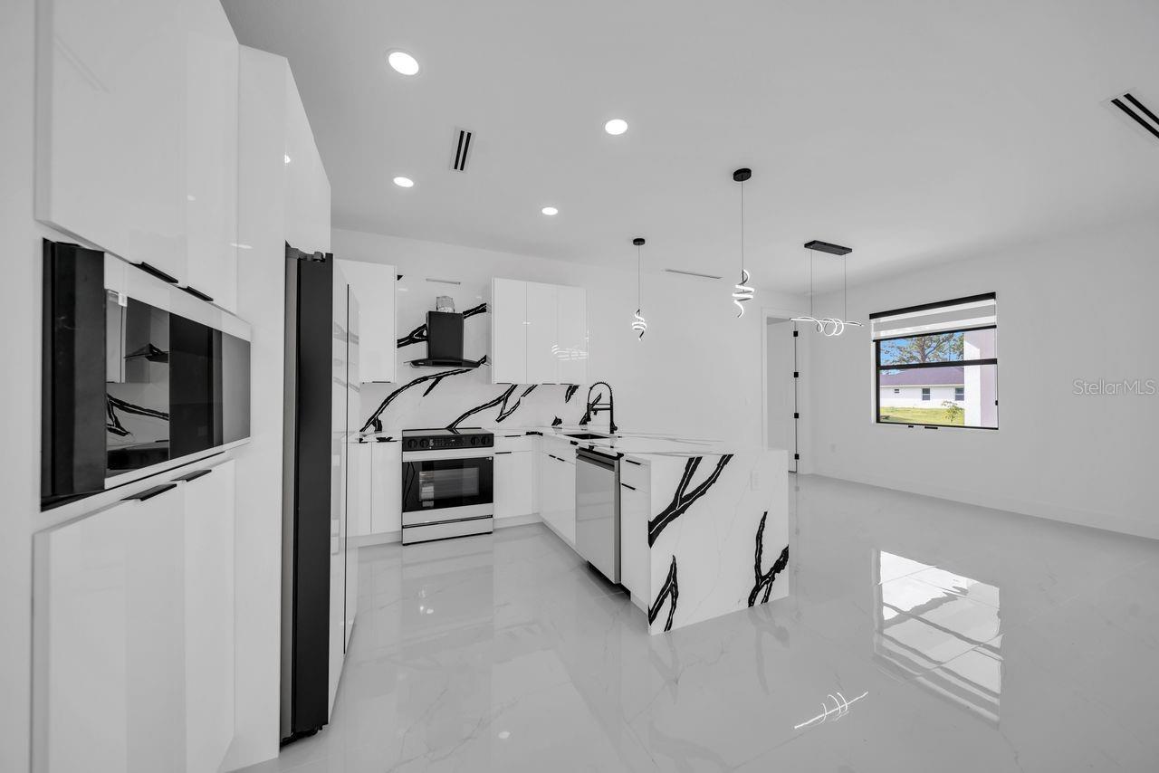 Welcome to an exceptional new construction residence in the heart of Lehigh Acres, where contemporary luxury meets thoughtful design. This impeccably crafted home presents an enticing blend of sophistication and practical living spaces, offering three bedrooms and two well-appointed bathrooms. Step through the elegant double-door entry into a home that exemplifies modern Florida living. The great room design creates an impressive sense of openness, seamlessly connecting living spaces and establishing an ideal environment for both entertaining and daily life. The heart of this home is its beautifully conceived kitchen, featuring a traditional eat-in design enhanced by a generous island that doubles as a casual dining space. Culinary enthusiasts will appreciate the complete suite of new stainless steel appliances, including a refrigerator, dishwasher, microwave, and range. The kitchen's sophisticated aesthetic is elevated by premium quartz countertops, which extend into the bathrooms, maintaining a cohesive design throughout. The primary bedroom suite stands as a private retreat, boasting a spacious walk-in closet and an elegant bathroom with dual sinks. Two additional bedrooms offer comfortable accommodations for family members or guests, while the second full bathroom ensures convenience for all. Throughout the residence, premium porcelain tile flooring creates a seamless flow, reflecting light and contributing to the home's bright, airy atmosphere. All windows feature stylish zebra blinds, adding a touch of modern elegance while offering versatile light control. Safety and durability were paramount in the design, with impact windows and doors providing peace of mind during Florida's seasonal weather. The covered lanai extends the living space outdoors, offering a serene setting for morning coffee or evening relaxation. Professional landscaping enhances the front yard, creating immediate curb appeal and a welcoming approach to your new home. This residence's location proves equally impressive, positioned just blocks from Lee Boulevard and offering swift access to Fort Myers. The neighborhood boasts exceptional educational opportunities, with schools and a public library nearby. Daily conveniences are equally accessible, with shopping and dining options within easy reach. Notably, this property sits outside designated flood zones, offering additional peace of mind. This new construction represents more than just a house; it's an opportunity to embrace a lifestyle where comfort meets convenience, where modern amenities blend seamlessly with practical living, and where every detail has been carefully considered to create an exceptional living experience. Don't let this remarkable opportunity pass you by - schedule your private showing today and step into your future home.
