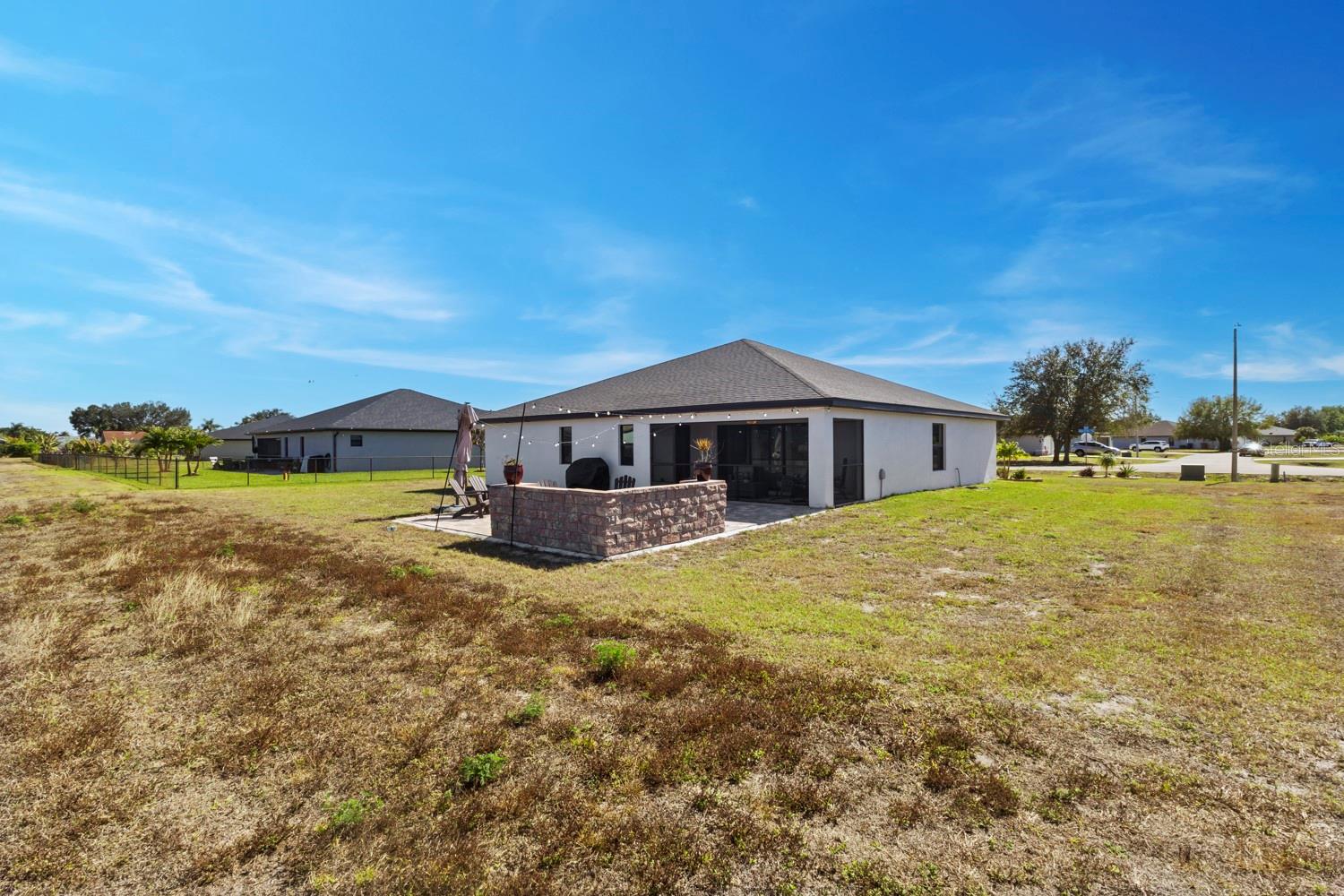 Modern efficiency meets premier outdoor living in this 2022-built Lehigh Acres home. Situated on an oversized lot, this 4-bedroom, 3-bathroom home offers 2,185 square feet of thoughtfully designed living space. Make a grand entrance through the elegant double glass door entryway into an airy, open layout featuring impact-resistant windows and doors throughout for ultimate storm safety and peace of mind. The interior is complemented by modern window treatments, ceiling fans and walk-in closets in every room. Tech-forward features include a pre-installed security camera system, Ring doorbell, and a solar panel system. The two-car garage functions as a complete workshop with a built-in workbench, overhead racks, and extensive shelving. Transition outside to a true backyard oasis featuring a screened-in lanai that leads to a 500-square-foot entertainer’s patio. This custom outdoor space is anchored by a firepit and unique tiered stadium seating, perfect for hosting gatherings. For added convenience, the exterior also features a paved walkway to a fenced garbage pad area. With low-maintenance landscaping and the structural benefits of newer construction, this home offers an incredible lifestyle in a peaceful, low-traffic setting.