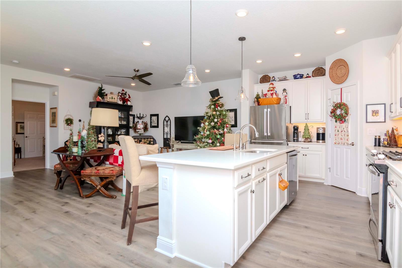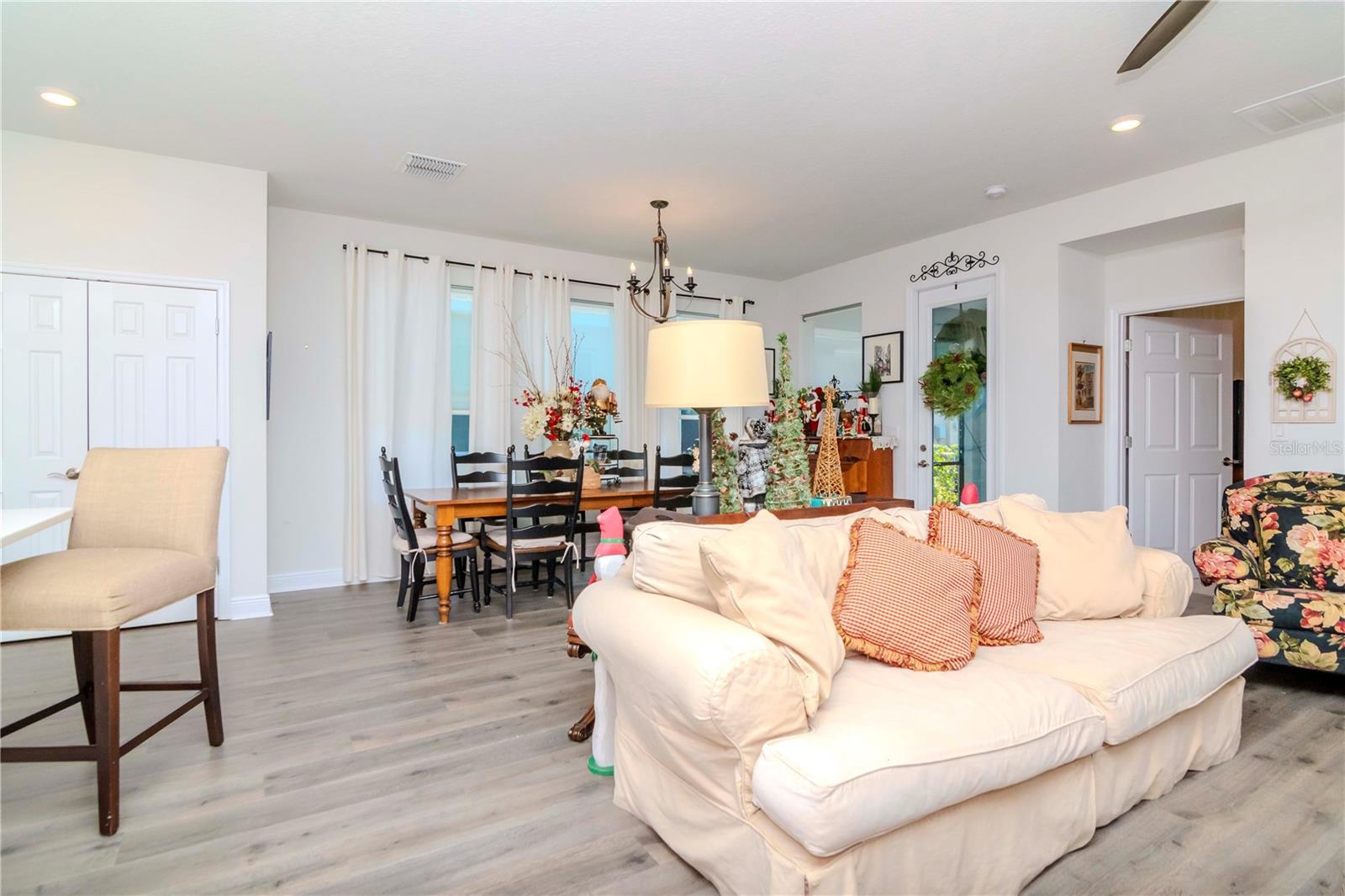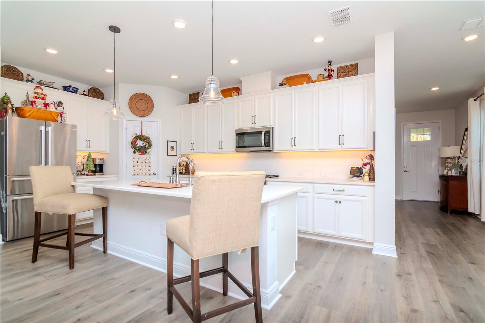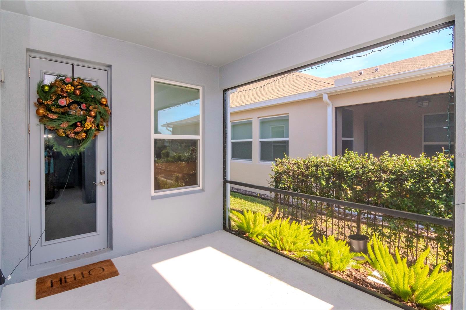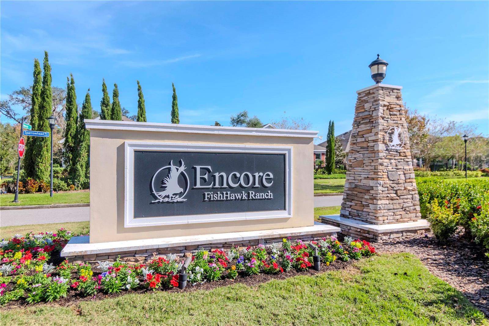 Beautiful move in ready 2 bedroom 2 bathroom villa in the gated 55 plus community of Encore at Fishhawk Ranch. This popular Mercury floorplan built by David Weekley Homes in 2021 is very spacious with over 1800 sq/ft of living space. Gourmet kitchen with quartz counters, center island, under cabinet lighting with dimmer, stainless steel appliances including Bosch 800 series fridge and whirlpool five burner gas range, and huge walk in pantry with 6 vertical levels of storage! Large master suite with trey ceiling, attached master bath with super sized full glass enclosure shower, double vanities, and huge walk in closet designed by Closets By Design. Split floorplan with bedroom 2 and bathroom 2 on opposite side of home. In addition to 2 bedrooms is an office/den/study, currently being used as a formal dining room. Luxury vinyl plank flooring throughout living, dining, kitchen area. Tiled bathrooms. Carpet only in bedrooms. Whole house water softener and reverse osmosis water at sink and fridge. Outside you'll find new landscaping front and back, sprinklers with rain sensor, expanded screened in lanai, brick paver driveway and sidewalk as well as 2 1/2 car oversized garage. Monthly HOA fee includes exterior maintenance, lawn care, cable, and internet! Encore features a beautiful resort style pool and spa, as well as basketball, pickleball, bocce ball and state of the art clubhouse with fitness center, card rooms, along with events and activities galore! As a resident of Encore, you will also have access to Fishhawk Ranch West amenities including the Lakehouse, community pool, fitness, and more!