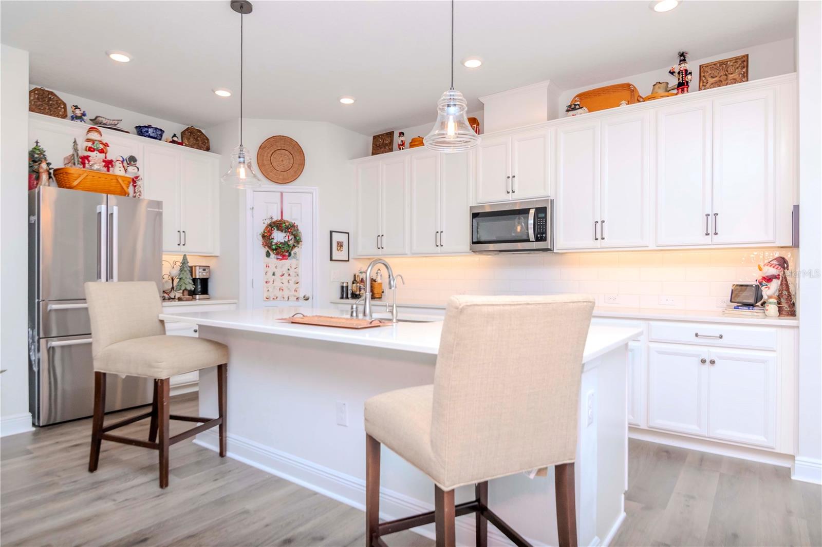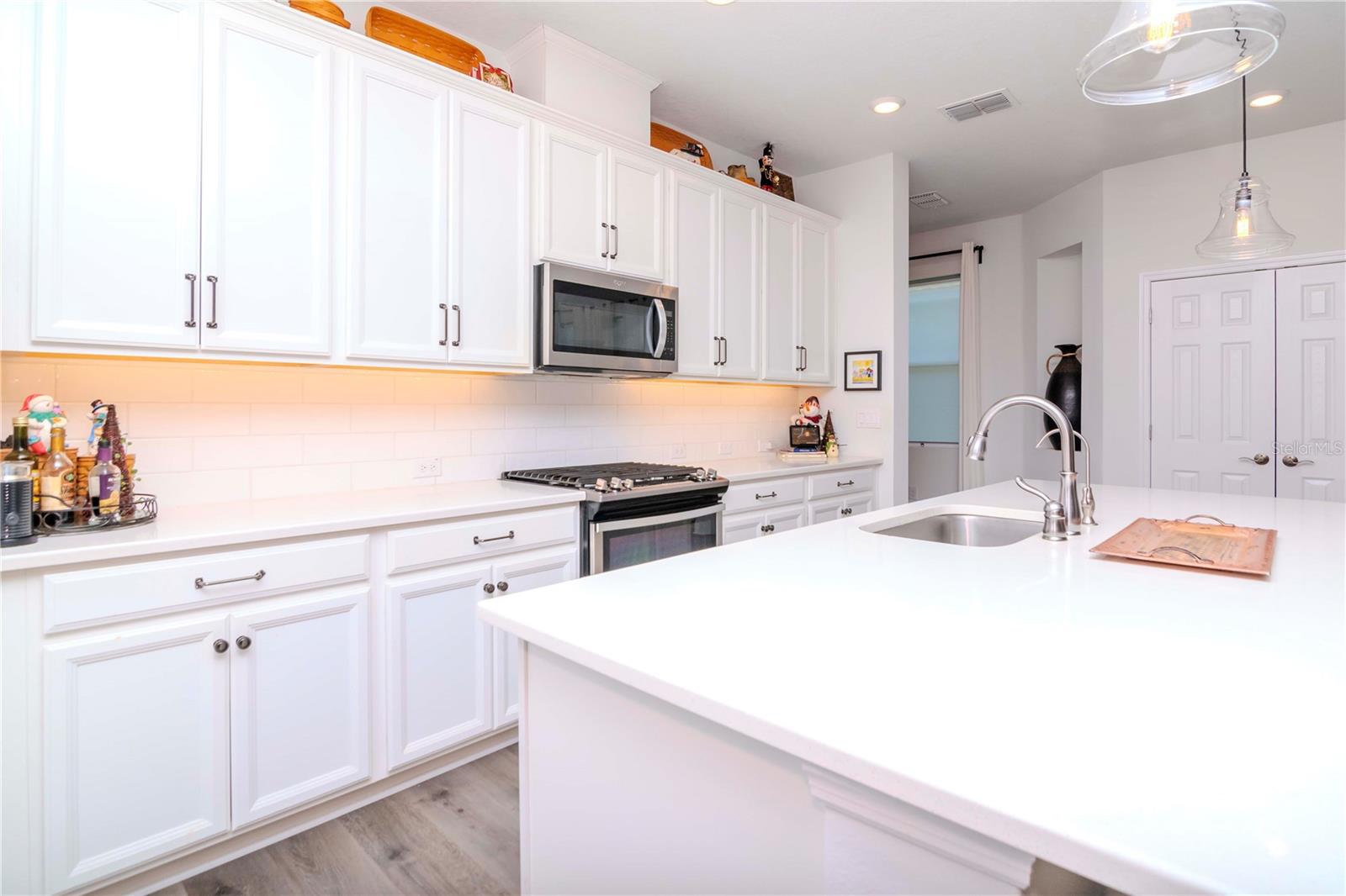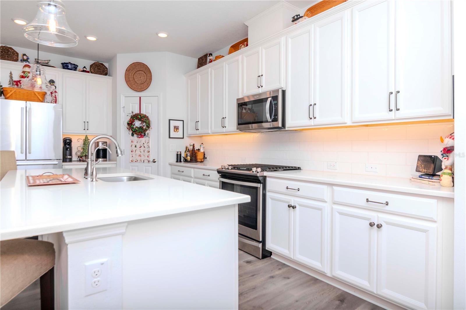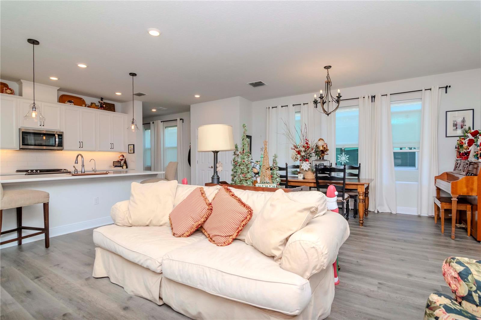 Beautiful move in ready 2 bedroom 2 bathroom villa in the gated 55 plus community of Encore at Fishhawk Ranch. This popular Mercury floorplan built by David Weekley Homes in 2021 is very spacious with over 1800 sq/ft of living space. Gourmet kitchen with quartz counters, center island, under cabinet lighting with dimmer, stainless steel appliances including Bosch 800 series fridge and whirlpool five burner gas range, and huge walk in pantry with 6 vertical levels of storage! Large master suite with trey ceiling, attached master bath with super sized full glass enclosure shower, double vanities, and huge walk in closet designed by Closets By Design. Split floorplan with bedroom 2 and bathroom 2 on opposite side of home. In addition to 2 bedrooms is an office/den/study, currently being used as a formal dining room. Luxury vinyl plank flooring throughout living, dining, kitchen area. Tiled bathrooms. Carpet only in bedrooms. Whole house water softener and reverse osmosis water at sink and fridge. Outside you'll find new landscaping front and back, sprinklers with rain sensor, expanded screened in lanai, brick paver driveway and sidewalk as well as 2 1/2 car oversized garage. Monthly HOA fee includes exterior maintenance, lawn care, cable, and internet! Encore features a beautiful resort style pool and spa, as well as basketball, pickleball, bocce ball and state of the art clubhouse with fitness center, card rooms, along with events and activities galore! As a resident of Encore, you will also have access to Fishhawk Ranch West amenities including the Lakehouse, community pool, fitness, and more!
