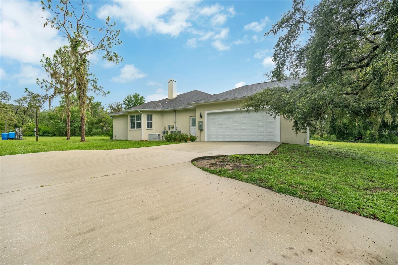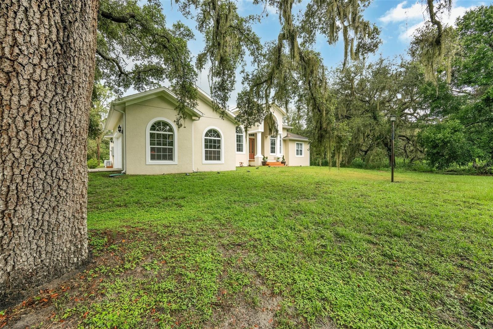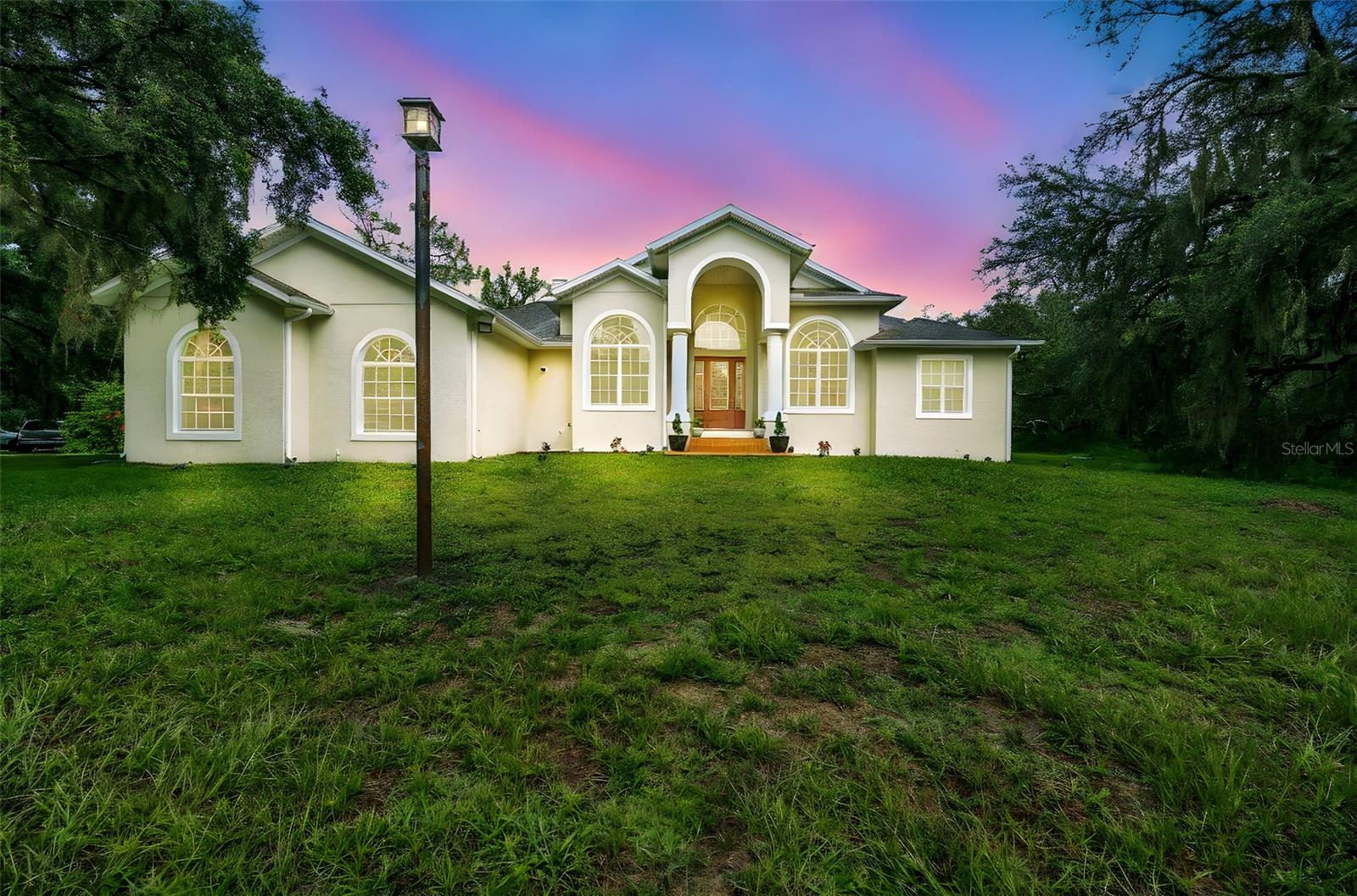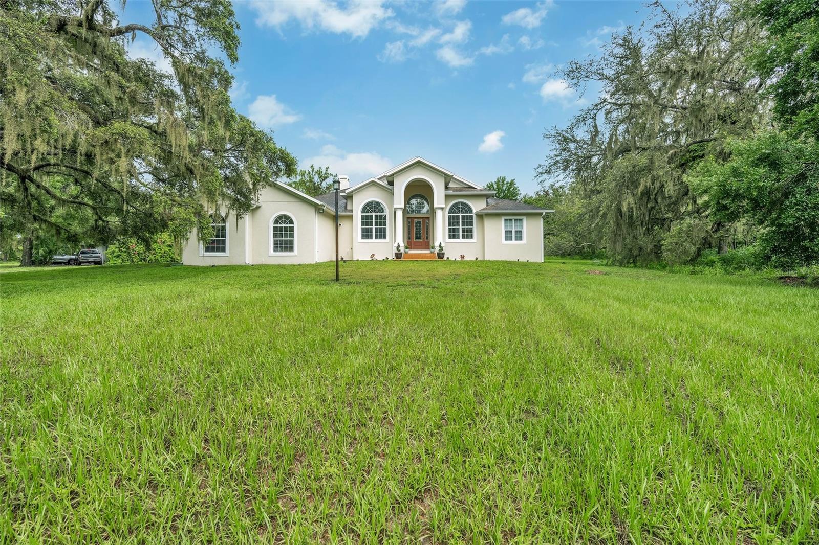 Welcome to this stunning single-story estate, ideally nestled on 6.93 acres of peaceful, tree-lined land, offering privacy, space, and timeless Florida charm. The striking exterior, with arched windows, a grand columned entry, and natural surroundings, sets the tone for the comfort and elegance within. Step inside to a bright, open-concept layout with tile flooring throughout, creating a seamless flow from room to room. The formal living room welcomes you with abundant natural light, vaulted ceilings, and a gas fireplace, perfect for cozy evenings. The heart of the home is a gourmet kitchen, featuring premium appliances including a Viking oven and Sub-Zero refrigerator, complemented by generous cabinetry and countertop space—ideal for both everyday cooking and entertaining. Retreat to the luxurious primary suite, which includes a double-sided gas fireplace that connects to a spa-inspired bathroom, creating a peaceful, retreat-like atmosphere. Across the home, you'll find three additional bedrooms and two full bathrooms, offering ideal separation for family or guests. A dedicated study and formal dining room provide functional, flexible living spaces for working from home and entertaining with ease. Step outside to enjoy the outdoor kitchen area, perfect for weekend grilling, al fresco dining, and hosting gatherings in your private, scenic backyard. The expansive 6.93-acre lot offers ample room for recreation, gardening, livestock, or future additions. With no HOA, you’ll enjoy true freedom and flexibility, and the ag-friendly zoning allows for livestock—bringing your country-living dreams to life without sacrificing convenience. Nature lovers will especially appreciate that this property is located less than 2 miles from Alderman Ford Conservation Park, where you can hike, fish, canoe, bird watch, picnic, and even camp. It’s the perfect extension of your own outdoor paradise, just minutes away. Located in a highly desirable area, the home is zoned for top-rated middle and high schools, making it an ideal fit for families seeking excellent education in a tranquil, upscale setting. With two gas fireplaces, tile flooring throughout, high-end kitchen finishes, a dedicated study, formal dining room, outdoor kitchen, and access to nearby nature preserves, this home offers a rare opportunity to own a luxurious yet practical estate on nearly 7 acres in a prime Florida location.