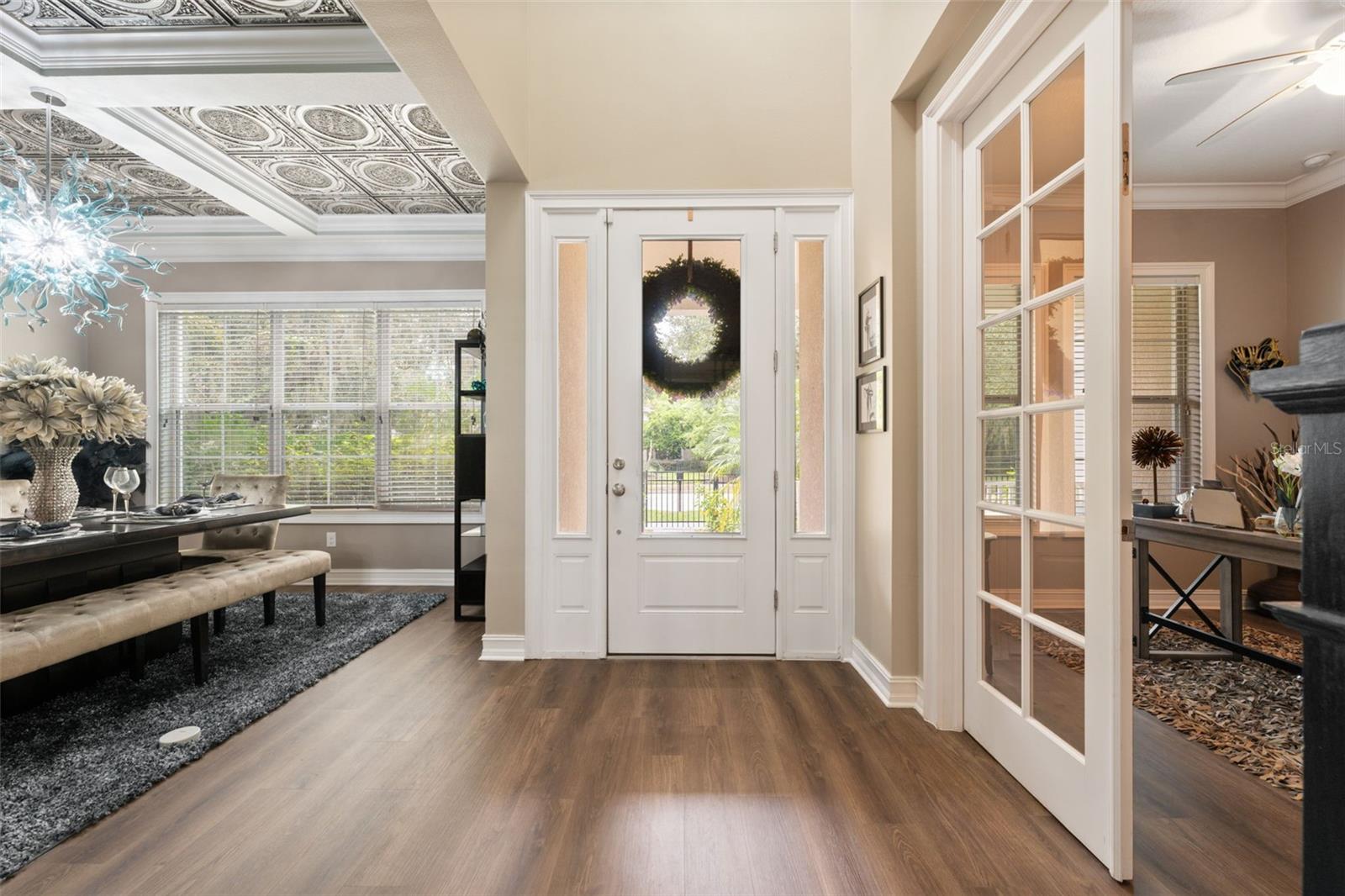 Welcome to this exquisite 6-bedroom, 4-bathroom home with over 3,600 sq. ft. of living space in the highly sought-after FishHawk Ranch community. This 2013 built residence has been meticulously maintained and thoughtfully updated with luxury finishes inside and out. The interior showcases brand new wood flooring, crown molding throughout, and elegant tray ceilings in the dining room and owner’s suite. A show-stopping Chihuly chandelier highlights the formal dining room. The gourmet kitchen is equipped with granite countertops, stainless steel appliances (all only 2 years old), gas cooktop, large island with breakfast bar, walk-in pantry, and butler’s pantry. The spacious great room opens to a screened lanai overlooking the fully fenced backyard and New Landscaping. The owner’s suite offers a spa-like bath with dual vanities, garden tub, walk-in shower, and a custom walk-in closet. Upstairs, a versatile bonus room can be enjoyed as a theater or adapted to your needs, along with a fifth bedroom, full bath, and private balcony. Additional upgrades include a continuous water heater (2025), Culligan water filtration system, and a 3-car garage with new door and motor (2024), featuring custom race deck flooring. Enjoy resort-style living with access to community pools, fitness centers, playgrounds, trails, tennis, and dog parks. Conveniently located near top-rated schools, shopping, dining, and commuter routes.