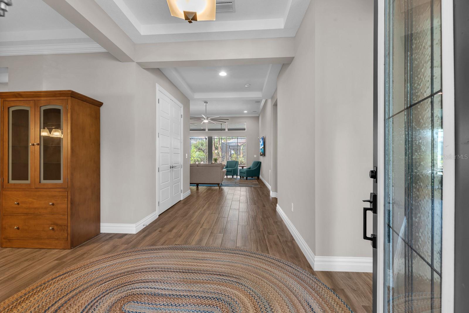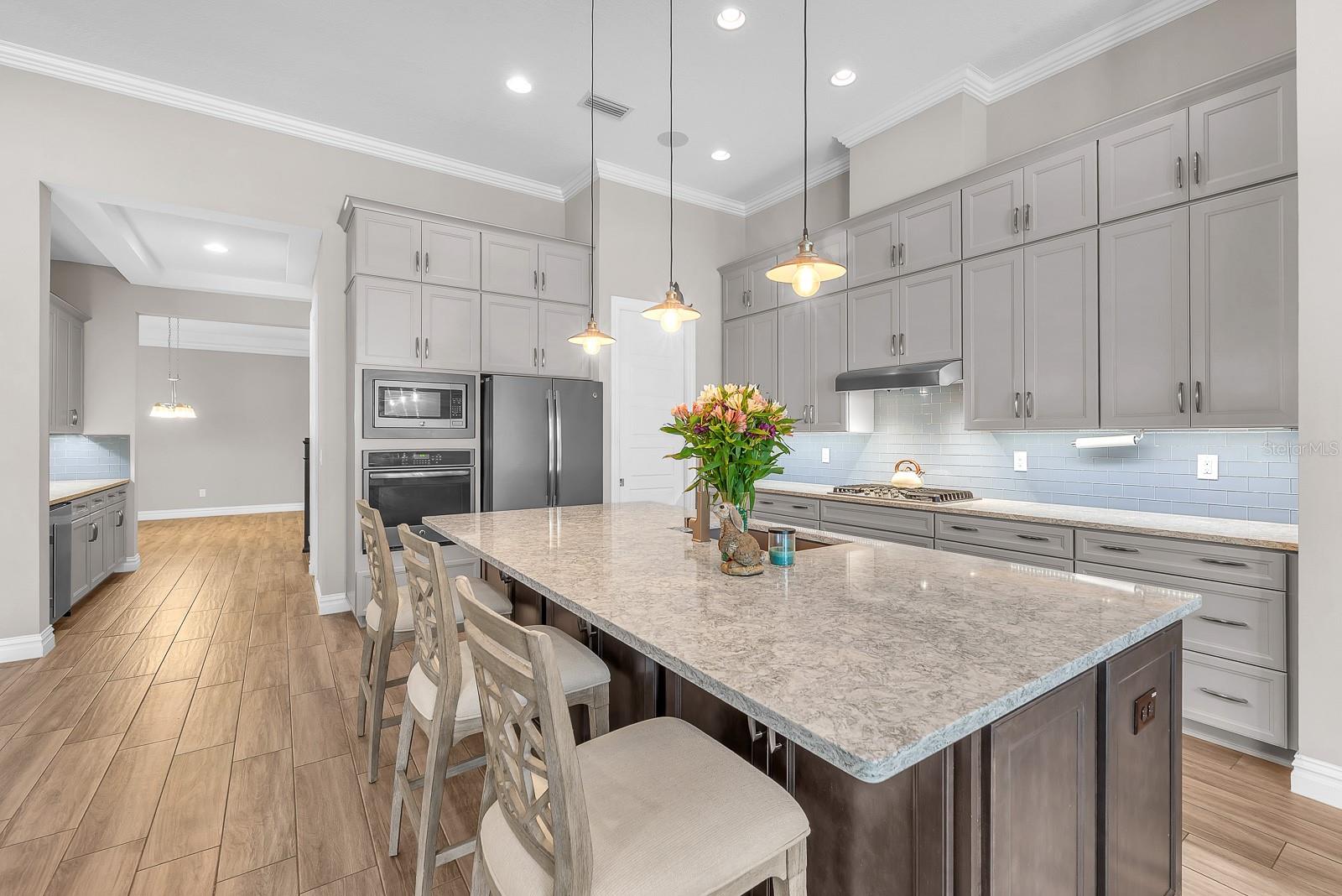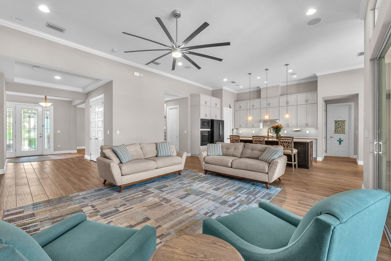 ** $235K is assumable at 2.25% as long as buyer meets VA requirements.** Welcome to this exceptional Cardel Wilshire II home located within the gated FishHawk Preserve community in Lithia—where generous space, thoughtful upgrades, and everyday functionality come together beautifully. Situated on a .30-acre homesite, this 4-bedroom, 4-bathroom pool home offers over 3,600 square feet of well-designed living space, complemented by a 4-car split garage (two front-facing and two side-facing), a pavered driveway and walkway leading to the entry. Step inside to find porcelain tile throughout the entire first floor, enhancing both style and durability. Just off the entryway, a formal dining room provides a dedicated space for gatherings, while a study/den behind glass French doors sits opposite—ideal for a home office or flex space. At the heart of the home, the kitchen is designed for both everyday living and entertaining, showcasing a large island, stone countertops, custom backsplash, gas cooktop, built-in oven and microwave, dishwasher, and refrigerator. A butler’s pantry with additional cabinetry and a large storage closet with deep shelving offers exceptional storage. The kitchen flows seamlessly into the dinette, which overlooks the outdoor living space, and into the living room featuring triple sliding glass doors that open fully to the lanai. Outdoor living is elevated with a screened saltwater pool and lanai, finished with Shell-Lock pavers, ceiling fans, and two access doors to the backyard. The space is designed for entertaining with perimeter party lighting, a gas-plumbed firepit, and a convenient pool bath (Bath 3) with direct outdoor access. Thoughtful touches include a radio-controlled dog door, and all pool equipment—including the cleaner and hoses—will convey. The split bedroom floor plan ensures privacy and flexibility. The primary suite is tucked away on one side of the home and features dual walk-in closets and an en-suite bath with a dual sink vanity, garden tub, and separate shower. Bedrooms 2 and 3 are located on the opposite side of the home, each with walk-in closets and separated by a built-in workstation/desk area. Upstairs, a large bonus room, fourth bedroom, and full bathroom create a versatile space ideal for guests, multi-generational living, or a private retreat. This home also offers modern efficiency and convenience, featuring solar panels for significant energy savings, two LG backup batteries to power essential systems during outages, and a surround sound system with speakers installed in the patio, garage, bonus room, study/den, living room, kitchen, and dining room, with components included. The laundry room includes cabinetry, washer, and dryer, while the garage provides three ceiling-mounted storage racks. Wide slat blinds are installed throughout, and gutters with downspouts lead to underground drainage conduits for added peace of mind. Located within Fishhawk Preserve and part of the highly sought-after Fishhawk Ranch Community, residents enjoy access to top-rated schools, parks, trails, and a variety of amenities, all while being conveniently close to shopping, dining, and major commuter routes. This home offers the perfect blend of comfort, efficiency, and elevated indoor-outdoor living—ready to welcome its next owner.