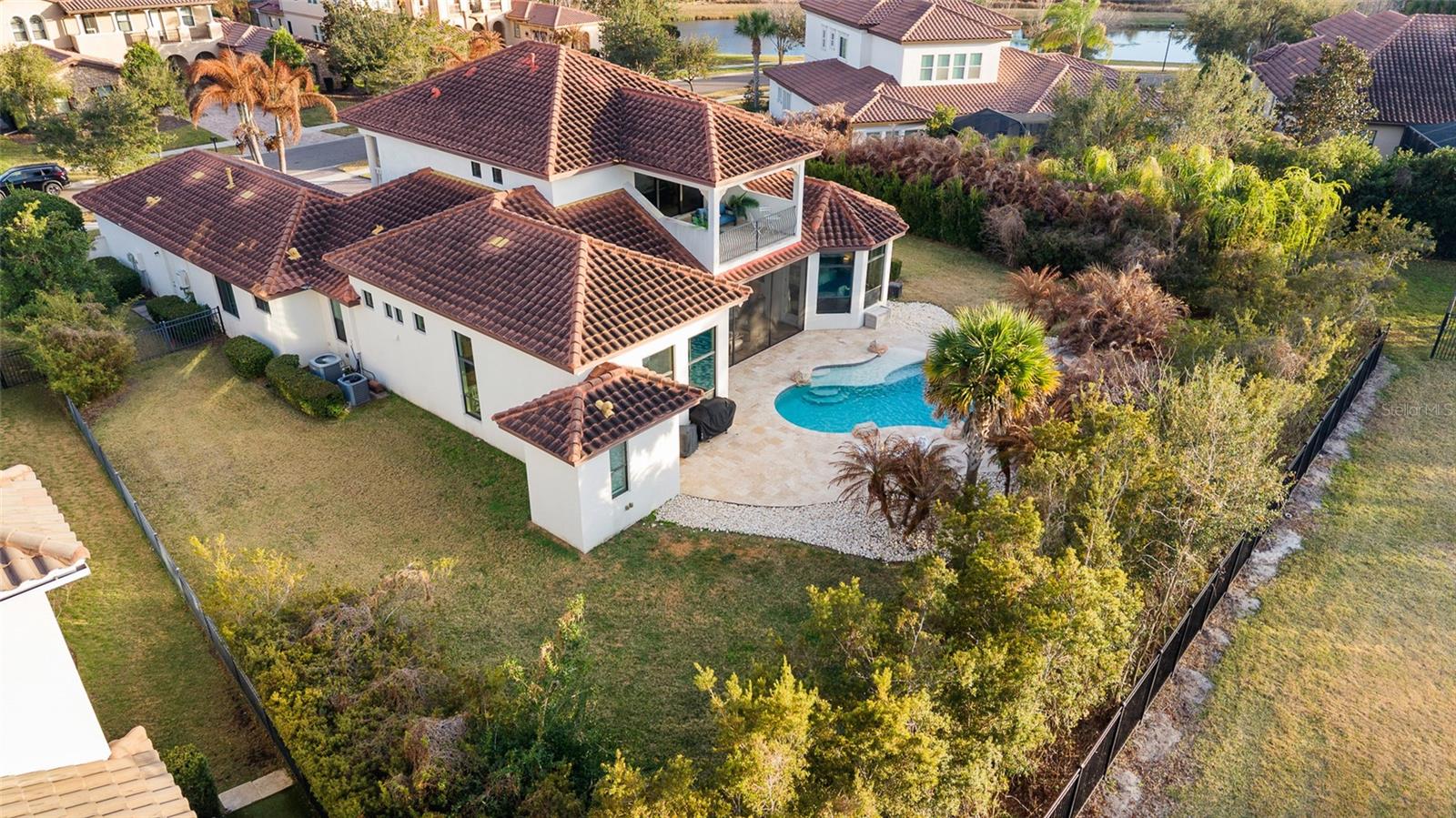EXTRAORDINARY LUXURY HOME! ARTHUR RUTENBERG BUILT! Located in the gated section of Chapman Crossing in the desirable FishHawk Ranch community, this Mediterranean style home includes 4 bedrooms, 4 and a half bathrooms, side entry 3-car garage, and sits on an oversized lot with brick driveway pavers and a tiled roof! Upon entry, an open foyer with a grand staircase awaits, with high ceilings adorned with crown molding and coffered/ tray areas, as well as plantation shutters and timeless wood floors throughout. Near the entryway is a private office, formal dining room, and formal living room with a fireplace, coffered ceiling, and triple sliders with a gorgeous view of the pool to see as soon as you walk inside the home. The stunning remodeled kitchen features a center island, breakfast bar, 42-in cabinets with crown molding & under cabinetry lighting, Modern GE stainless-steel appliances with a gas-cooktop & built-in oven, walk-in pantry, quartz countertops, and stunning tiled backsplash! There is ample natural light with windows surrounding the dining space, and a family room open to the kitchen, perfect for entertaining guests. The primary suite is on the first floor and separate from the remaining bedrooms, featuring hardwood floors, tray ceiling, tons of natural light, dual walk-in closets with custom built-ins, and a door leading to the lanai. The remodeled ensuite bathroom is gorgeous, having everything you could dream of, with double vanities, huge tiled walk-in shower, and a separate garden tub. The second bedroom is split on the first floor, ideal for a guest suite, with the remaining bedrooms upstairs both having their own bathrooms and each with a private balcony! Plus, an upstairs bonus room with a large UPSTAIRS BALCONY overlooking the pool. Step outside into your own private oasis, PRIVATE POOL WITH A STONE WATERFALL, covered lanai screened in for comfortable outdoor lounging, and a fenced in yard with plenty of space for endless possibilities. This home has it ALL! The FishHawk Ranch community is FILLED with scenic ponds and trails, resort style amenities, clubhouses, parks and playgrounds, and zoned for Fishhawk Creek Elementary, Randall Middle, and Newsome High School. ALL A-rated schools! Make this wonderful home your own! Call today to schedule a private viewing!