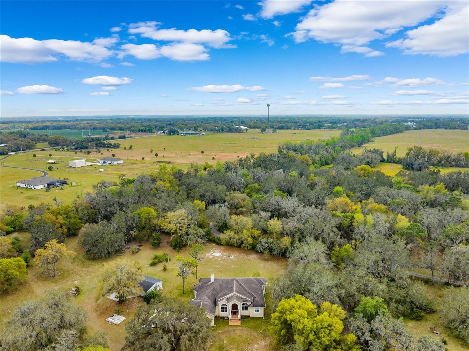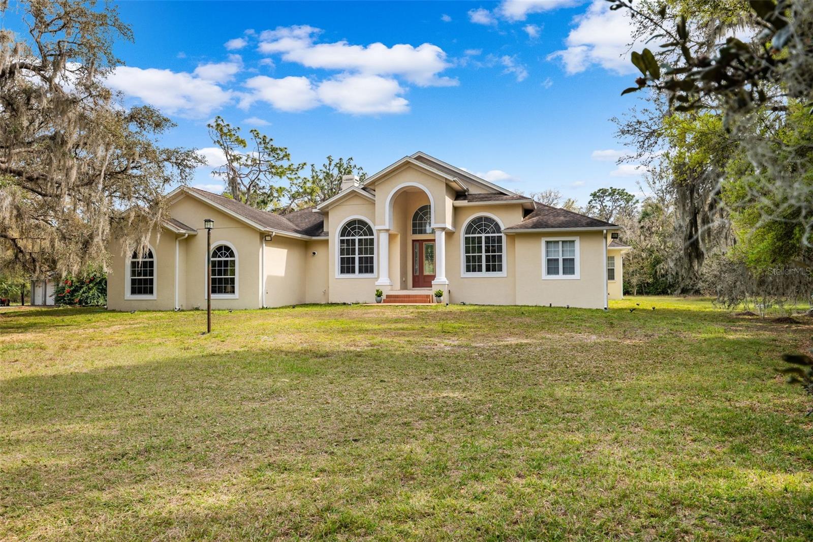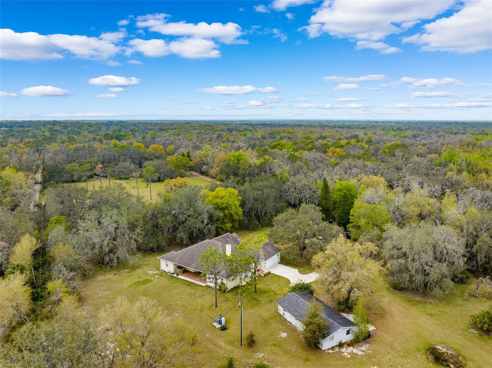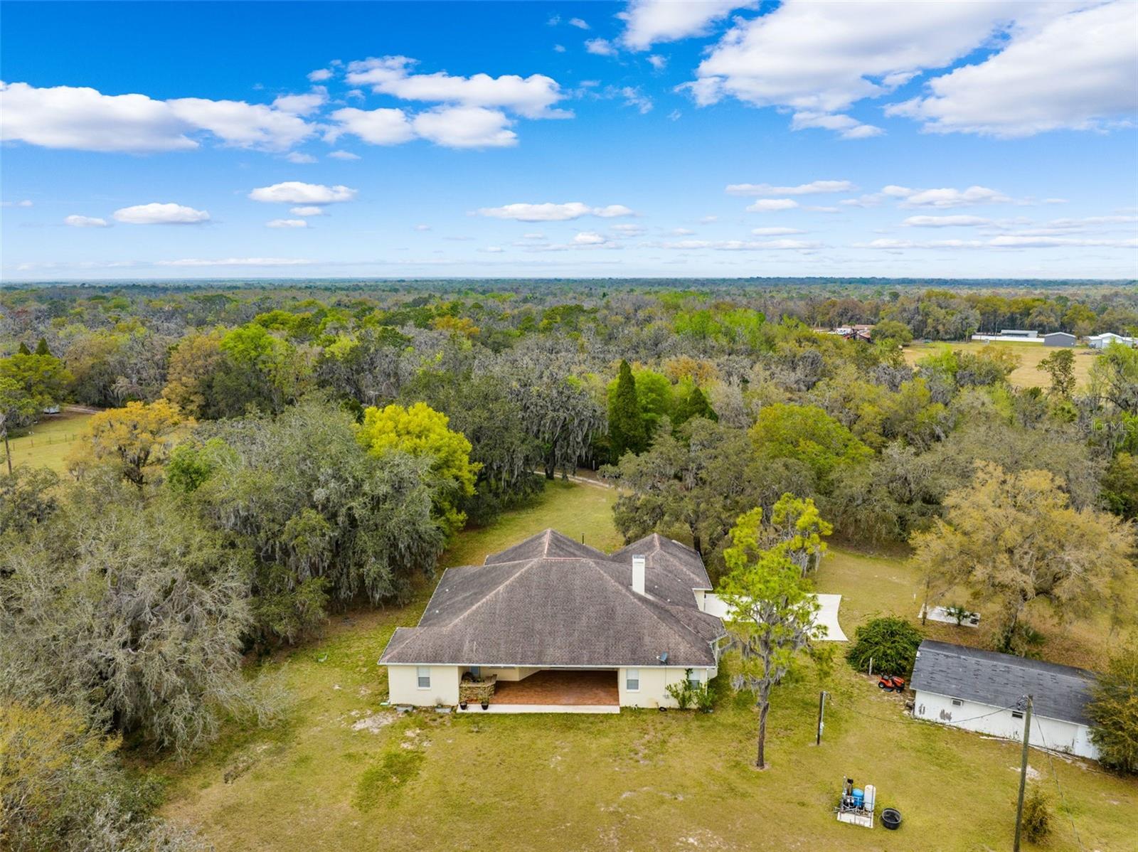 One or more photo(s) has been virtually staged.PRICE IMPROVEMENT!! Seller is also offering $10,000 toward buyer's closing costs! Welcome to your private COUNTRY LIVING dream home! This stunning 4-bedroom, 3-bathroom residence is situated on a sprawling 5.29 acres, offering the perfect blend of luxury and tranquility with plenty of space to create your own oasis. With no HOA or CDD fees, you have the freedom to enjoy your space without restrictions. Step inside and experience the grandeur of vaulted ceilings and an open concept floor plan. The heart of the home boasts a deluxe chef's kitchen with granite countertops, 42" solid wood cabinets, a separate island with a cooktop, and state-of-the-art VIKING stainless steel appliances. The kitchen seamlessly flows into both a formal dining room and a cozy breakfast nook with a beautiful view of the back yard. The open floor plan is ideal for entertaining, featuring a grand fireplace with a custom stone wall and custom lighting creating a warm and inviting atmosphere. The spacious living room is bathed in natural light, thanks to a 3-panel cascading sliding door. The primary bedroom retreat features a huge walk-in closet with built-in shelving, double vanity counters, a separate shower and a relaxing garden tub. A sliding glass door leads from the primary bedroom to your own private patio. Step outside to the covered patio, complete with an outdoor kitchen and grill – perfect for family gatherings, dining and entertaining. The remaining three bedrooms are situated on the other side of the home for ultimate privacy. Off the main living space sits an in-home office/den space. The property also includes a two-car attached garage as well as a separate, detached work shed with a three stall garage. Zoned agriculture-residential, this property includes a tranquil creek along the rear of the property. The property is completely fenced-in pasture land, surrounded by mature trees and lots of wildlife. For peace of mind, your new home includes a backup generator to power the entire home and two propane tanks. Enjoy the best of both worlds with the peaceful country surroundings while still being in close proximity to Tampa and award-winning local beaches. Don't miss out on the opportunity to call this exceptional property home!