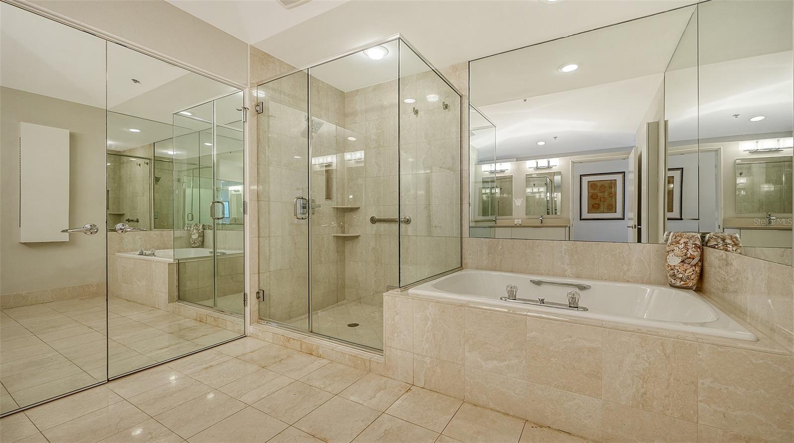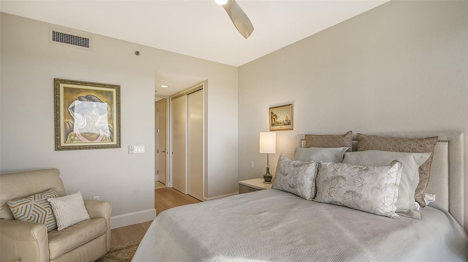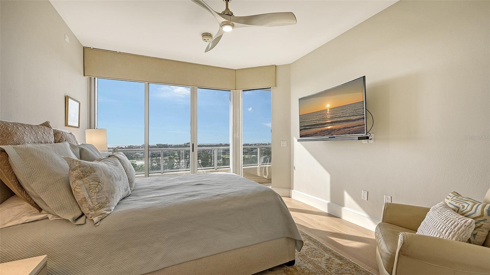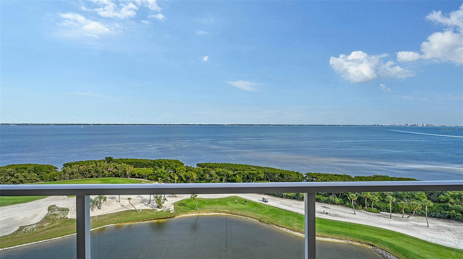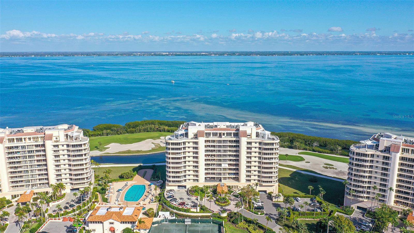 New opportunity awaits! Captivating water views from EVERY room! Be wowed by sunrises over Sarasota Bay city skyline and direct sunsets setting on the Gulf of Mexico. This 3BR/3 full BATH, 8th-floor Grand Bay residence highlights 2 oversized 11x23 private terraces to enjoy the views. Luxury begins upon entering your private elevator foyer with glass contemporary doors opening to water views from every room. Impressive 2’ x 4’ light porcelain tile floors grace the main living areas. Discover versatility with a den that doubles as an occasional guest room, providing privacy with its doors that separate it from the formal dining room. A thoughtful conversion has turned the half-bath into a built-in office area adding functionality. The updated gourmet kitchen is a masterpiece, featuring low-profile cabinetry, stainless steel appliances, under-cabinet lighting, solid surface countertops, a breakfast bar and an adjacent eat-in area with walls of glass framing breathtaking views. The spacious primary suite is a haven of tranquility, with white oak floors,2 walk-in closets and walls of glass offering beautiful bay & city views. The primary suite bathroom is complete with a spa tub, glass-enclosed shower, and dual vanities. The 2nd bedroom offers floor-to-ceiling glass windows/sliders with stunning sunset views, complemented by white oak floors and an en-suite bath. Step outside onto the expansive, private, and covered terraces, a wonderful setting for quiet relaxation or entertaining guests with cocktails toasting the sunset. With special assessments paid in full, this residence is more than an elegant home, it's an immediate invitation to savor secure waterfront living. A prime 1st level parking space another distinctive feature. Residents of Grand Bay are invited to enjoy an exciting host of amenities, including 24/7 guard gates, a clubhouse, two community pools and spas, a large fitness center with saunas, Har-Tru tennis courts and all the conveniences of Bay Isles, with miles of walking paths and membership to the private, gated Bay Isles Beach Club on the Gulf of Mexico with locker rooms, barbecues, volleyball nets, covered picnic areas and an expanse of sandy white beach shared only with other Bay Isles owners. Your best Bay & Beach lifestyle awaits!