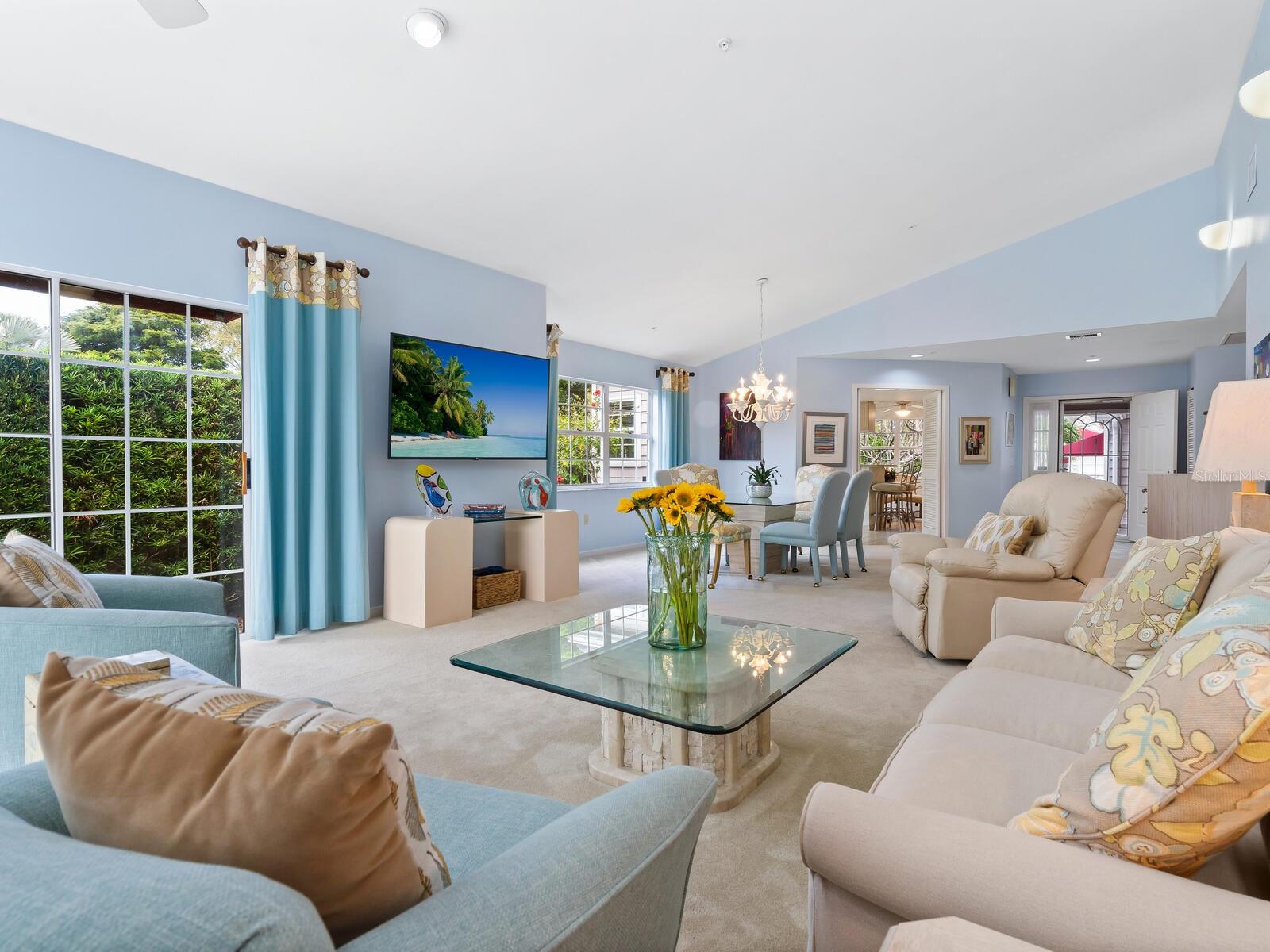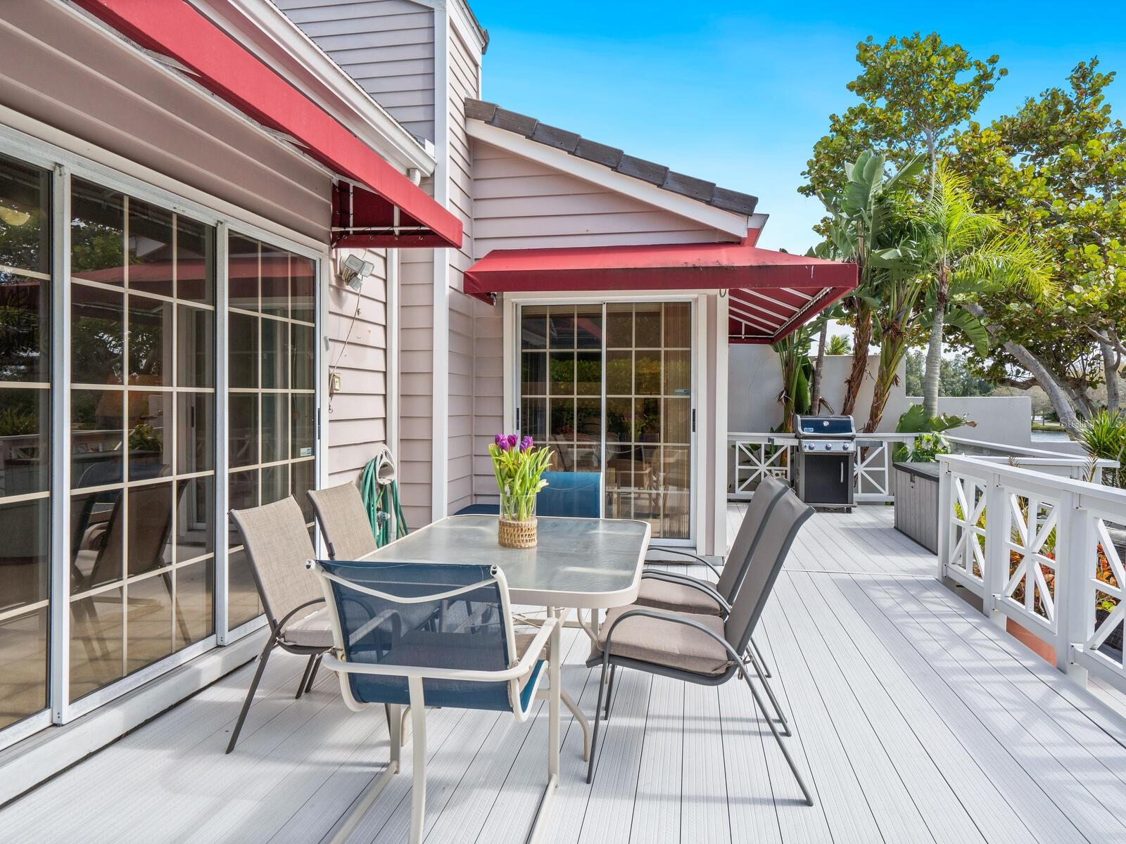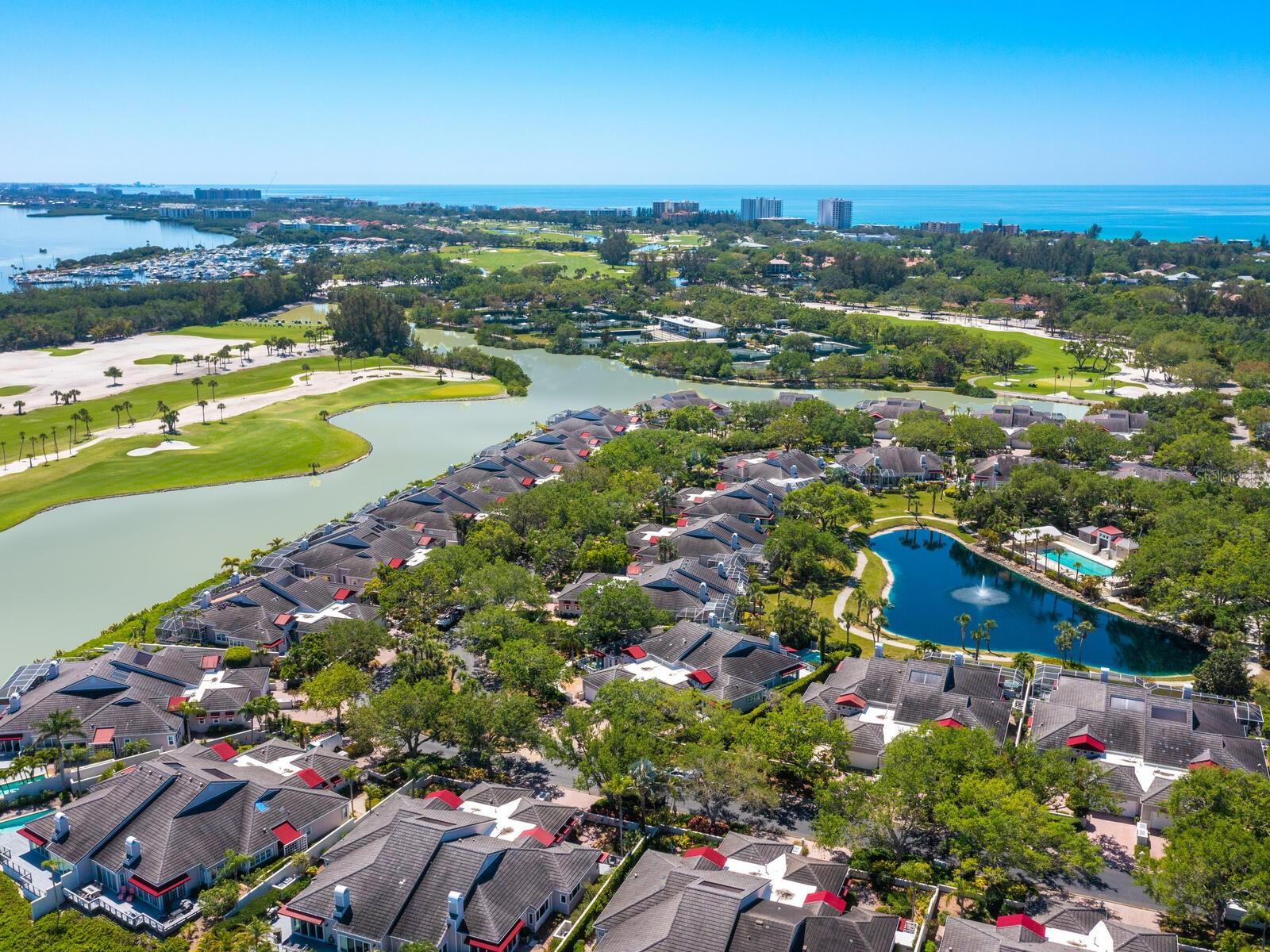Welcome to the exclusive enclave of Winding Oaks, nestled within the prestigious Bay Isles community on Longboat Key. This meticulously maintained and furnished 2-bedroom, 2-bath end-unit villa offers a serene retreat with captivating views of the lagoon and the renowned Harbourside golf course at the Longboat Key Club. As the builder's model, this villa boasts significant upgrades, including a multi-level deck overlooking the lake, a private pool, and an inground spa. The interior is bathed in natural light, with soaring ceilings and a great room featuring stacking sliding doors that seamlessly connect to the deck. The spacious kitchen, adorned with a wall of windows overlooking the garden, includes a breakfast bar and a charming dinette with views of the front courtyard. The enclosure of the lanai off the dinette creates an ideal office space with a serene garden view. The expansive primary bedroom is a haven of tranquility, with three closets, including a large walk-in, multiple sliding glass doors leading to the rear deck and pool, and an ensuite bathroom with a walk-in shower, soaking tub, dual sinks, and a private commode. The guest bedroom, located at the front of the home for added privacy, features an en-suite bathroom. Step outside to discover a garden oasis, with a beautifully landscaped courtyard in the front and a stunning private tropical sanctuary in the back. Winding Oaks is a pet-friendly, low-maintenance community of just 56 villa-style residences, offering premier amenities such as a community pool, a guard-gated entry, and access to the Bay Isles Beach Club, which features parking, covered seating, bathrooms and lockers, picnic table pavilions, and of course, the beach. For those who enjoy an active lifestyle, the prestigious Longboat Key Club is closeby, offering golf, tennis, pickleball, fine dining, and boating. Island living doesn't get any better than this, so don't miss out on the opportunity to experience the epitome of coastal luxury at Winding Oaks.