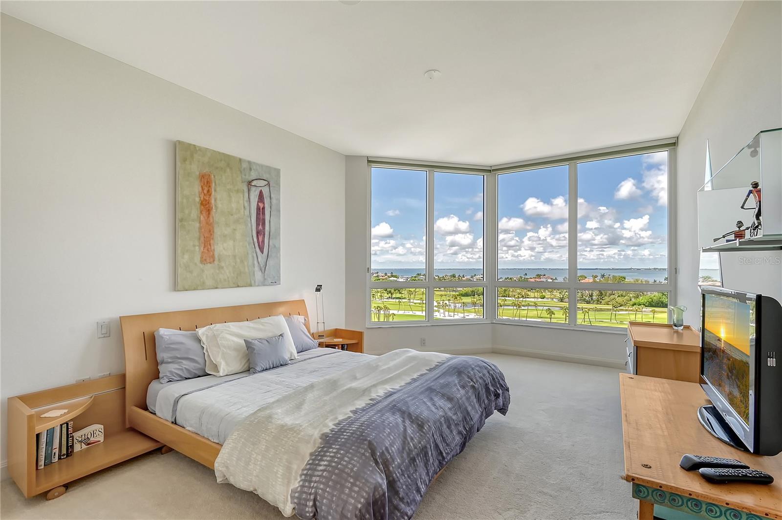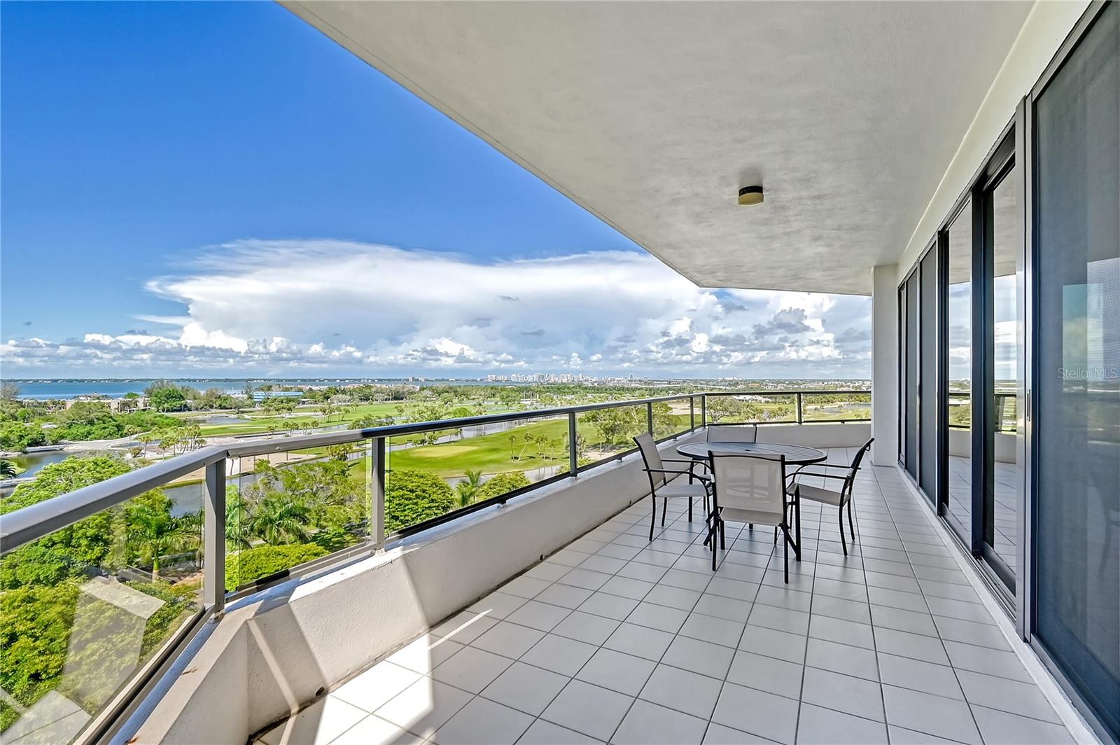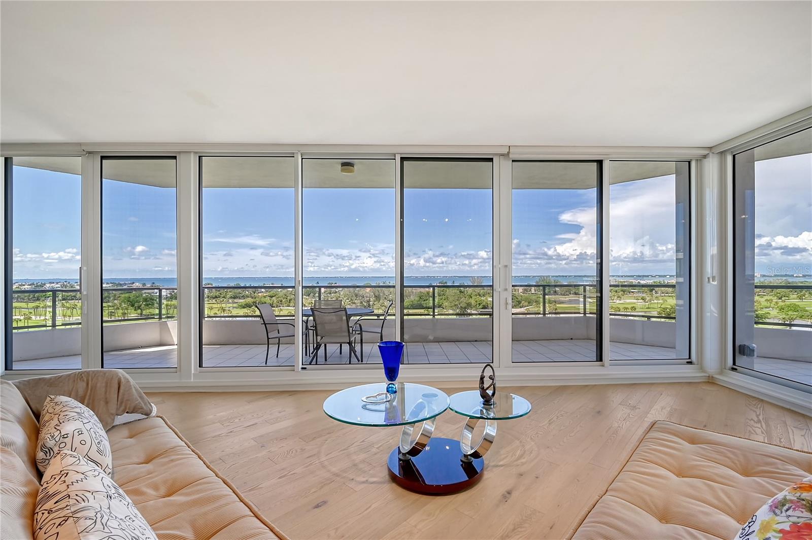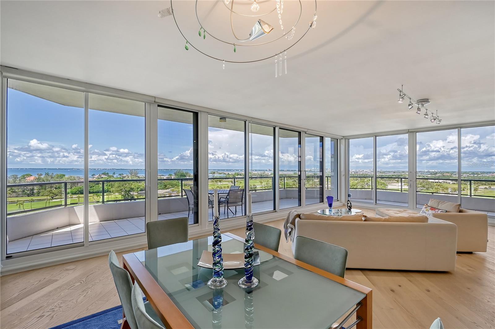 Perched on the eighth floor of Building III in a tranquil south corner location, this sun-drenched Sanctuary residence offers breathtaking panoramic views of Sarasota Bay and downtown’s skyline through newly installed (2023) impact glass sliders and windows with Hunter Douglas window treatments. Spanning nearly 2,400 square feet, the open concept interior awaits your personal touch to transform it into your ideal island retreat. Enjoy morning sunrises from the wraparound east terrace accessed through walls of impact glass sliders. Enter through double doors into a spacious foyer leading to a 30’ living/dining room with expansive floor-to-ceiling glass walls, beautiful wood flooring, and panoramic views that add to its sunny ambiance. The light-filled eat-in kitchen boasts an island, built-in ovens, pantry, and a charming dining nook surrounded by bay windows with terrace access. The secluded master retreat features its own bay terrace access, his/her walk-in closet with plenty of built-ins, and an en-suite marble bathroom with a water closet. A guest suite and den, easily convertible into a third bedroom, complete the split plan layout for optimal privacy. Included with this special residence is one under-building parking space and additional owner’s storage. Life at The Sanctuary, within the gated Longboat Key Club community, offers a resort-style lifestyle. Residents enjoy amenities such as a Gulfside swimming pool with cabanas, extensive sundeck, outdoor bar, heated pool and spa, tennis courts, fitness center, clubhouse activities, and a boardwalk to deeded beach access. The community also features a 24-hour manned guard gate and on-site management, ensuring security and convenience. For an even greater level of indulgence and relaxation, consider becoming a member of the renowned Longboat Key Club, available for purchase separately. This prestigious club offers access to world-class amenities, including immaculate golf courses, top-notch tennis facilities, a resort-style pool deck, a fully equipped fitness center, rejuvenating spa services, an array of exquisite dining options, and first-rate marina facilities. Live surrounded by luxury and natural beauty at The Sanctuary.