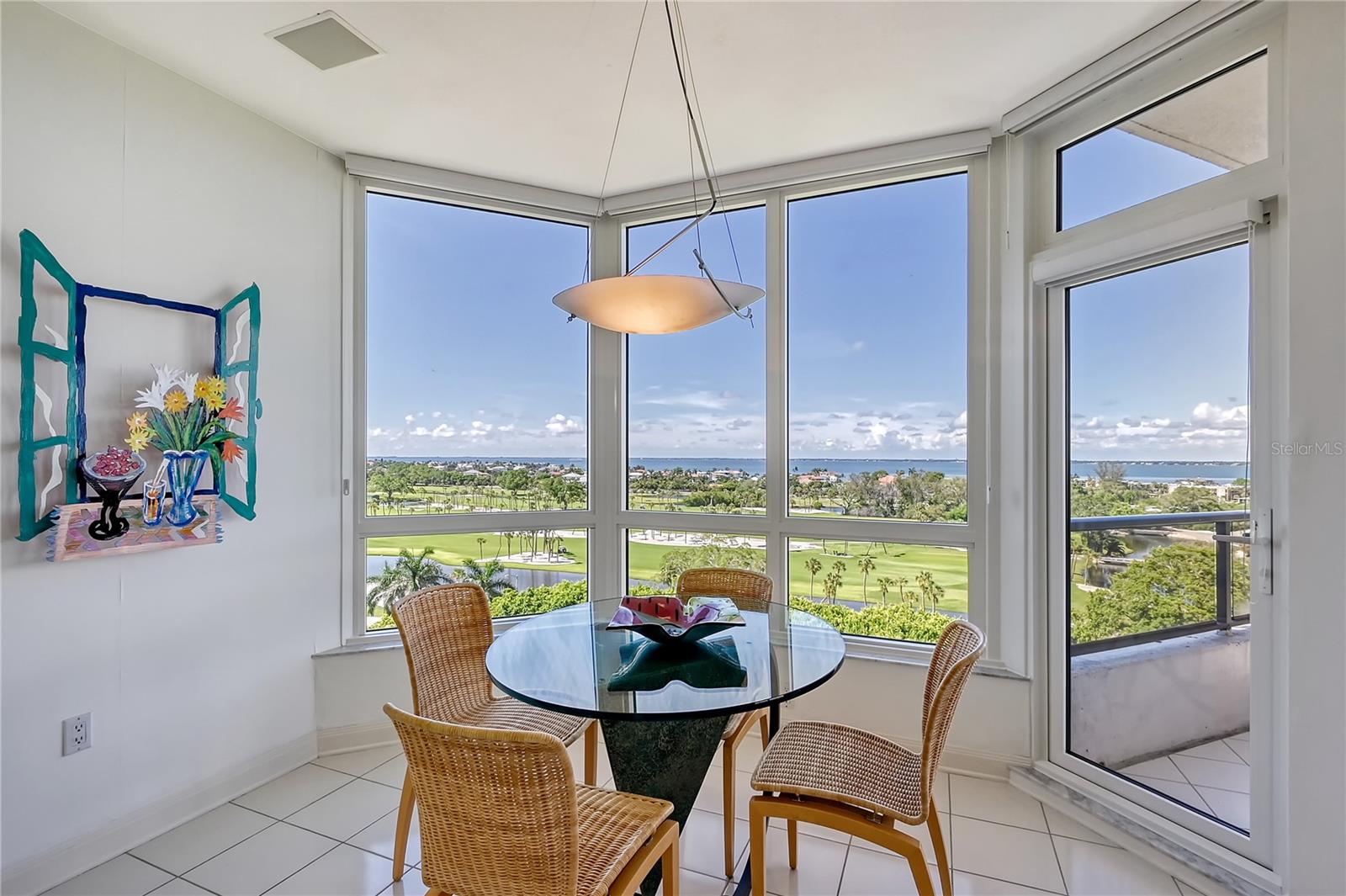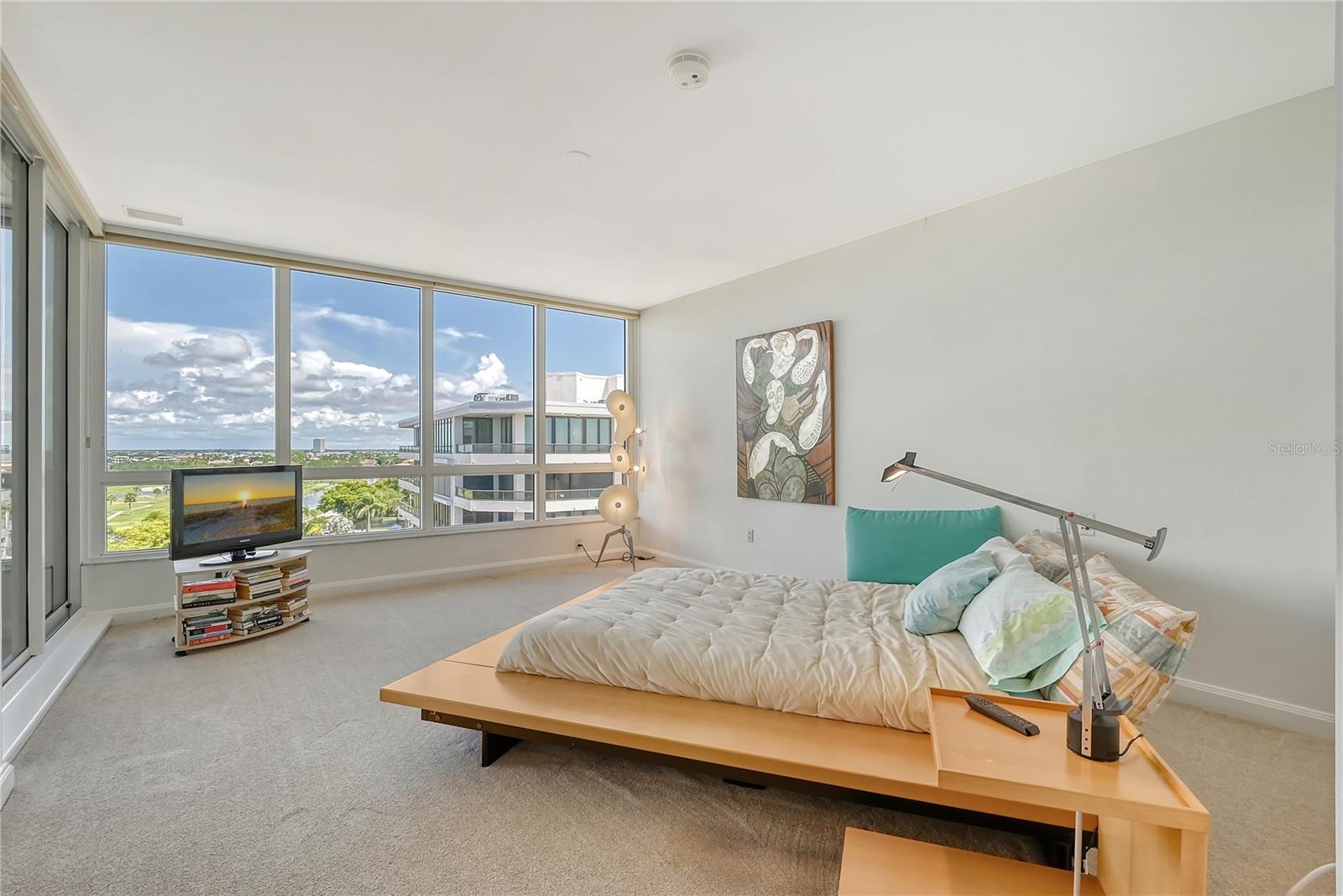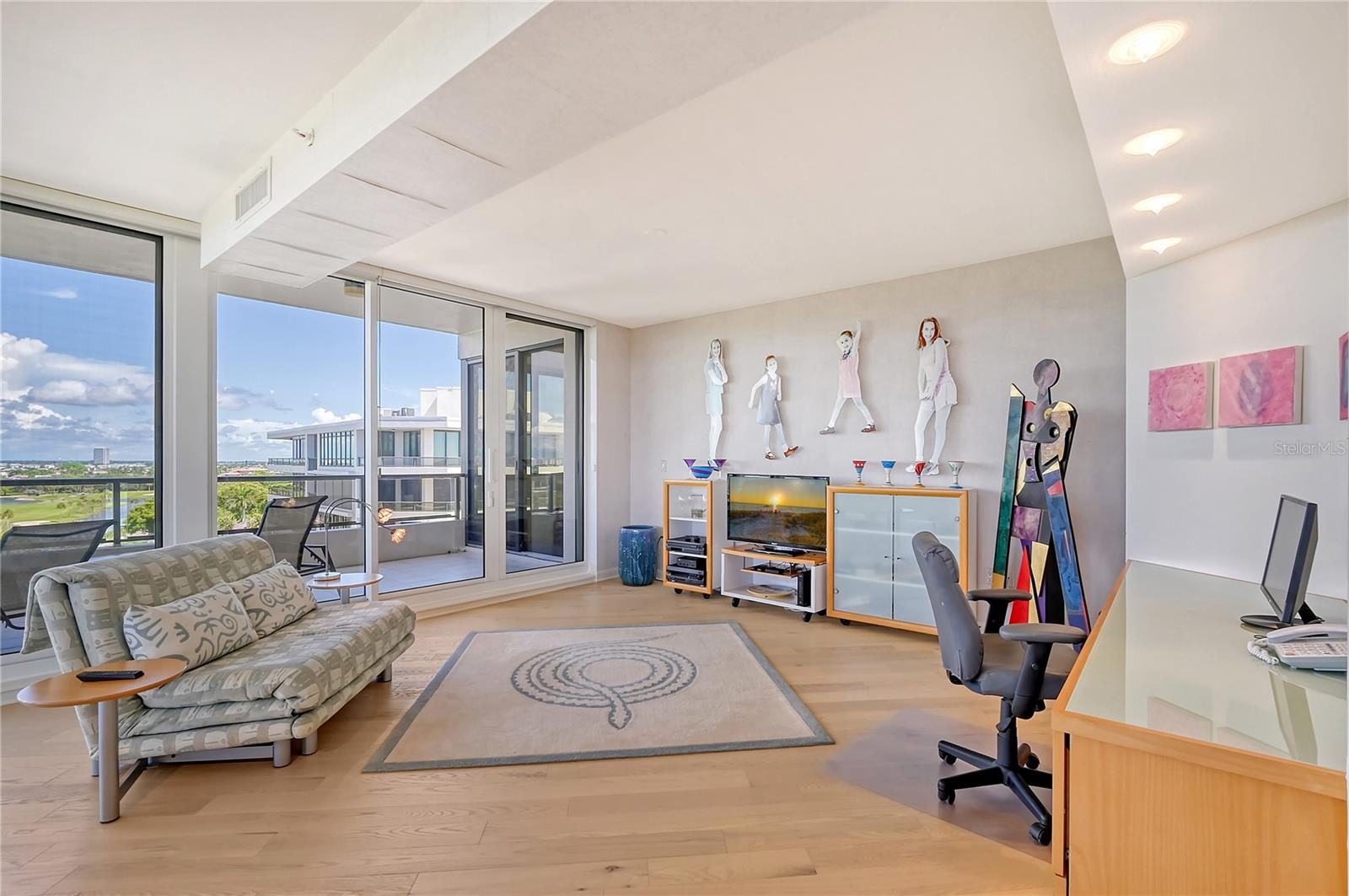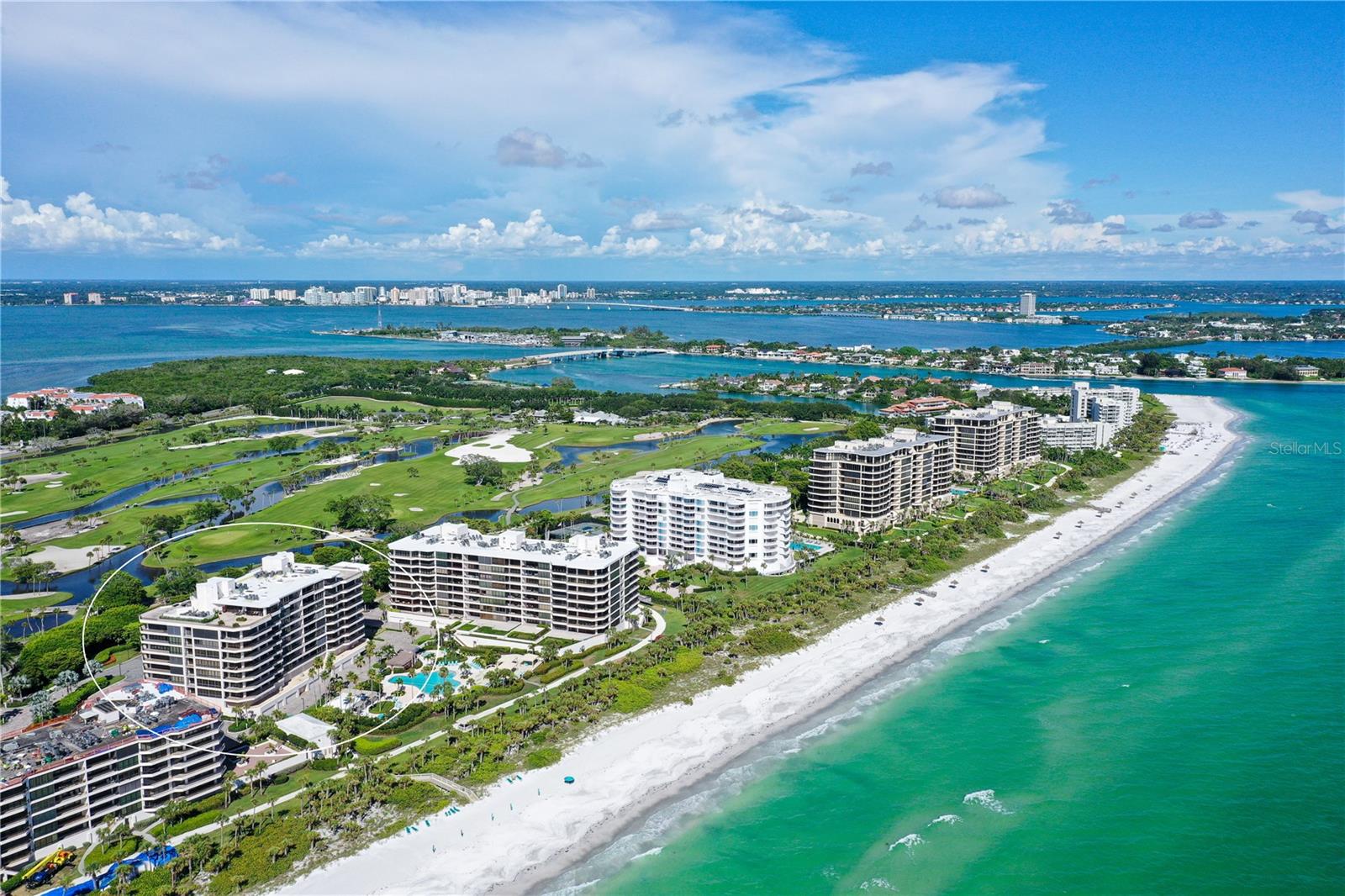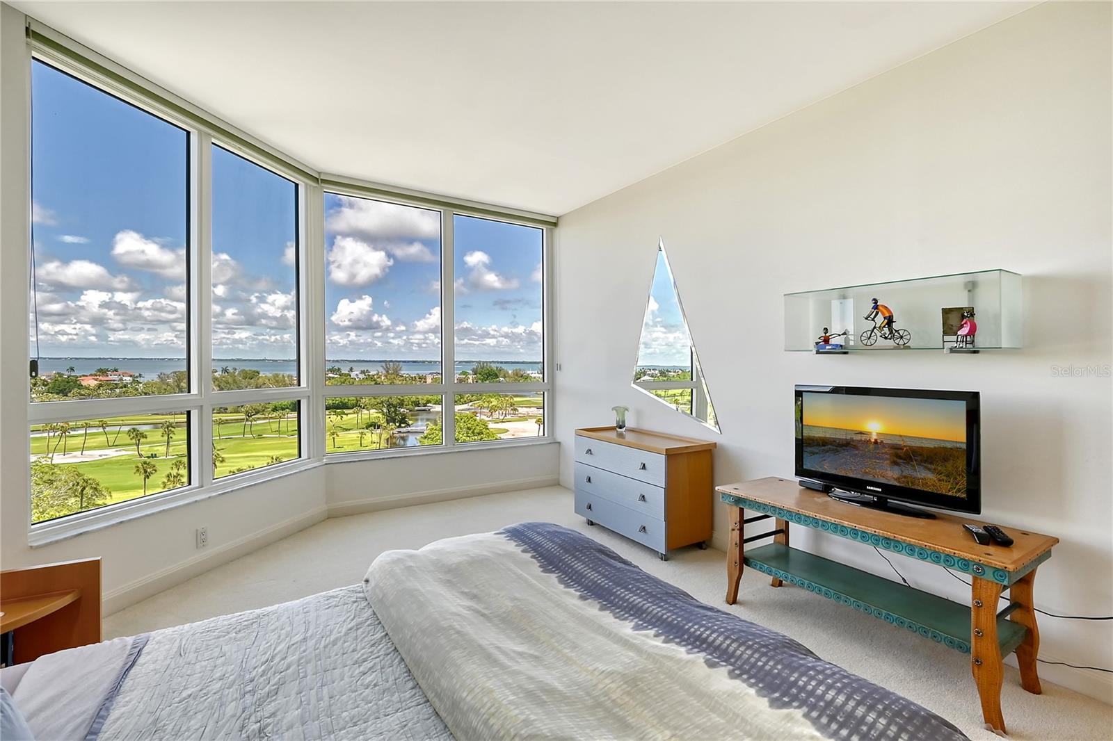 Perched on the eighth floor of Building III in a tranquil south corner location, this sun-drenched Sanctuary residence offers breathtaking panoramic views of Sarasota Bay and downtown’s skyline through newly installed (2023) impact glass sliders and windows with Hunter Douglas window treatments. Spanning nearly 2,400 square feet, the open concept interior awaits your personal touch to transform it into your ideal island retreat. Enjoy morning sunrises from the wraparound east terrace accessed through walls of impact glass sliders. Enter through double doors into a spacious foyer leading to a 30’ living/dining room with expansive floor-to-ceiling glass walls, beautiful wood flooring, and panoramic views that add to its sunny ambiance. The light-filled eat-in kitchen boasts an island, built-in ovens, pantry, and a charming dining nook surrounded by bay windows with terrace access. The secluded master retreat features its own bay terrace access, his/her walk-in closet with plenty of built-ins, and an en-suite marble bathroom with a water closet. A guest suite and den, easily convertible into a third bedroom, complete the split plan layout for optimal privacy. Included with this special residence is one under-building parking space and additional owner’s storage. Life at The Sanctuary, within the gated Longboat Key Club community, offers a resort-style lifestyle. Residents enjoy amenities such as a Gulfside swimming pool with cabanas, extensive sundeck, outdoor bar, heated pool and spa, tennis courts, fitness center, clubhouse activities, and a boardwalk to deeded beach access. The community also features a 24-hour manned guard gate and on-site management, ensuring security and convenience. For an even greater level of indulgence and relaxation, consider becoming a member of the renowned Longboat Key Club, available for purchase separately. This prestigious club offers access to world-class amenities, including immaculate golf courses, top-notch tennis facilities, a resort-style pool deck, a fully equipped fitness center, rejuvenating spa services, an array of exquisite dining options, and first-rate marina facilities. Live surrounded by luxury and natural beauty at The Sanctuary.