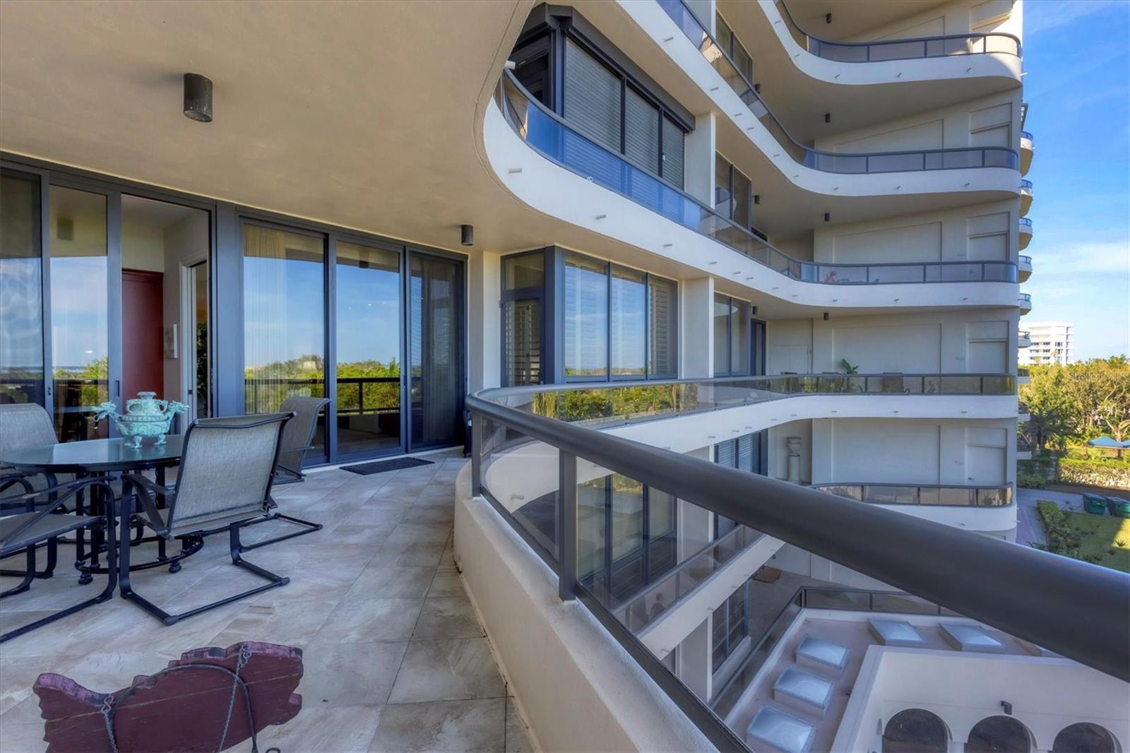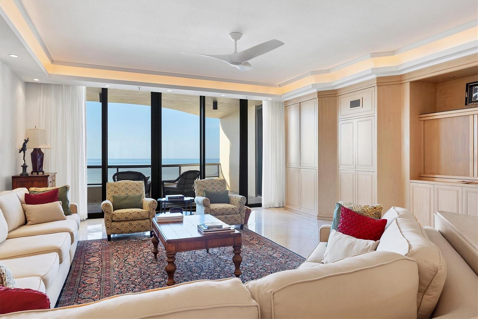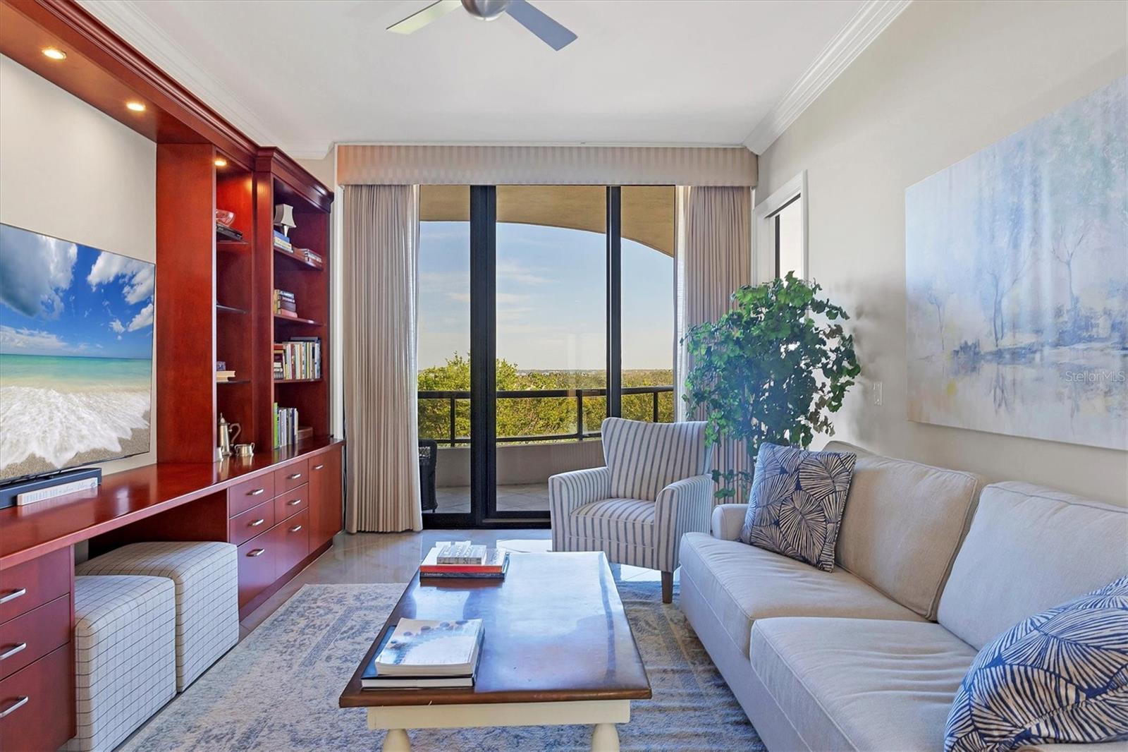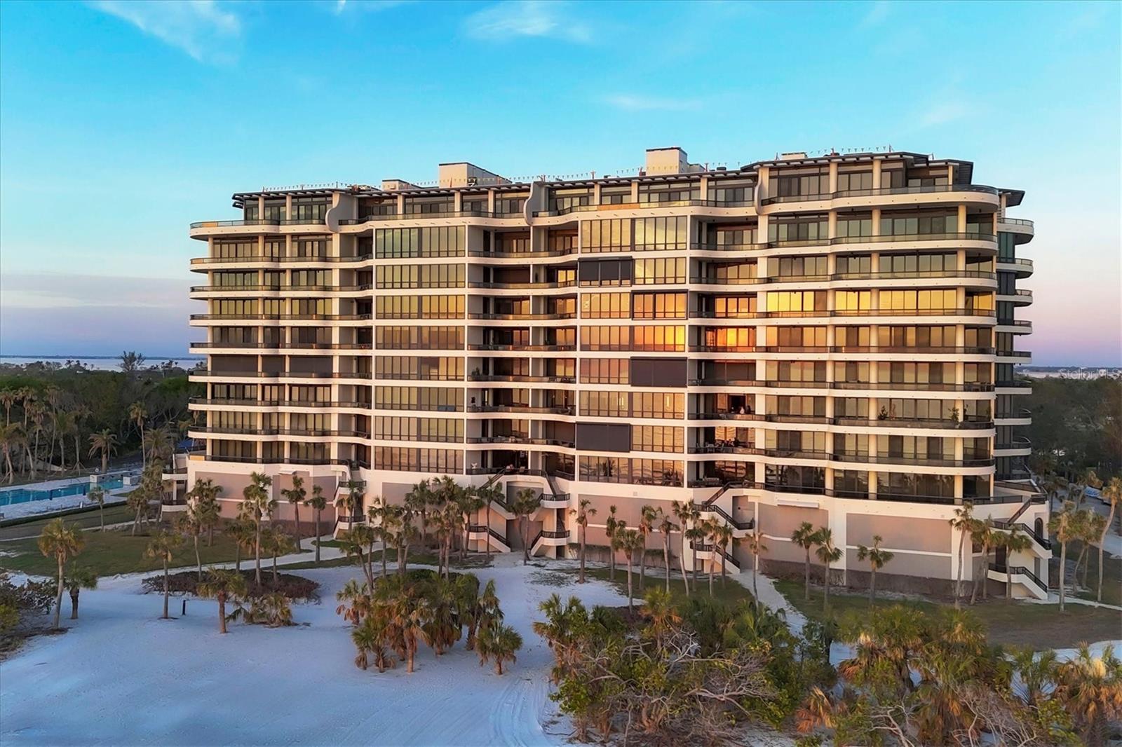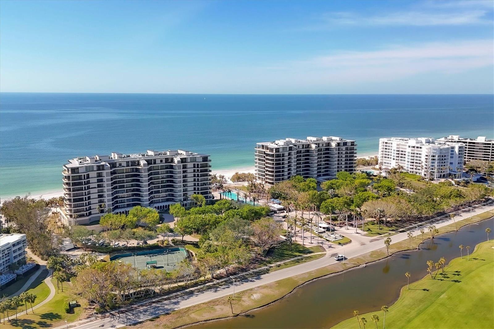Behind the double-gated security of the Longboat Key Club, this fourth-floor residence in the iconic L’Ambiance condominium offers an unmatched blend of luxury, privacy and breathtaking Gulf of Mexico views. Spanning two bedrooms, 2.5 baths and a versatile den, this turnkey-furnished residence opens with a private elevator entrance leading to an elegant foyer and grand double doors. The spacious living room features a built-in media and entertainment center, art niches with lighting, and a wall of impact glass sliders that open to a gulf-facing terrace, ideal for taking in dramatic sunsets. The chef’s kitchen is functional and stylish, featuring granite countertops, a stainless-steel backsplash, abundant cabinetry with pull-out shelves and soft-close drawers, a custom pantry and high-end appliances, including a Sub-Zero refrigerator and KitchenAid suite. A casual dining nook and bay-facing window add to the charm. The private den includes a built-in media center, sliders with remote-controlled blinds, and access to a terrace with Sarasota Bay and skyline views. Porcelain floors grace the main living areas, while remote-controlled blinds throughout complement the abundance of natural light and stunning vistas. The primary suite boasts luxury vinyl plank flooring, a custom-organized walk-in closet with a safe, dual spacious wall closets, and access to a spa-like en suite with dual vanities, stone countertops and a shared glass shower. A generously appointed guest suite offers an en-suite bath with a tub and shower, plantation-shuttered windows, balcony access and a wall closet. Additional conveniences include a laundry room with storage, a sink, and new large-capacity GE washer and dryer. This immaculate residence is move-in ready, having been freshly painted and upgraded with Wi-Fi access points throughout the condominium, four TVs with Sonos sound systems, Wi-Fi enabled thermostats, a new water heater and updated HVAC systems. L’Ambiance spans 20 lush, tropical acres and offers world-class amenities, including a gulf side pool and spa, two lighted Har-Tru tennis courts, a fitness center, a sauna and steam room, and two card rooms. Two assigned parking spaces, a storage locker and a wine locker complete this extraordinary offering, just minutes from St. Armands Circle and Longboat Key Club amenities.