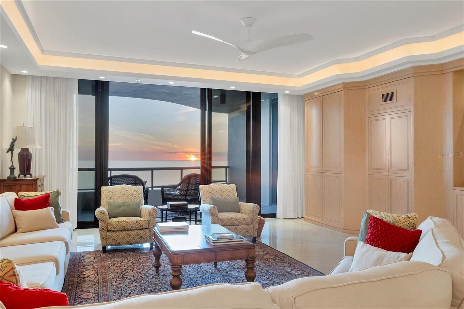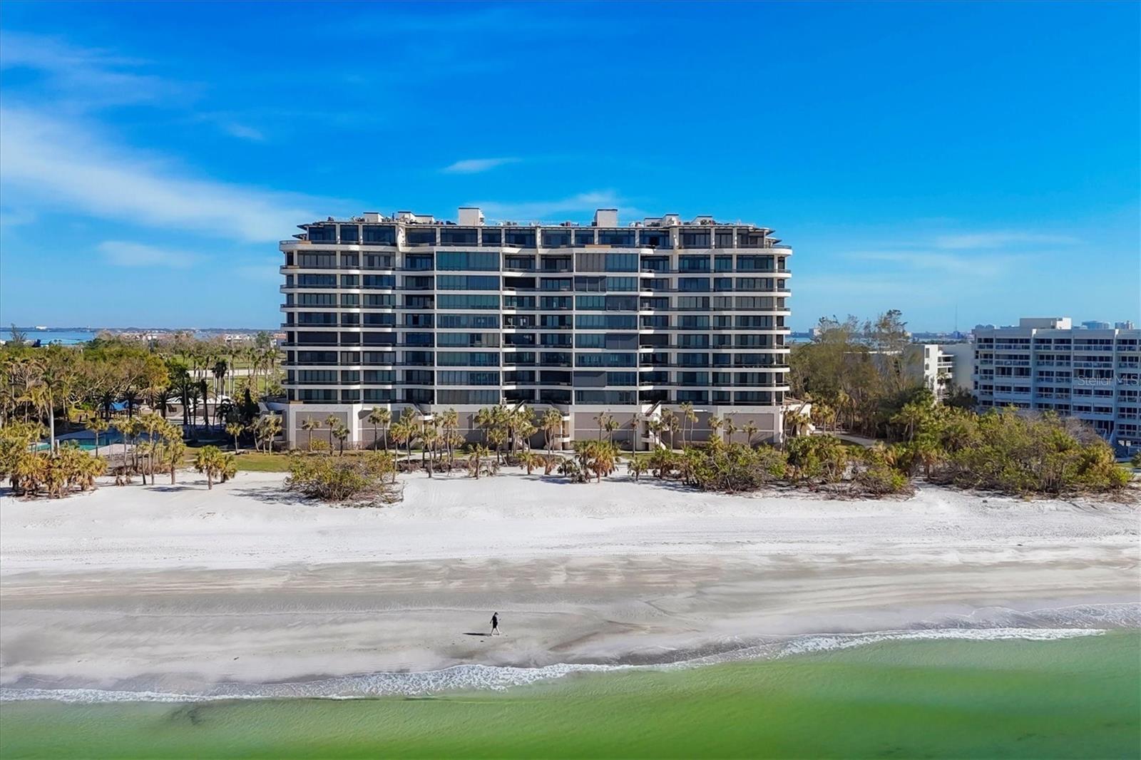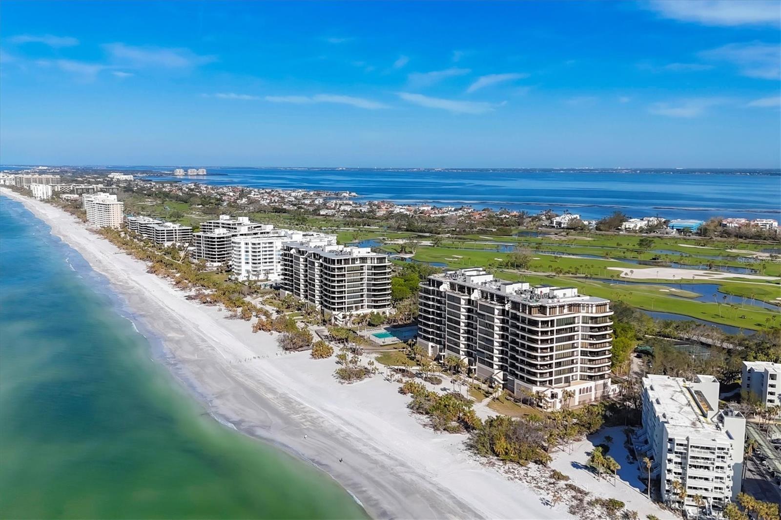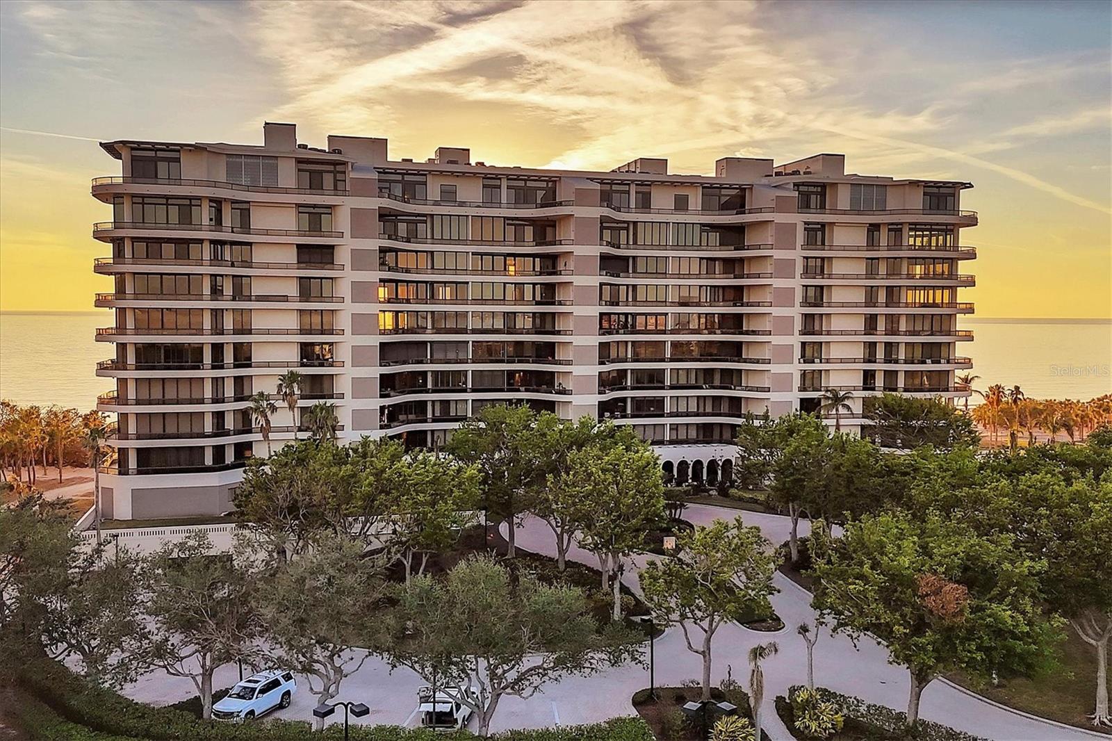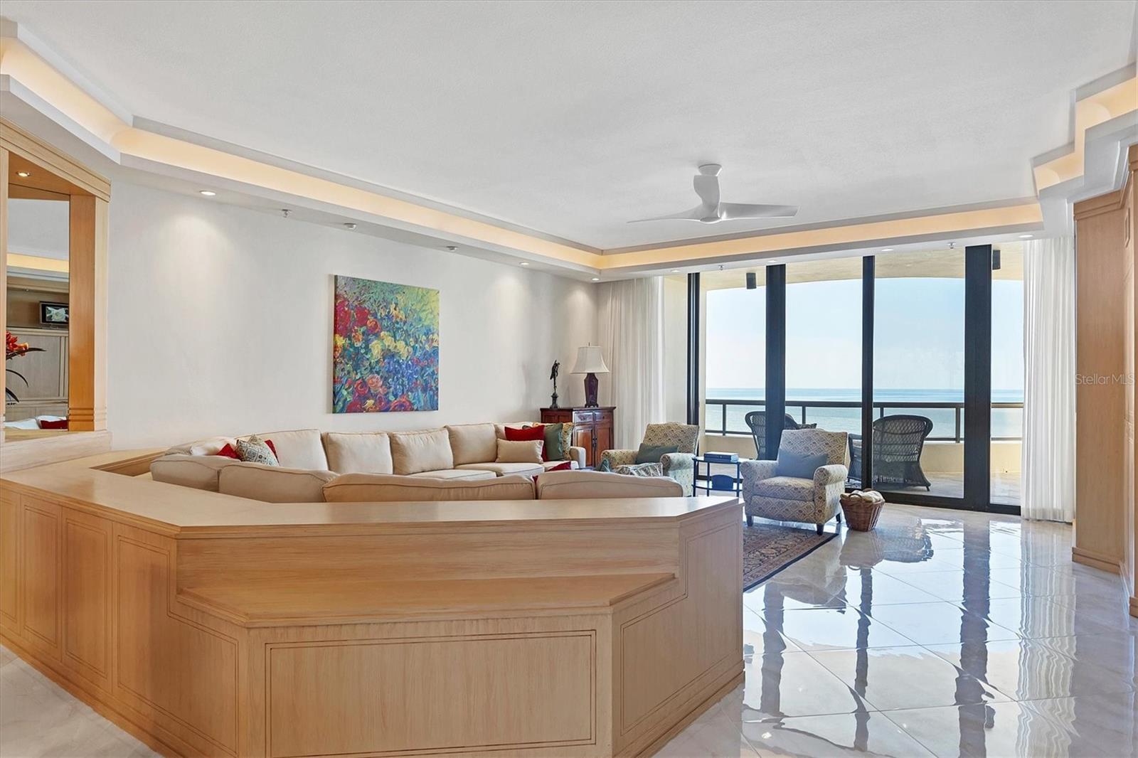 Behind the double-gated security of the Longboat Key Club, this fourth-floor residence in the iconic L’Ambiance condominium offers an unmatched blend of luxury, privacy and breathtaking Gulf of Mexico views. Spanning two bedrooms, 2.5 baths and a versatile den, this turnkey-furnished residence opens with a private elevator entrance leading to an elegant foyer and grand double doors. The spacious living room features a built-in media and entertainment center, art niches with lighting, and a wall of impact glass sliders that open to a gulf-facing terrace, ideal for taking in dramatic sunsets. The chef’s kitchen is functional and stylish, featuring granite countertops, a stainless-steel backsplash, abundant cabinetry with pull-out shelves and soft-close drawers, a custom pantry and high-end appliances, including a Sub-Zero refrigerator and KitchenAid suite. A casual dining nook and bay-facing window add to the charm. The private den includes a built-in media center, sliders with remote-controlled blinds, and access to a terrace with Sarasota Bay and skyline views. Porcelain floors grace the main living areas, while remote-controlled blinds throughout complement the abundance of natural light and stunning vistas. The primary suite boasts luxury vinyl plank flooring, a custom-organized walk-in closet with a safe, dual spacious wall closets, and access to a spa-like en suite with dual vanities, stone countertops and a shared glass shower. A generously appointed guest suite offers an en-suite bath with a tub and shower, plantation-shuttered windows, balcony access and a wall closet. Additional conveniences include a laundry room with storage, a sink, and new large-capacity GE washer and dryer. This immaculate residence is move-in ready, having been freshly painted and upgraded with Wi-Fi access points throughout the condominium, four TVs with Sonos sound systems, Wi-Fi enabled thermostats, a new water heater and updated HVAC systems. L’Ambiance spans 20 lush, tropical acres and offers world-class amenities, including a gulf side pool and spa, two lighted Har-Tru tennis courts, a fitness center, a sauna and steam room, and two card rooms. Two assigned parking spaces, a storage locker and a wine locker complete this extraordinary offering, just minutes from St. Armands Circle and Longboat Key Club amenities.