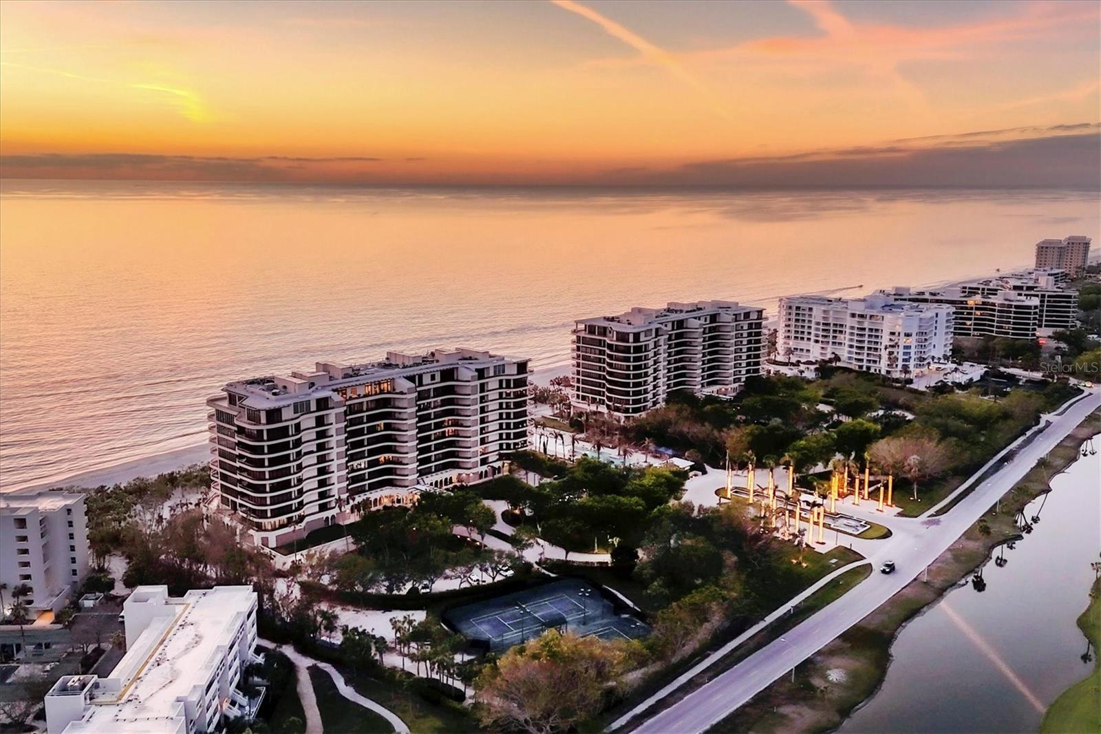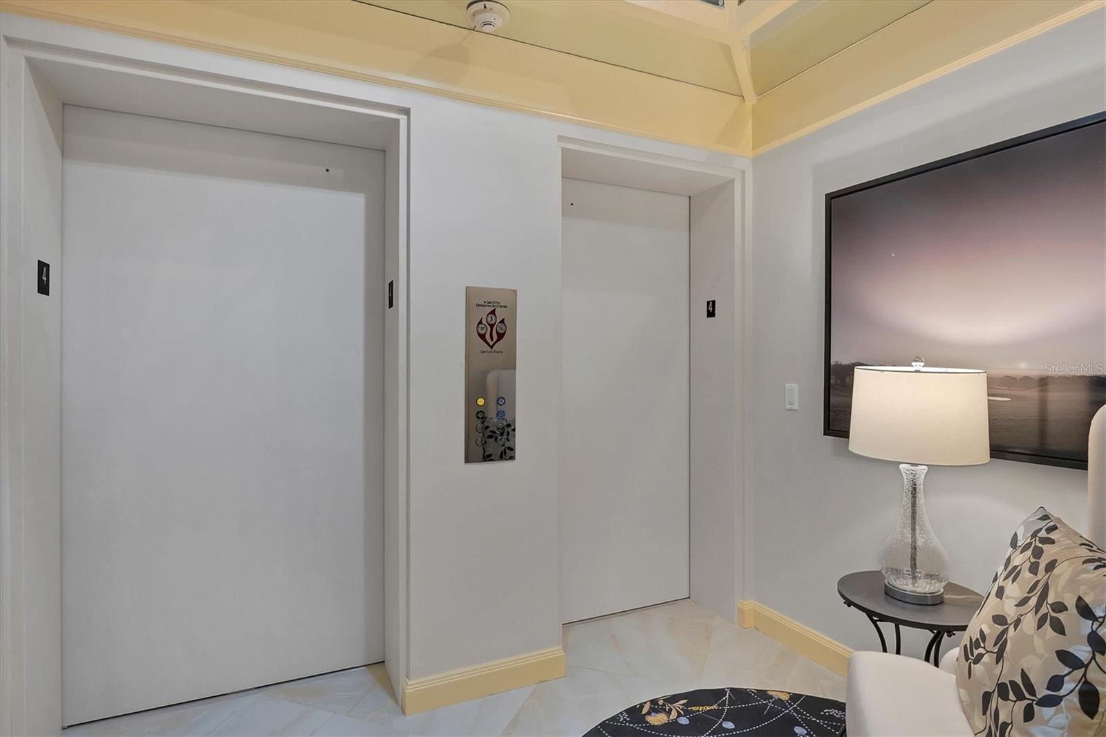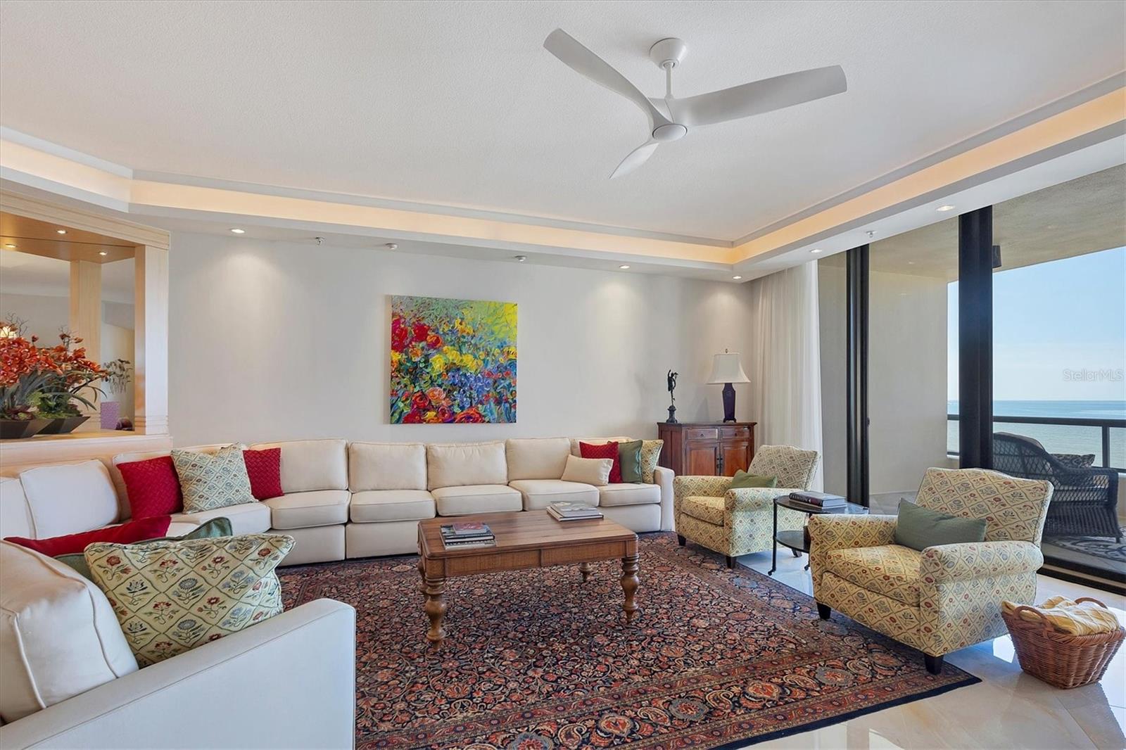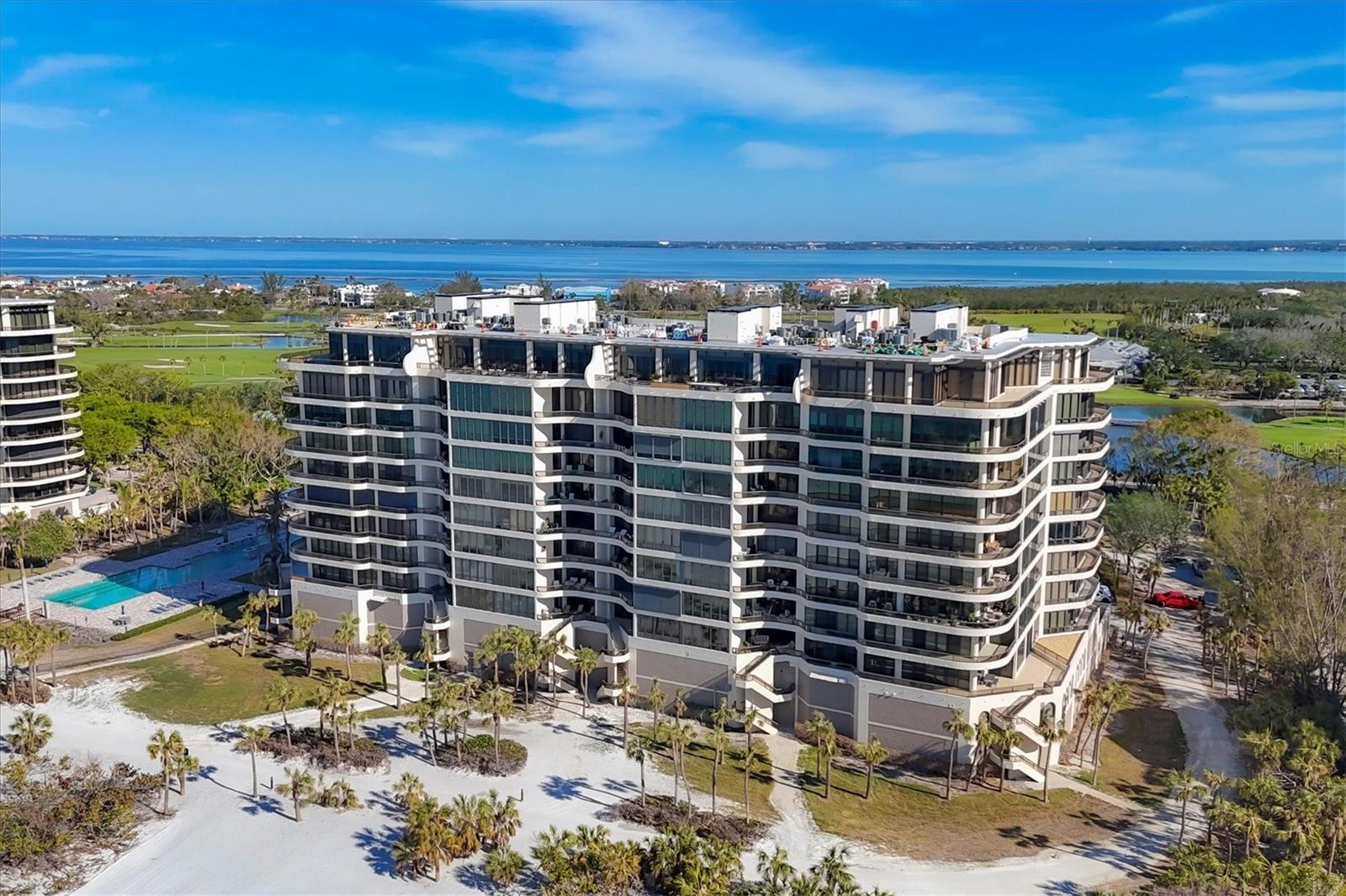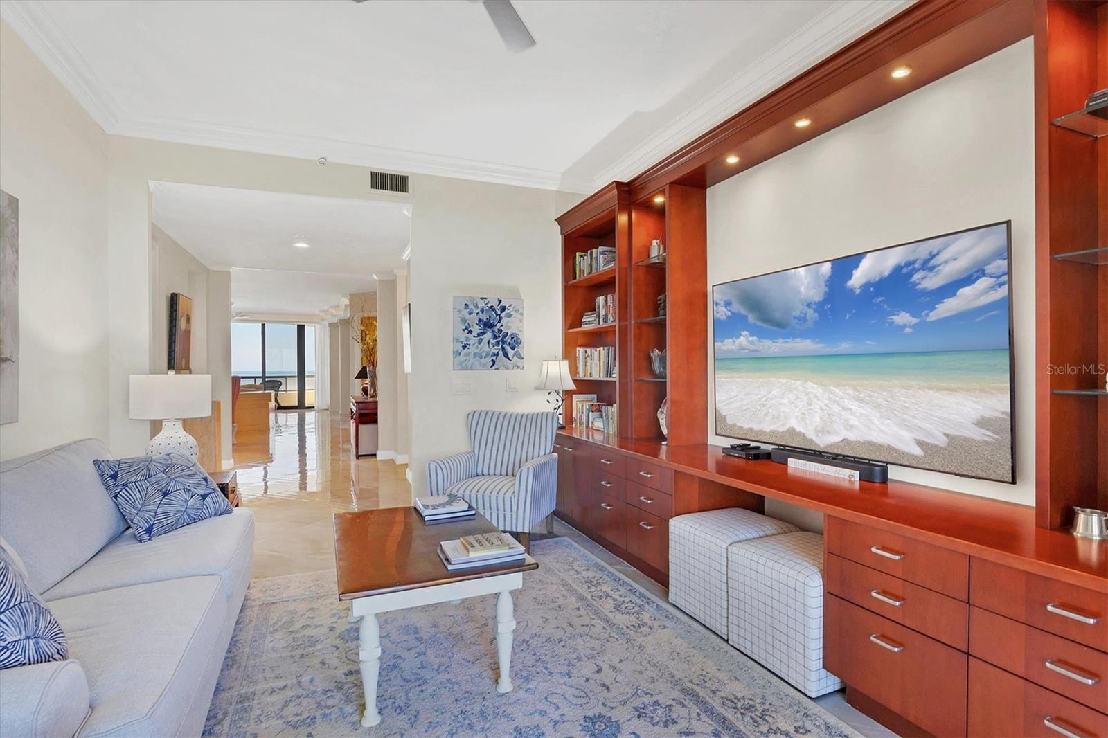 Behind the double-gated security of the Longboat Key Club, this fourth-floor residence in the iconic L’Ambiance condominium offers an unmatched blend of luxury, privacy and breathtaking Gulf of Mexico views. Spanning two bedrooms, 2.5 baths and a versatile den, this turnkey-furnished residence opens with a private elevator entrance leading to an elegant foyer and grand double doors. The spacious living room features a built-in media and entertainment center, art niches with lighting, and a wall of impact glass sliders that open to a gulf-facing terrace, ideal for taking in dramatic sunsets. The chef’s kitchen is functional and stylish, featuring granite countertops, a stainless-steel backsplash, abundant cabinetry with pull-out shelves and soft-close drawers, a custom pantry and high-end appliances, including a Sub-Zero refrigerator and KitchenAid suite. A casual dining nook and bay-facing window add to the charm. The private den includes a built-in media center, sliders with remote-controlled blinds, and access to a terrace with Sarasota Bay and skyline views. Porcelain floors grace the main living areas, while remote-controlled blinds throughout complement the abundance of natural light and stunning vistas. The primary suite boasts luxury vinyl plank flooring, a custom-organized walk-in closet with a safe, dual spacious wall closets, and access to a spa-like en suite with dual vanities, stone countertops and a shared glass shower. A generously appointed guest suite offers an en-suite bath with a tub and shower, plantation-shuttered windows, balcony access and a wall closet. Additional conveniences include a laundry room with storage, a sink, and new large-capacity GE washer and dryer. This immaculate residence is move-in ready, having been freshly painted and upgraded with Wi-Fi access points throughout the condominium, four TVs with Sonos sound systems, Wi-Fi enabled thermostats, a new water heater and updated HVAC systems. L’Ambiance spans 20 lush, tropical acres and offers world-class amenities, including a gulf side pool and spa, two lighted Har-Tru tennis courts, a fitness center, a sauna and steam room, and two card rooms. Two assigned parking spaces, a storage locker and a wine locker complete this extraordinary offering, just minutes from St. Armands Circle and Longboat Key Club amenities.