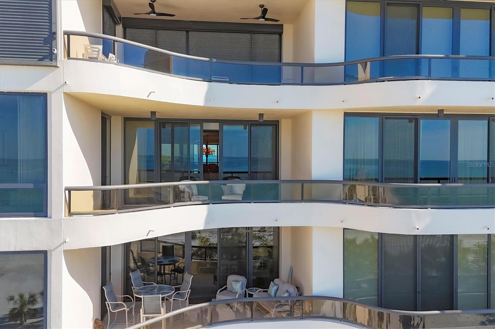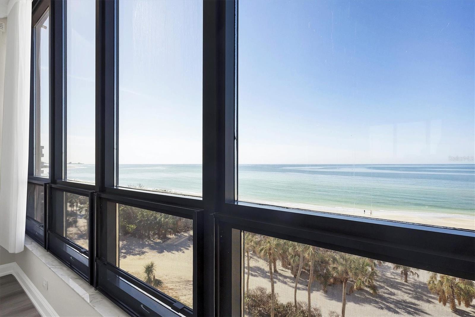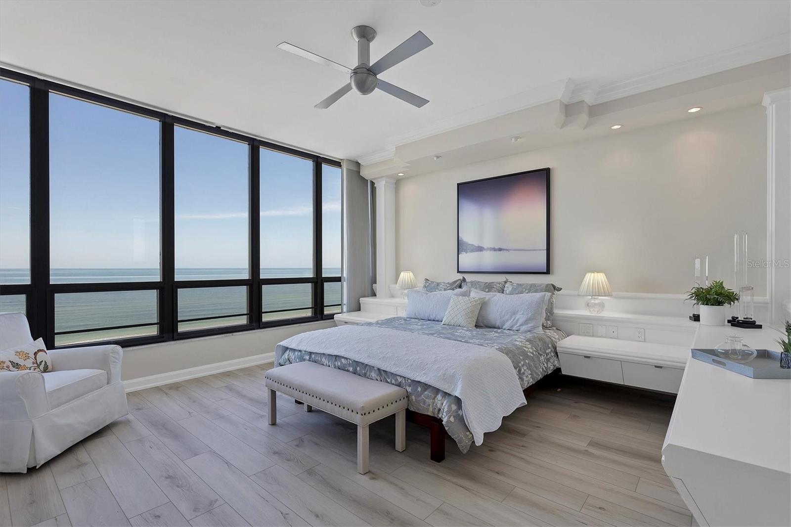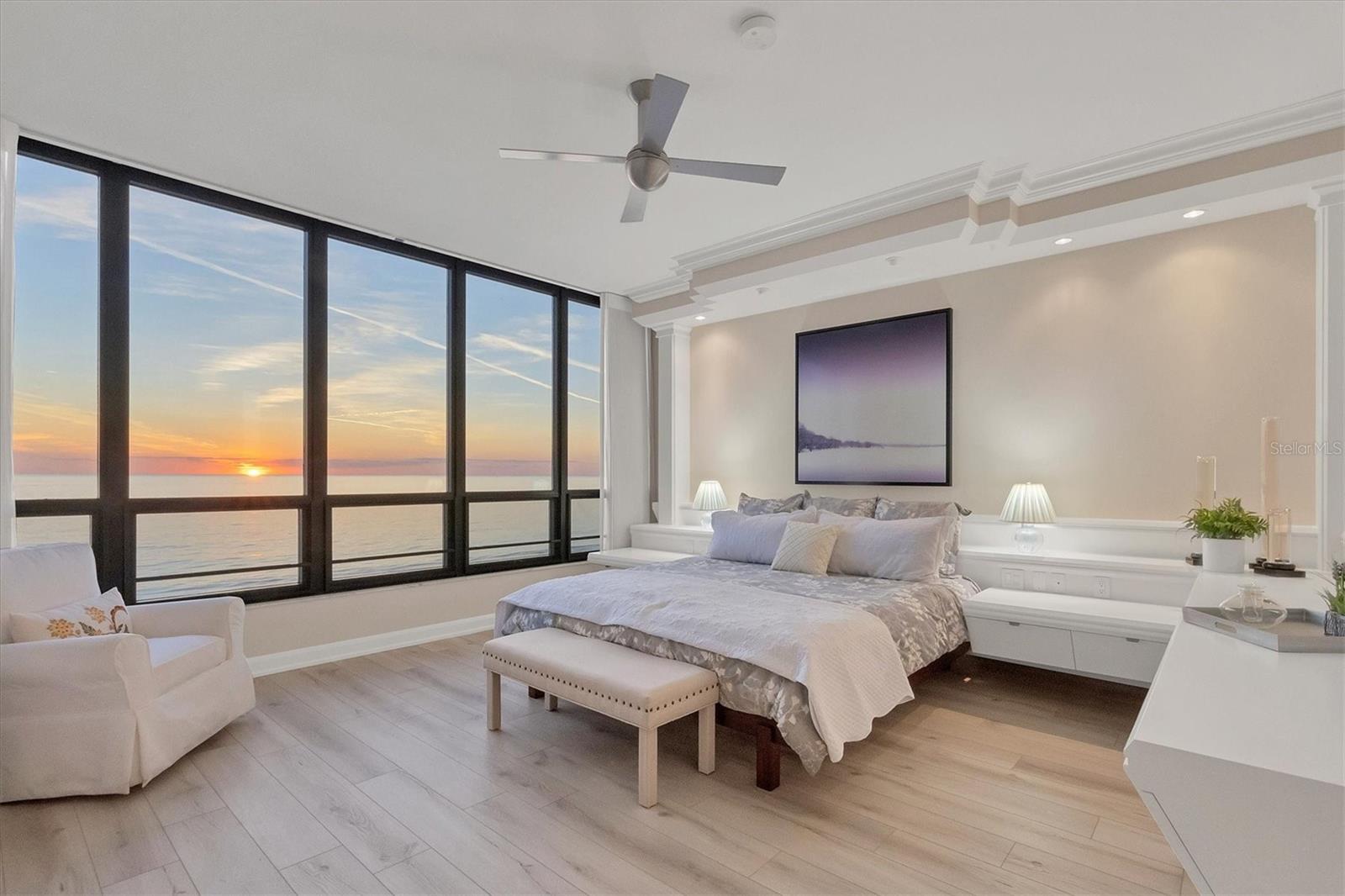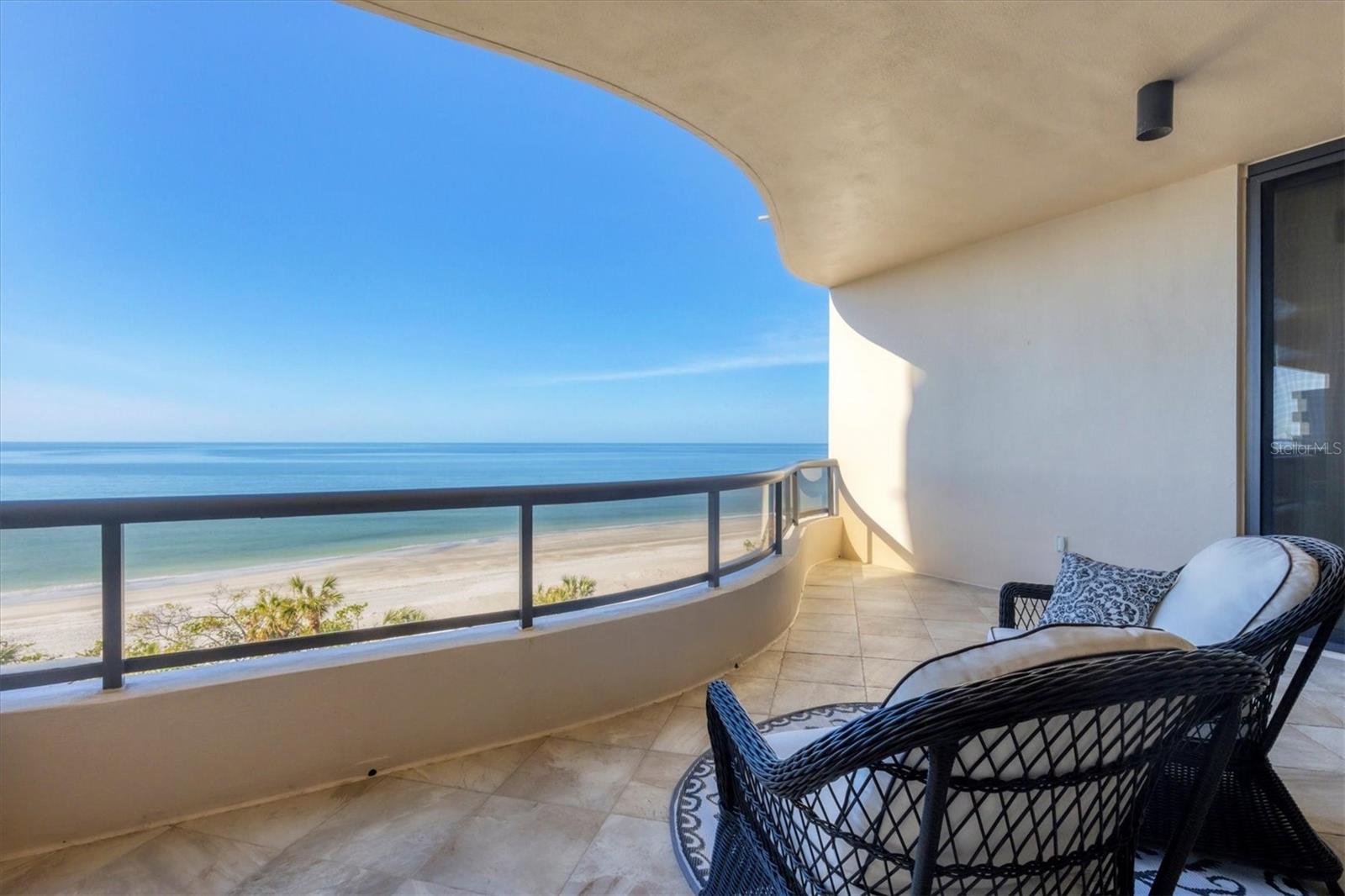 Behind the double-gated security of the Longboat Key Club, this fourth-floor residence in the iconic L’Ambiance condominium offers an unmatched blend of luxury, privacy and breathtaking Gulf of Mexico views. Spanning two bedrooms, 2.5 baths and a versatile den, this turnkey-furnished residence opens with a private elevator entrance leading to an elegant foyer and grand double doors. The spacious living room features a built-in media and entertainment center, art niches with lighting, and a wall of impact glass sliders that open to a gulf-facing terrace, ideal for taking in dramatic sunsets. The chef’s kitchen is functional and stylish, featuring granite countertops, a stainless-steel backsplash, abundant cabinetry with pull-out shelves and soft-close drawers, a custom pantry and high-end appliances, including a Sub-Zero refrigerator and KitchenAid suite. A casual dining nook and bay-facing window add to the charm. The private den includes a built-in media center, sliders with remote-controlled blinds, and access to a terrace with Sarasota Bay and skyline views. Porcelain floors grace the main living areas, while remote-controlled blinds throughout complement the abundance of natural light and stunning vistas. The primary suite boasts luxury vinyl plank flooring, a custom-organized walk-in closet with a safe, dual spacious wall closets, and access to a spa-like en suite with dual vanities, stone countertops and a shared glass shower. A generously appointed guest suite offers an en-suite bath with a tub and shower, plantation-shuttered windows, balcony access and a wall closet. Additional conveniences include a laundry room with storage, a sink, and new large-capacity GE washer and dryer. This immaculate residence is move-in ready, having been freshly painted and upgraded with Wi-Fi access points throughout the condominium, four TVs with Sonos sound systems, Wi-Fi enabled thermostats, a new water heater and updated HVAC systems. L’Ambiance spans 20 lush, tropical acres and offers world-class amenities, including a gulf side pool and spa, two lighted Har-Tru tennis courts, a fitness center, a sauna and steam room, and two card rooms. Two assigned parking spaces, a storage locker and a wine locker complete this extraordinary offering, just minutes from St. Armands Circle and Longboat Key Club amenities.