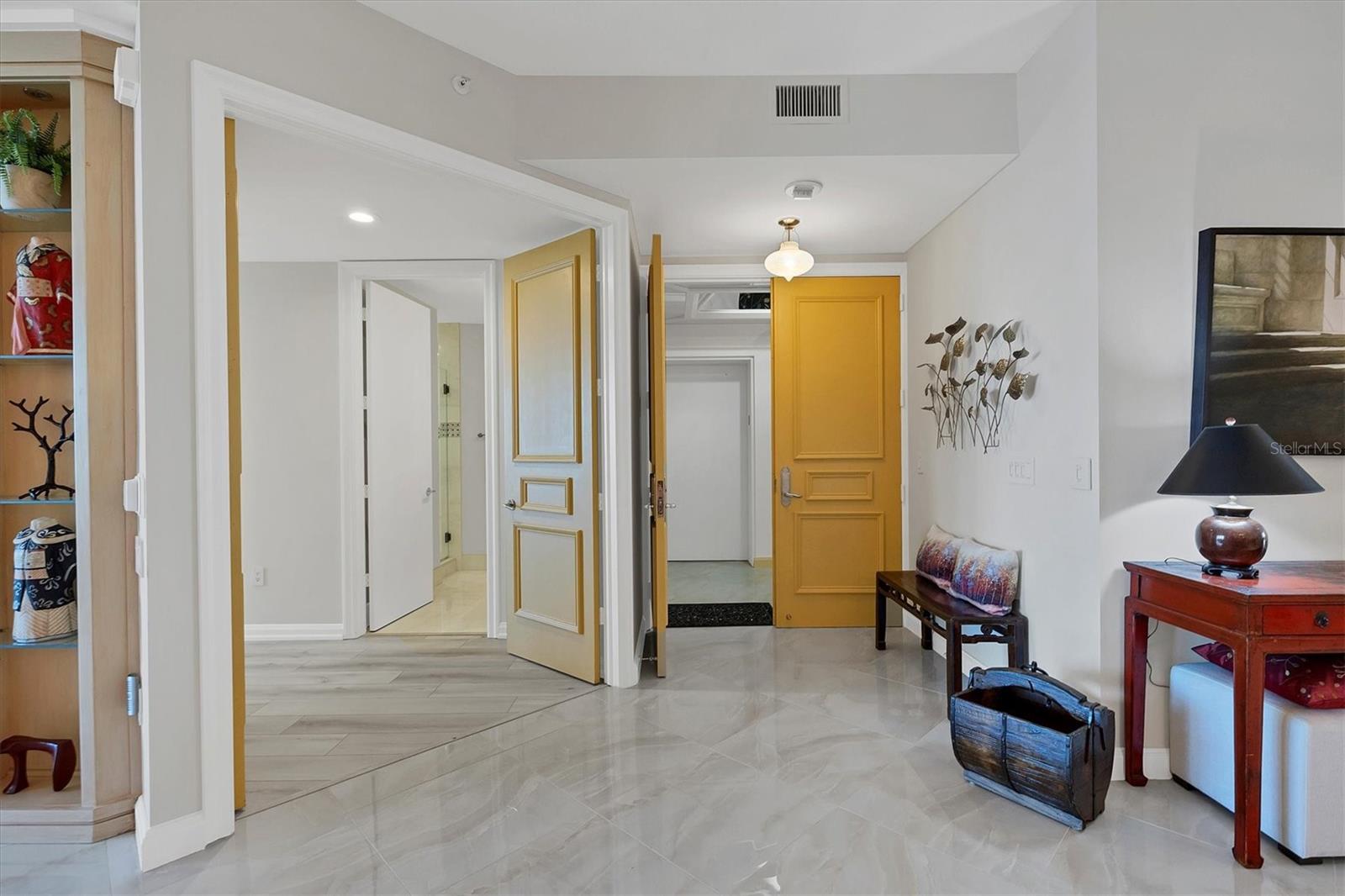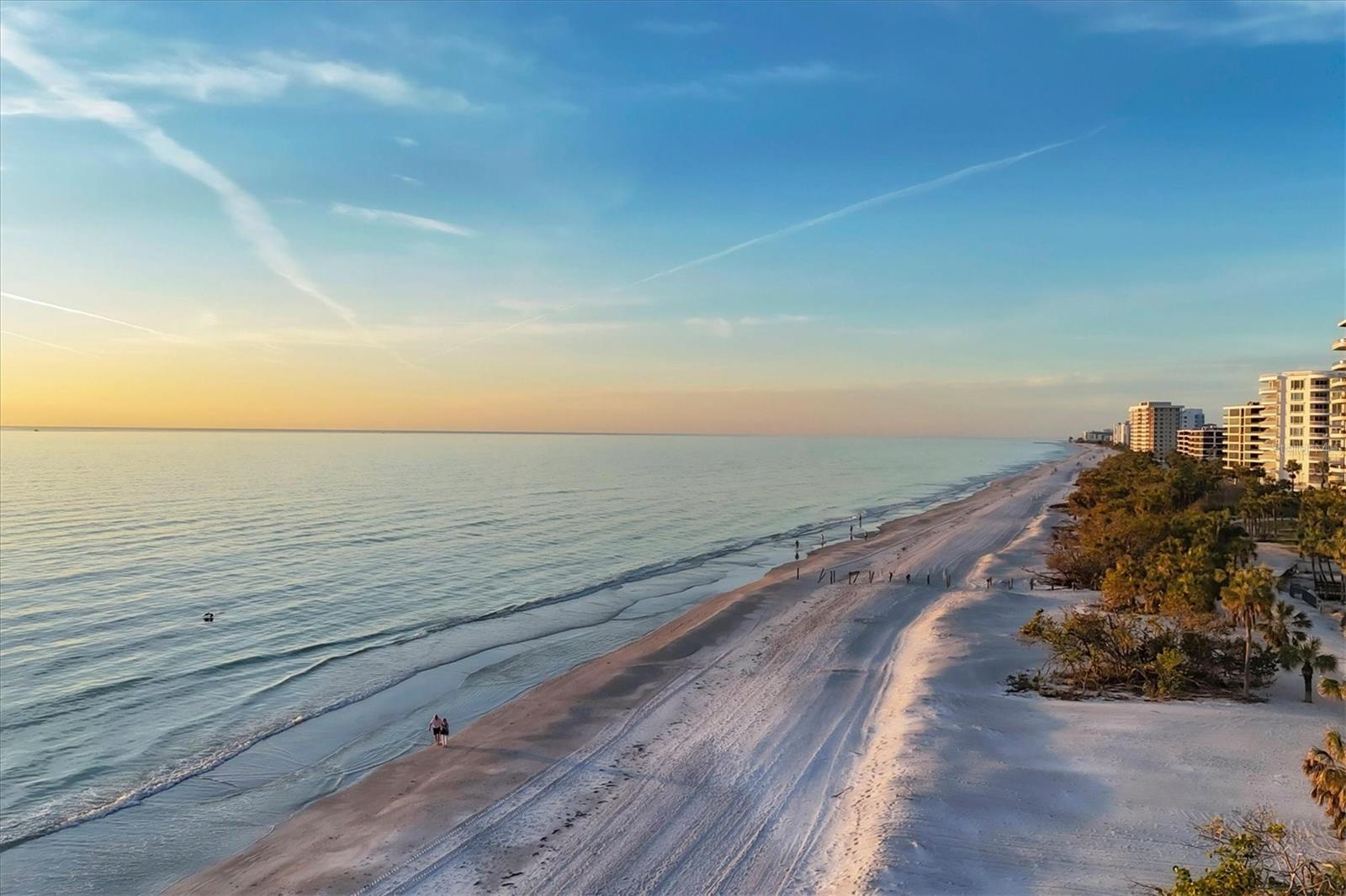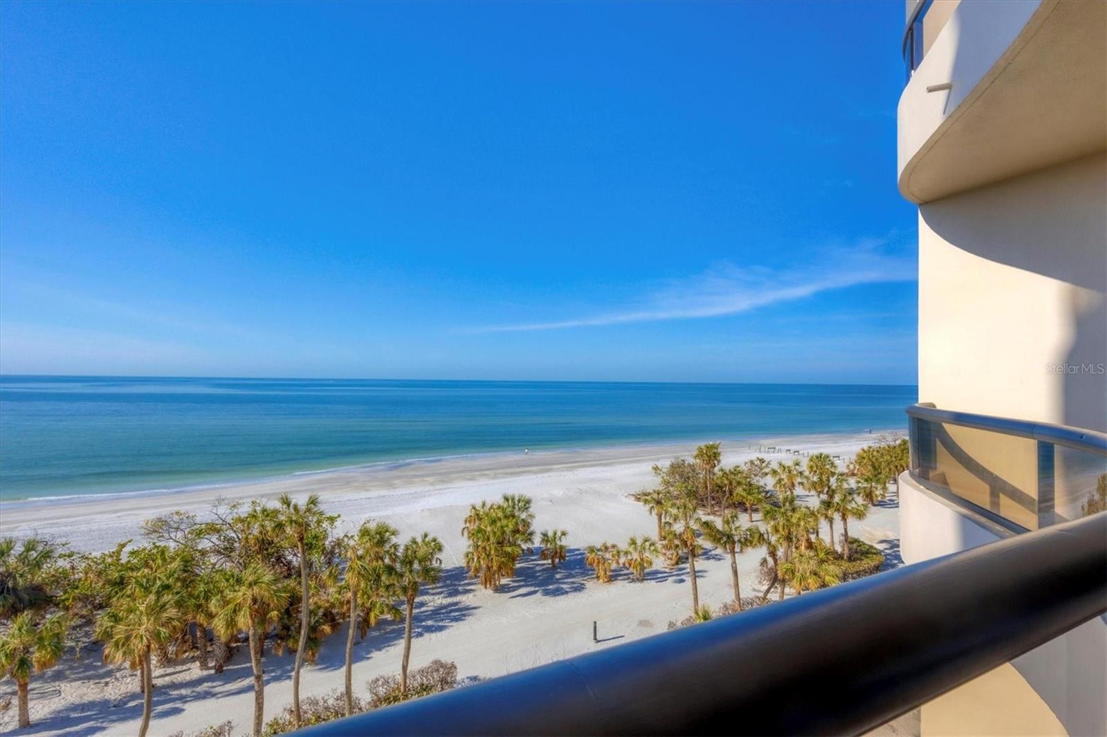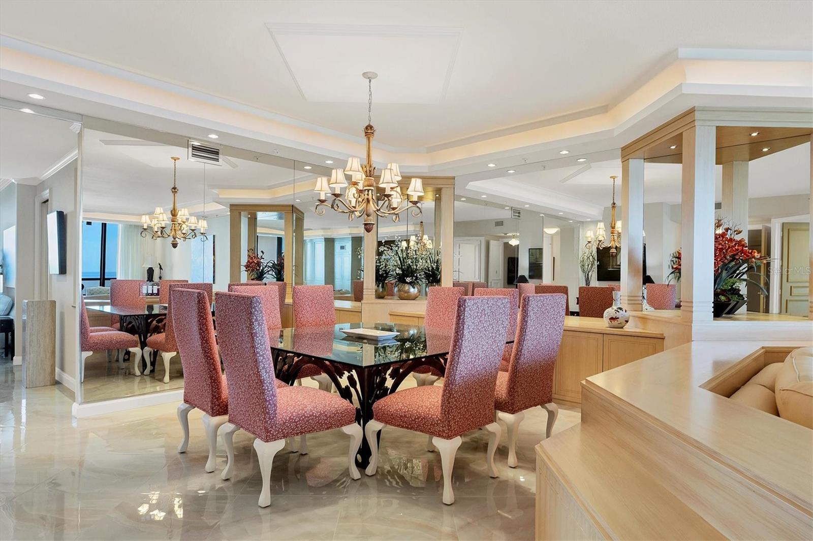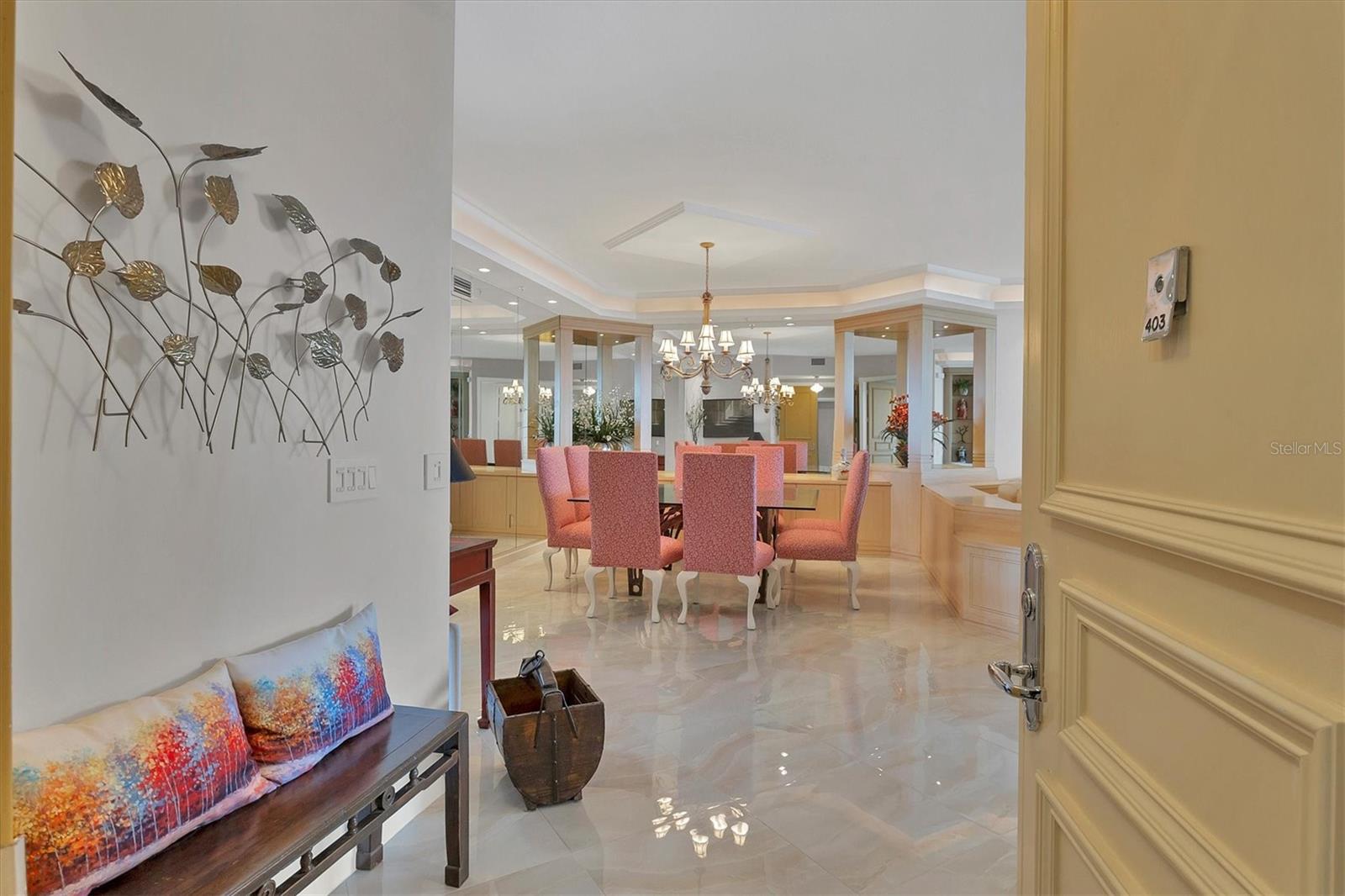 Behind the double-gated security of the Longboat Key Club, this fourth-floor residence in the iconic L’Ambiance condominium offers an unmatched blend of luxury, privacy and breathtaking Gulf of Mexico views. Spanning two bedrooms, 2.5 baths and a versatile den, this turnkey-furnished residence opens with a private elevator entrance leading to an elegant foyer and grand double doors. The spacious living room features a built-in media and entertainment center, art niches with lighting, and a wall of impact glass sliders that open to a gulf-facing terrace, ideal for taking in dramatic sunsets. The chef’s kitchen is functional and stylish, featuring granite countertops, a stainless-steel backsplash, abundant cabinetry with pull-out shelves and soft-close drawers, a custom pantry and high-end appliances, including a Sub-Zero refrigerator and KitchenAid suite. A casual dining nook and bay-facing window add to the charm. The private den includes a built-in media center, sliders with remote-controlled blinds, and access to a terrace with Sarasota Bay and skyline views. Porcelain floors grace the main living areas, while remote-controlled blinds throughout complement the abundance of natural light and stunning vistas. The primary suite boasts luxury vinyl plank flooring, a custom-organized walk-in closet with a safe, dual spacious wall closets, and access to a spa-like en suite with dual vanities, stone countertops and a shared glass shower. A generously appointed guest suite offers an en-suite bath with a tub and shower, plantation-shuttered windows, balcony access and a wall closet. Additional conveniences include a laundry room with storage, a sink, and new large-capacity GE washer and dryer. This immaculate residence is move-in ready, having been freshly painted and upgraded with Wi-Fi access points throughout the condominium, four TVs with Sonos sound systems, Wi-Fi enabled thermostats, a new water heater and updated HVAC systems. L’Ambiance spans 20 lush, tropical acres and offers world-class amenities, including a gulf side pool and spa, two lighted Har-Tru tennis courts, a fitness center, a sauna and steam room, and two card rooms. Two assigned parking spaces, a storage locker and a wine locker complete this extraordinary offering, just minutes from St. Armands Circle and Longboat Key Club amenities.