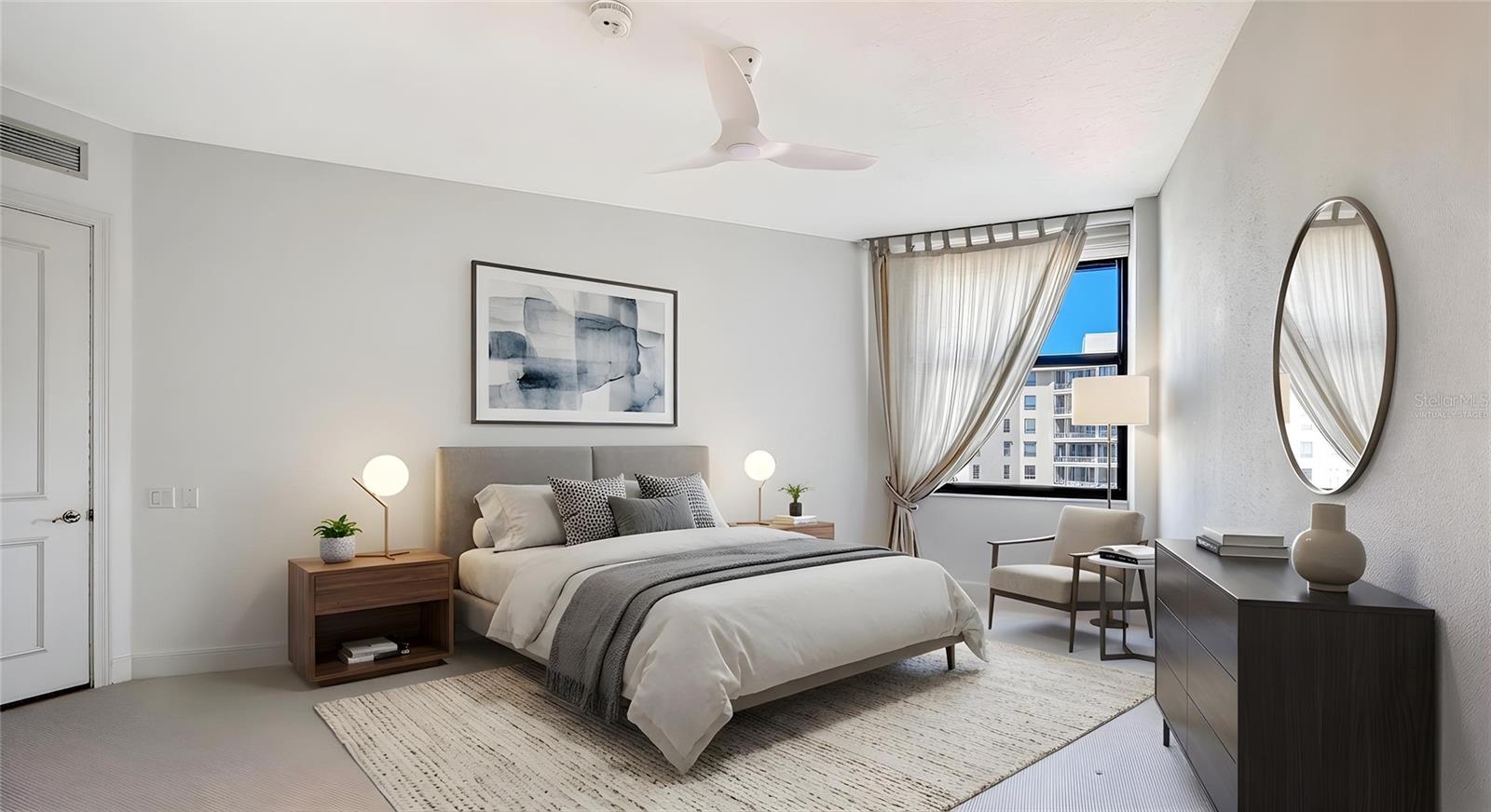 Welcome to The Water Club at Longboat Key, where privacy, spaciousness, and resort-style amenities complement the natural beauty of the setting at the edge of the sparkling waters of the Gulf of Mexico. Residents benefit from a semi-private elevator that opens directly into an impressive foyer, offering sweeping views of Sarasota Bay and the city skyline through floor-to-ceiling windows. This residence is on the north side of the south building, the sunset view side, overlooking the beautiful pool deck amenity of the community. This eighth-floor Brighton residence is highly coveted for its three-bedroom configuration with panoramic vistas of the Gulf, beach, and bay from two expansive terraces. Features include ten-foot ceilings, extensive glass walls, and storm protection shutters , enhancing both comfort and sophistication. The living room is designed to maximize openness and showcase sunsets over the Gulf. The primary suite offers a private terrace, den, walk-in closet, and dual bathrooms. With a split-bedroom plan, privacy is maintained for two generous guest suites, each featuring an en-suite bath. The kitchen is efficiently appointed with significant storage and a breakfast area overlooking the water. The Water Club stands as Longboat Key’s premier gated beachfront community, situated on 16 acres of meticulously landscaped grounds. Amenities include a 17,000-square-foot clubhouse, well-equipped fitness center and spa, heated lap pool and hot tub, four Har-Tru tennis courts, concierge services, and versatile gathering spaces such as a library, billiards room, ballroom, firepit, and grilling area. Additional conveniences include under-building parking, climate-controlled storage, on-site management, and 24-hour security. Ideally located on the south end of Longboat Key, residents enjoy proximity to Longboat Key Club golf facilities, Publix shopping center, exclusive St. Armands Circle, downtown Sarasota’s cultural offerings, and Sarasota International Airport, just 20 minutes away. The Water Club is pet-friendly and impeccably maintained, providing the pinnacle of coastal luxury living.