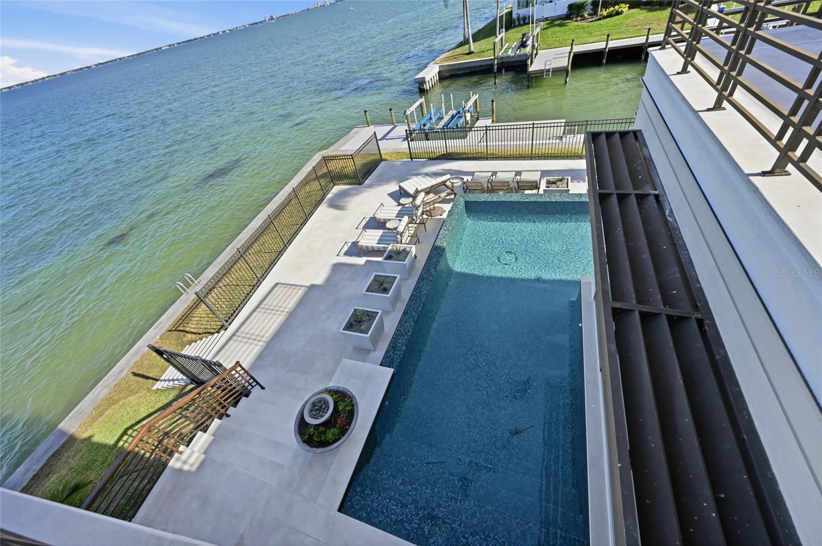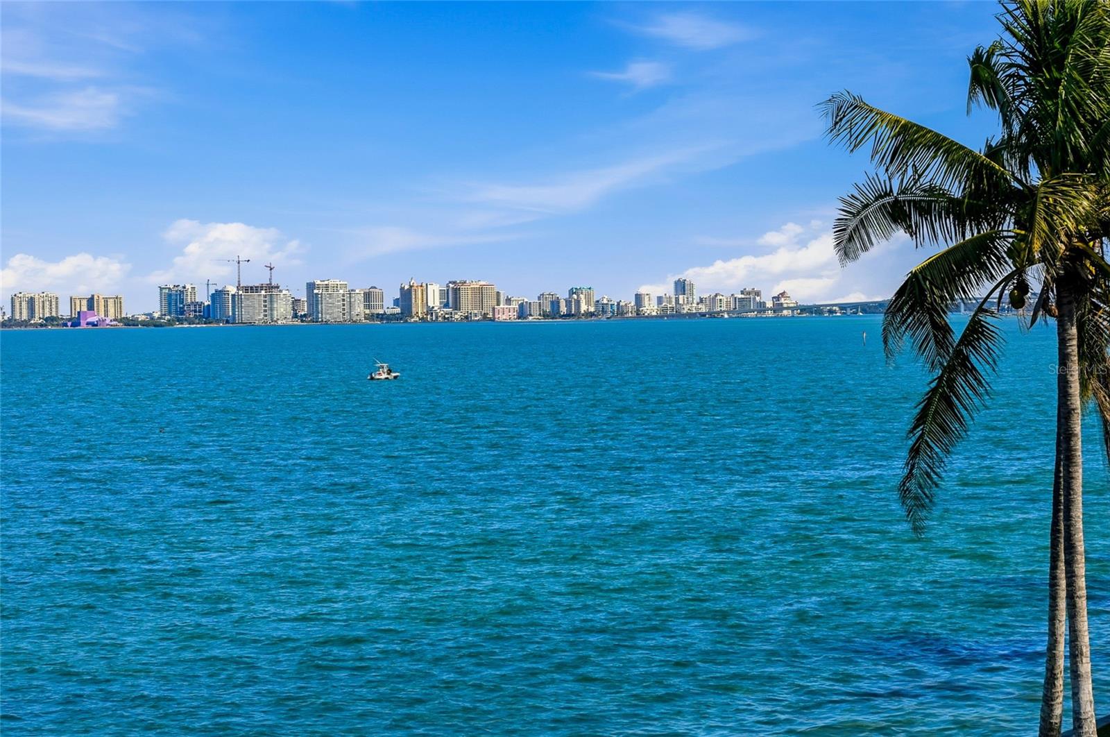 Sarasota Bay Waterfront Masterpiece – Perched on one of the most coveted point lots in Country Club Shores, this elevated, 2016 coastal contemporary offers 260 feet of unobstructed views across Sarasota Bay, the city skyline, and the Ringling Bridge. Designer-furnished and move-in ready, it embodies the pinnacle of waterfront luxury. Designed with resilience and sophistication, the home and garage are elevated above flood impact levels and experienced no water intrusion throughout recent storm events. The property also benefits from a second, engineered seawall that strengthens the foundation and supports the outdoor terraces, offering both structural security and enduring coastal comfort. At the water’s edge, enjoy a 63’ Trex dock with a 14,000-lb lift, 3,000-lb kayak/paddleboard elevator, water and electric, and outdoor shower. A 260' vinyl seawall and breakwater, completed in 2016, ensures peace of mind and lasting stability. Inside, 4,553 sq. ft. of refined living space showcases bespoke craftsmanship and advanced technology, including a full-home Lutron system, Windoor 8100 sliders, Doors In Motion wall systems, and a comprehensive security network. Luxurious materials abound: limestone flooring on the main level, engineered white oak upstairs, cypress soffits, Level 5 drywall, and warm walnut beams. The main living area impresses with soaring 11’4” ceilings and a dramatic two-way natural gas fireplace. The dining room continues the understated luxury with walnut detailing, automated shades, and its own fireplace. The chef’s kitchen is a culinary showpiece, featuring Cristello quartz countertops, walnut veneer cabinetry, Miele appliances, induction cooktop, warming drawer, Grohe filtration, veggie sink with disposal, and a smart dumbwaiter connecting to the second floor. Outdoor living is unparalleled. A 350-sq-ft covered terrace boasts Turkish, Alexander Cream limestone flooring, Wolf grill, marble countertops, refrigeration, big-screen TV, and retractable openings for seamless indoor-outdoor entertaining. Steps away, a disappearing-edge saltwater pool with tanning shelf and sculptural planters with gas fire bowls create a breathtaking setting for relaxation or entertaining. The first-floor owner’s suite is a serene retreat with a private balcony, automated drapes, custom walnut headboard with pop-up TV, and a spa-inspired bath featuring floor-to-ceiling marble, dual sinks, heated floors and towel racks, double shower, dedicated vanity, and a walnut walk-in closet with built-in safe. Upstairs, a striking glass-and-walnut floating staircase leads to 10’ ceilings, a versatile 4th bedroom with built-in bunk beds, wet bar, refrigeration, dumbwaiter access, and two fully opening walls to covered and open-air terraces. Outdoor spaces include: East/south-facing terrace with pocketing glass doors, Pecky cypress ceilings, Infratech heaters, and sweeping skyline views. Sun terrace for relaxing or entertaining. West-facing sunset terrace with linear entertaining bar. Two additional upper guest suites offer full bay views, terrace access, and en-suite baths finished in marble, porcelain, and terrazzo-inspired materials. Additional luxury features include a dedicated laundry room, powder room, 2-car garage with golf cart charging, epoxy flooring, built-ins, and a natural-gas generator supporting 400-amp service. This is a rare convergence of architectural brilliance delivering Sarasota living at its most elevated and effortless.