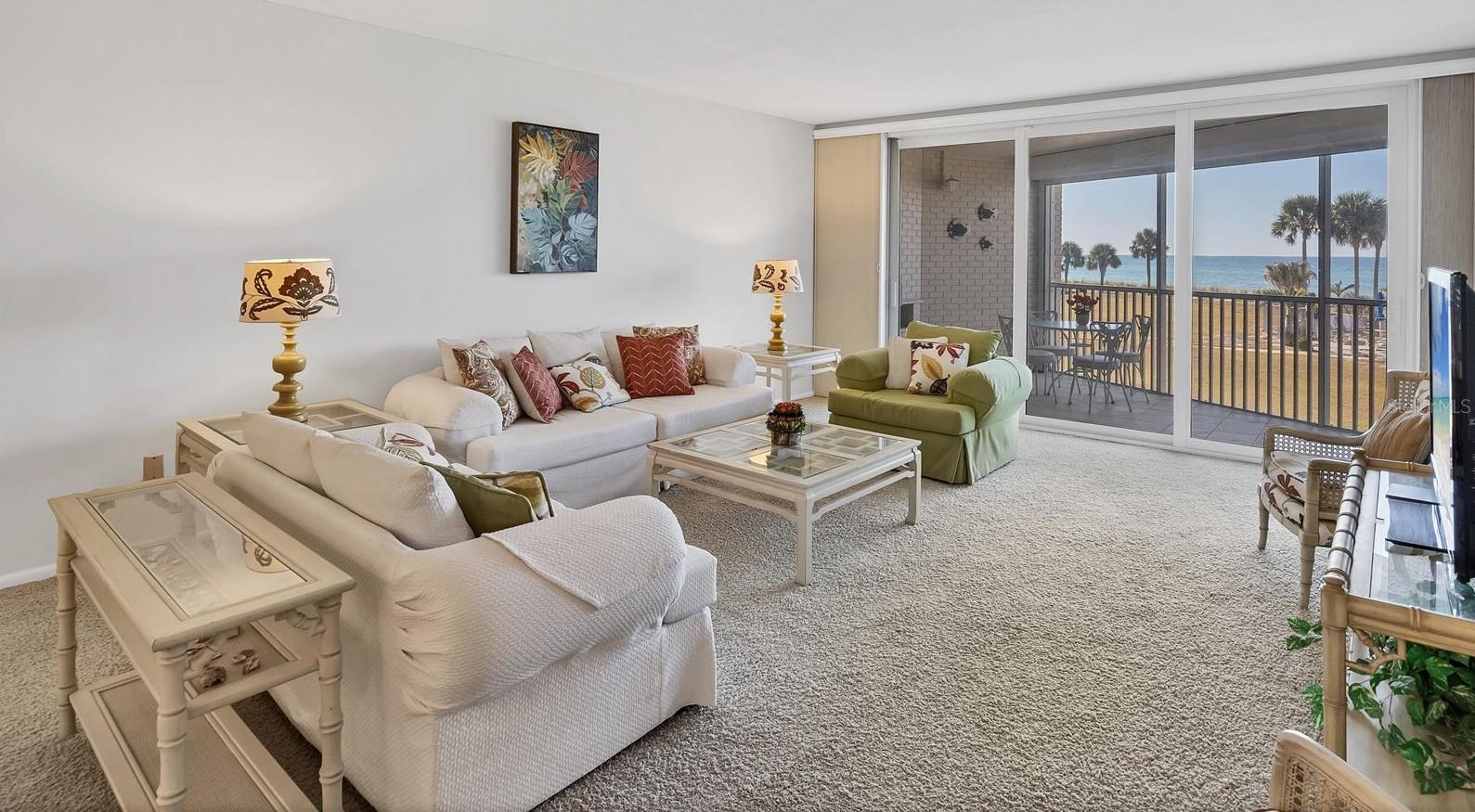 The unobstructed Gulf View greets you as you enter this 2nd floor unit. The spacious living area overlooks the large screened lanai out to the Gulf of Mexico. All units at The Westchester community have new impact resistant sliders and windows that meet Miami Dade code in order to reduce insurance premiums for all. This unit also has extra protection as both lanais have electric shutters that also help with energy cost while you are away. The windows, sliders and shutter cost were the responsibility of the owners. Brand new Hunter Douglas honeycomb blinds on both sliders. A/C is 3 years new, water heater 1 year ago. The entire unit is freshly painted and the ceilings refinished. A new GE Profile combo washer/dryer was just installed so you won’t need to use the community laundry. The galley kitchen is tastefully updated with soft close cabinetry and quartz countertops. The refrigerator was replaced 2 years ago; it has a purified water option for drinking water and ice. The primary bedroom has a private lanai that overlooks the Gulf. Both en-suite bedrooms are split to offer privacy. Both have walk in closets as well as a second closet in the main bedroom area. The primary bathroom was renovated with a beautiful shower and dual vanity; The second bath was also renovated and has a large Kohler soaking tub and Kohler fixtures. The guest bedroom is large enough to accommodate 2 double beds. There are 3 entry storage closets as well as a large private storage room downstairs close to your assigned carport space. Westchester is situated on 7 acres with 700 feet of beach. There are loungers on the beach, 2 heated pools, 3 beachside tiki huts, pickleball/tennis court, kayak/bicycle storage, BBQ grills and shuffleboard. The new clubhouse with fitness center is currently under construction. The Gulf side of the property is undergoing improvements to the pool area as well as landscaping. Westchester is a very well managed property with in-house manager and maintenance staff. The unit is being offered unfurnished. BE SURE TO CHECK OUT THE VIRTUAL TOUR LINK FOR THE 3D TOUR - BETTER THAN PICTURES!