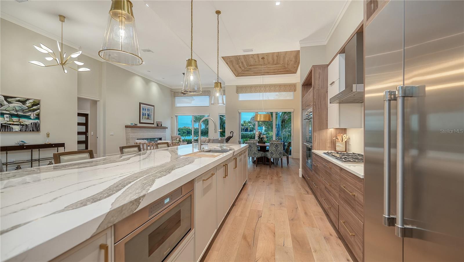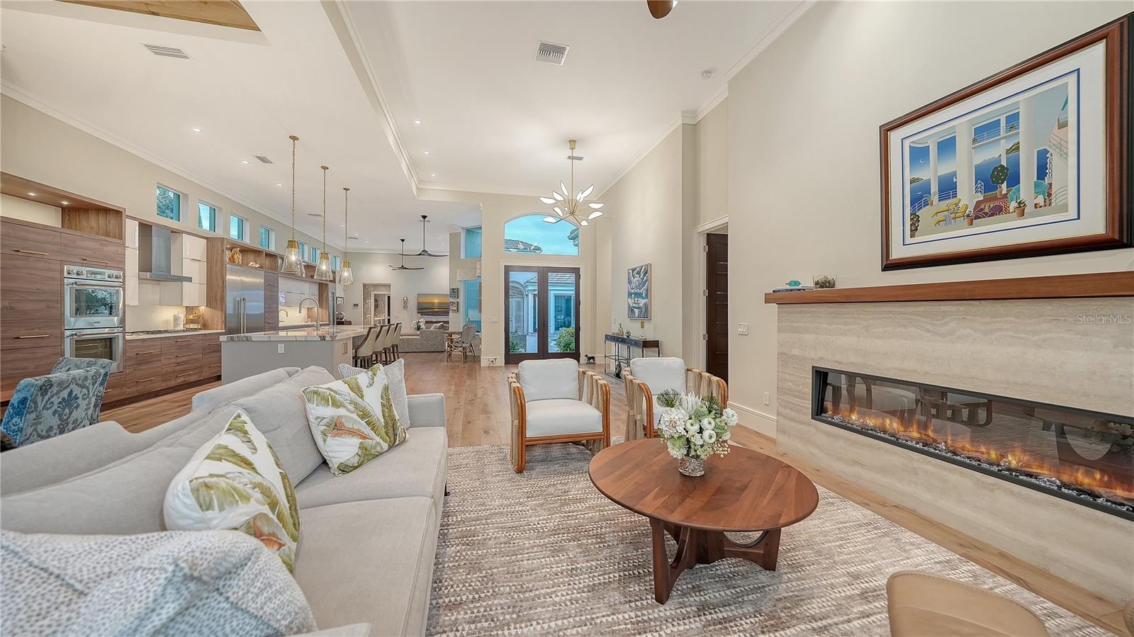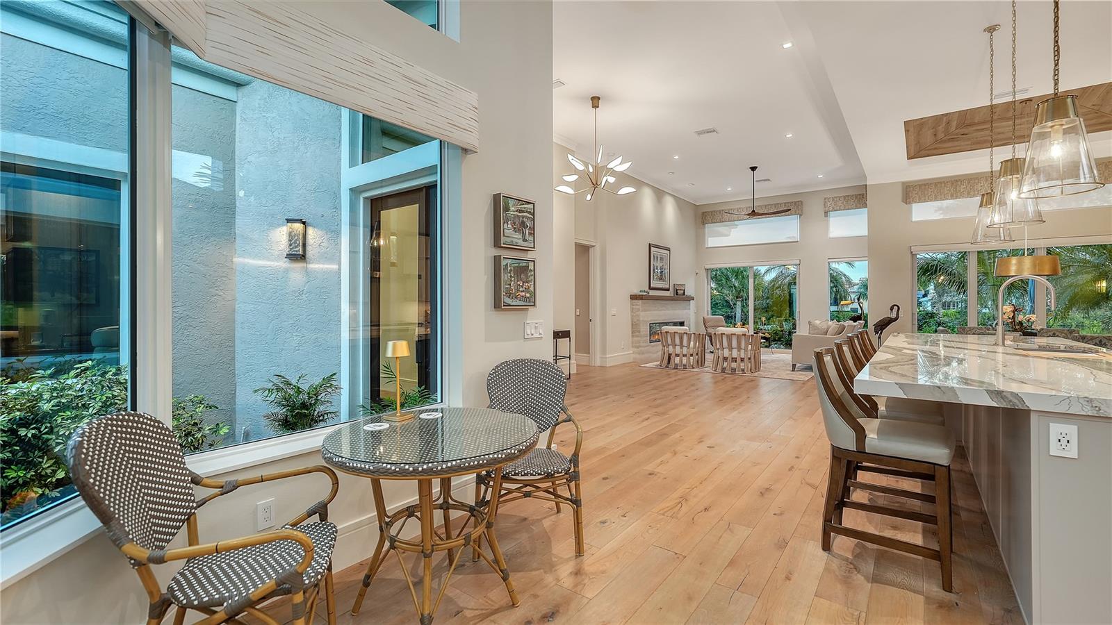 Situated within the gated Queens Harbour enclave of Bay Isles, this thoughtfully updated four-bedroom courtyard residence offers a refined blend of privacy, comfort, and waterfront living on Longboat Key. Designed around a lush central courtyard, the home creates an effortless indoor-outdoor flow anchored by a resurfaced swimming pool and new paver deck—an inviting retreat for everyday living or entertaining. A private cabana suite with its own entrance provides flexibility for guests or extended stays, enhancing the home’s functionality while maintaining separation from the main living areas. Entry begins through custom mahogany and glass double doors, opening to a reimagined open-concept interior with soaring 14-foot ceilings, wide-plank wood flooring, and carefully curated architectural detail throughout. The great room is centered around a travertine-encased electric fireplace and framed by walls of windows and glass sliders that capture tranquil lake views and abundant natural light. This space flows seamlessly into the formal dining area, highlighted by a statement chandelier and tongue-and-groove tray ceiling, and continues into the chef’s kitchen—designed as the heart of the home. The kitchen features a dramatic 14-foot quartz-topped island, custom designer cabinetry by Sarasota Architectural Woodworking, and newer Thermador appliances, including a five-burner gas cooktop, dual built-in ovens, pull-out pantry cabinetry, and a 48-inch stainless sink. Adjacent informal dining and family spaces include aquarium-style glass windows and an oversized wet bar with a full-size wine cooler capable of storing over 100 bottles. The primary suite, located on the main level, offers a peaceful lakefront setting with French-door access to the patio, custom built-in storage, and a walk-in closet. The spa-inspired bath was recently updated with dual quartz-topped walnut vanities, soaking tub, glass-and-stone shower, and private water closet. Also on the first floor are a versatile study overlooking the courtyard and a bonus room with an attached full bath that can serve as an additional bedroom or media space. The second level is dedicated to a private en-suite guest bedroom. Queens Harbour residents enjoy access to a heated Olympic-size pool and spa, along with deeded entry to the private Bay Isles Beach Club. Beyond the gates, Longboat Key’s lifestyle amenities are just minutes away, including the Longboat Key Club’s golf and tennis facilities, marinas, dining, and everyday conveniences. St. Armands Circle and downtown Sarasota’s cultural attractions—shopping, galleries, theaters, and waterfront dining—are easily accessible, completing the appeal of this well-positioned coastal residence.