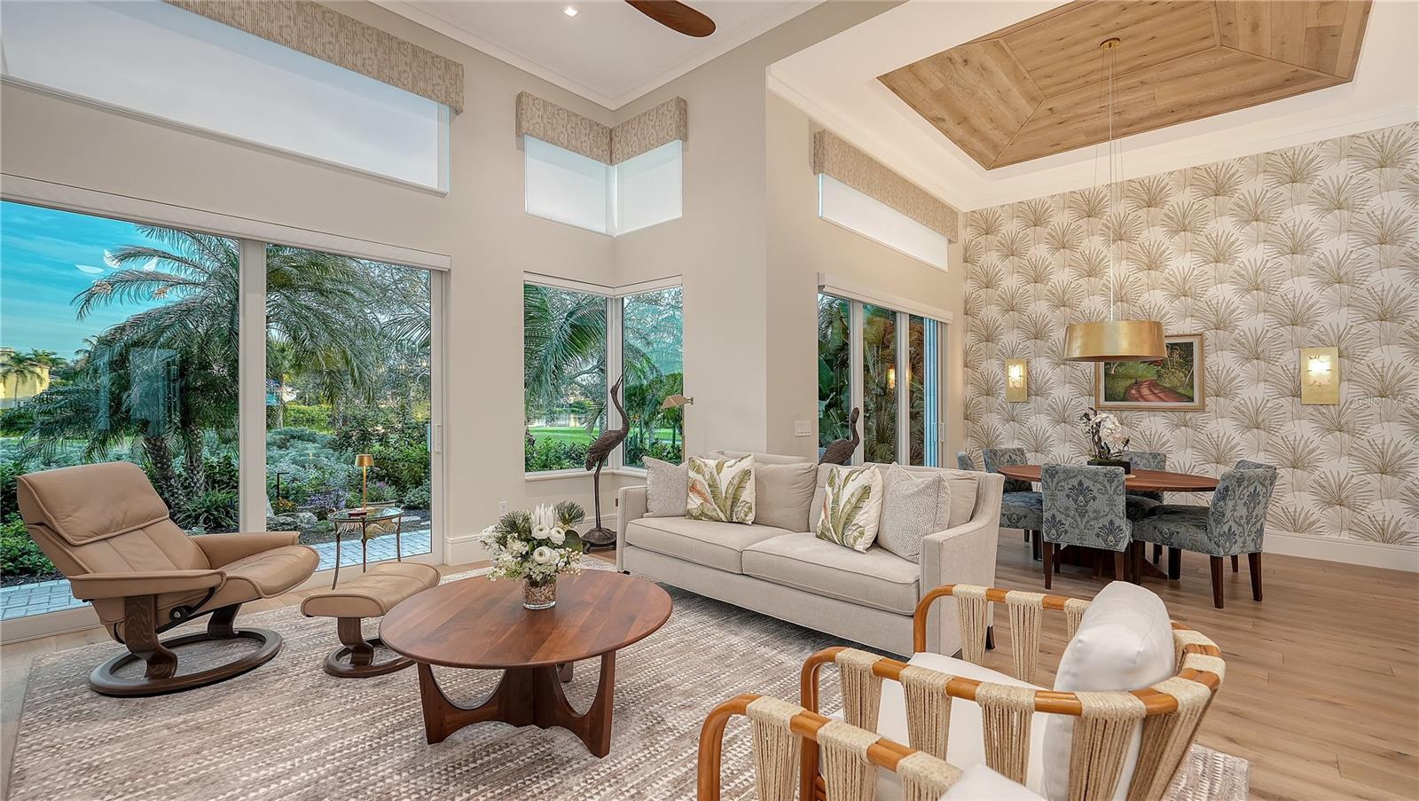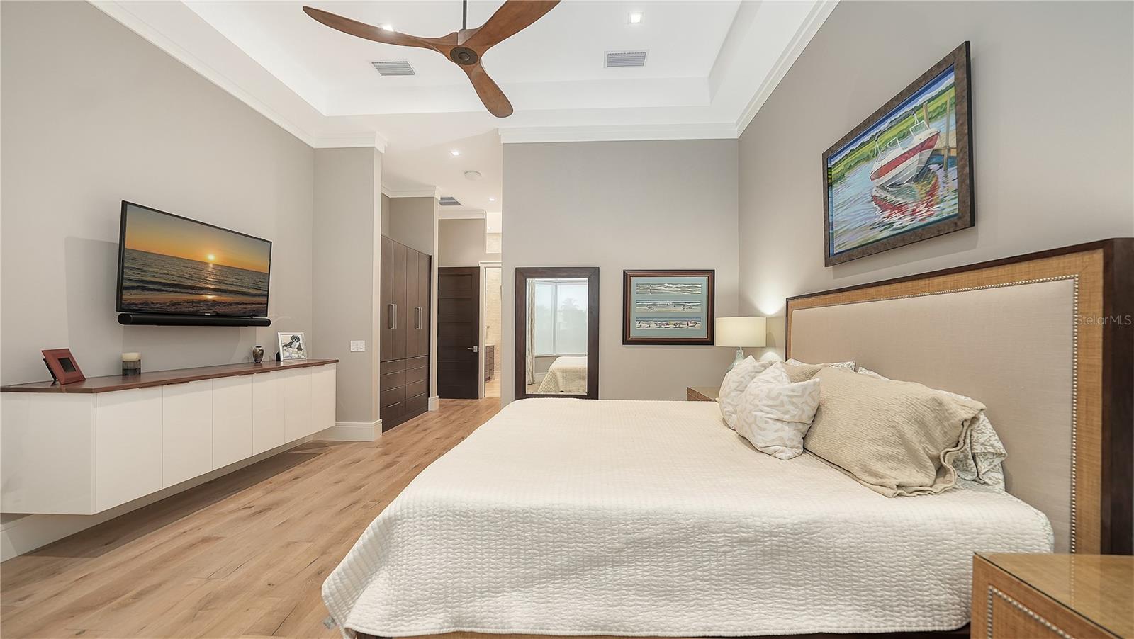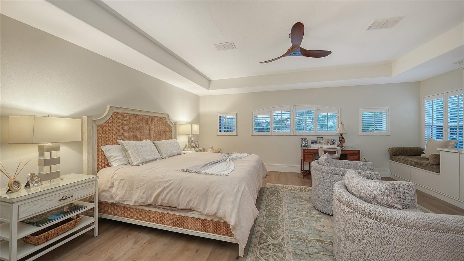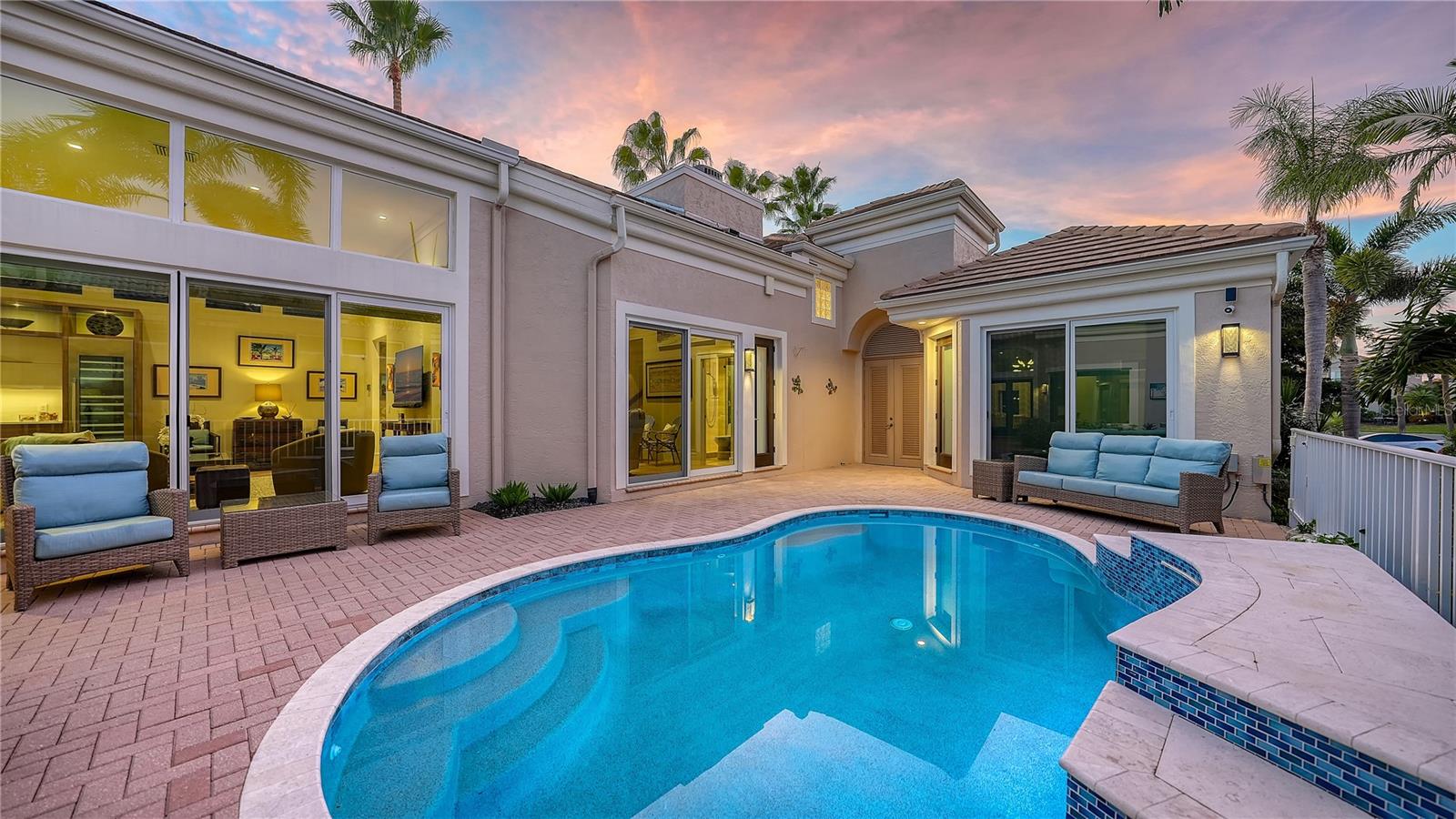 Situated within the gated Queens Harbour enclave of Bay Isles, this thoughtfully updated four-bedroom courtyard residence offers a refined blend of privacy, comfort, and waterfront living on Longboat Key. Designed around a lush central courtyard, the home creates an effortless indoor-outdoor flow anchored by a resurfaced swimming pool and new paver deck—an inviting retreat for everyday living or entertaining. A private cabana suite with its own entrance provides flexibility for guests or extended stays, enhancing the home’s functionality while maintaining separation from the main living areas. Entry begins through custom mahogany and glass double doors, opening to a reimagined open-concept interior with soaring 14-foot ceilings, wide-plank wood flooring, and carefully curated architectural detail throughout. The great room is centered around a travertine-encased electric fireplace and framed by walls of windows and glass sliders that capture tranquil lake views and abundant natural light. This space flows seamlessly into the formal dining area, highlighted by a statement chandelier and tongue-and-groove tray ceiling, and continues into the chef’s kitchen—designed as the heart of the home. The kitchen features a dramatic 14-foot quartz-topped island, custom designer cabinetry by Sarasota Architectural Woodworking, and newer Thermador appliances, including a five-burner gas cooktop, dual built-in ovens, pull-out pantry cabinetry, and a 48-inch stainless sink. Adjacent informal dining and family spaces include aquarium-style glass windows and an oversized wet bar with a full-size wine cooler capable of storing over 100 bottles. The primary suite, located on the main level, offers a peaceful lakefront setting with French-door access to the patio, custom built-in storage, and a walk-in closet. The spa-inspired bath was recently updated with dual quartz-topped walnut vanities, soaking tub, glass-and-stone shower, and private water closet. Also on the first floor are a versatile study overlooking the courtyard and a bonus room with an attached full bath that can serve as an additional bedroom or media space. The second level is dedicated to a private en-suite guest bedroom. Queens Harbour residents enjoy access to a heated Olympic-size pool and spa, along with deeded entry to the private Bay Isles Beach Club. Beyond the gates, Longboat Key’s lifestyle amenities are just minutes away, including the Longboat Key Club’s golf and tennis facilities, marinas, dining, and everyday conveniences. St. Armands Circle and downtown Sarasota’s cultural attractions—shopping, galleries, theaters, and waterfront dining—are easily accessible, completing the appeal of this well-positioned coastal residence.