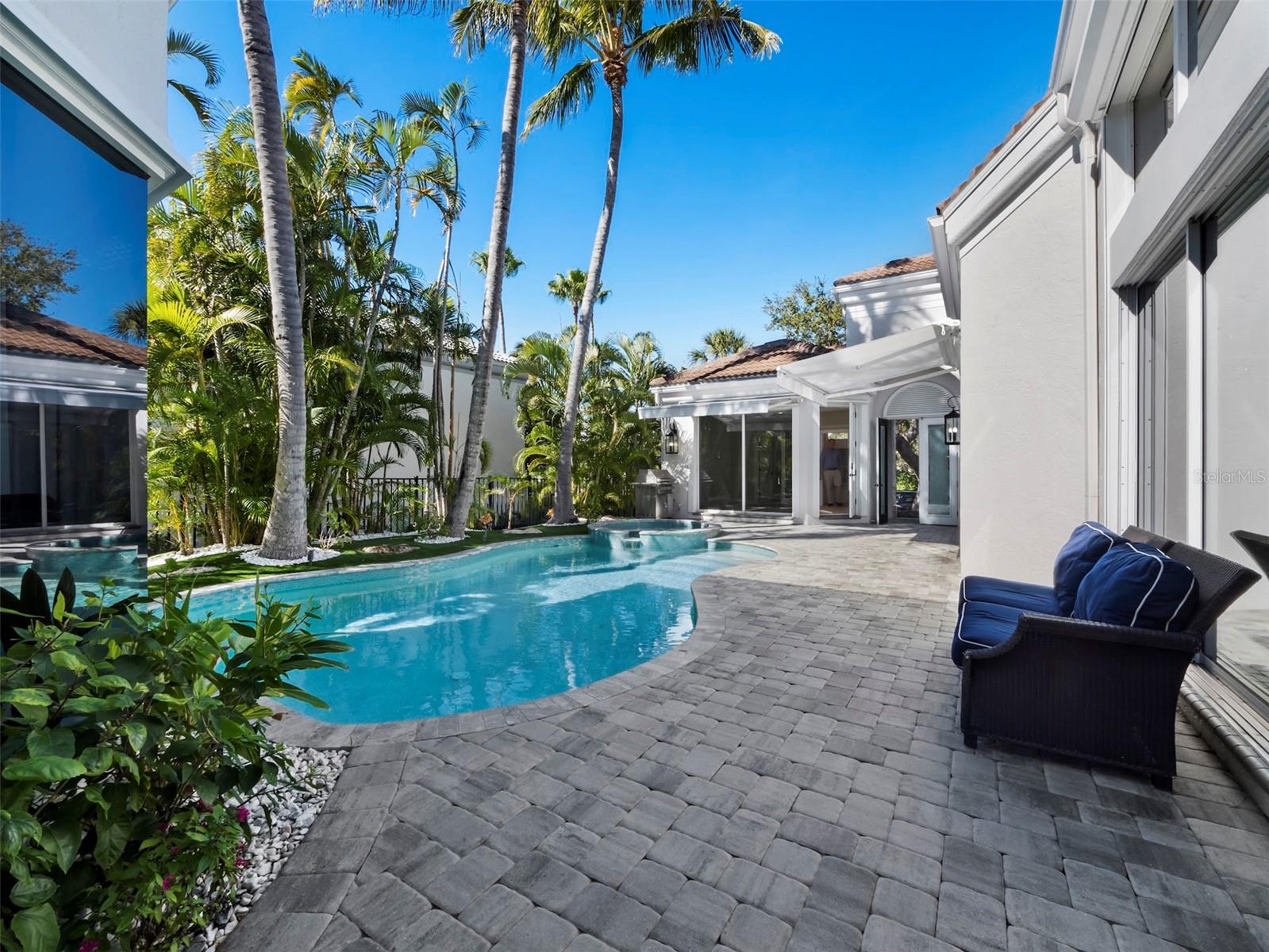Experience refined coastal living in this spectacular four-bedroom residence located in the prestigious Queens Harbor community of Bay Isles on Longboat Key. Behind the secure gates of Bay Isles, this beautifully updated home blends modern design with timeless elegance on the Harbourside golf course of the Longboat Key Club (Blue #5). Step inside to discover quality craftsmanship and thoughtful updates throughout, including engineered engineered hardwood flooring on the main level and a bright, open layout ideal for entertaining. The fabulous chef’s kitchen impresses with new shaker-style cabinetry, updated granite countertops, Dacor appliances, extended upper and lower cabinetry, a new beverage refrigerator, and an added ice maker—perfectly combining beauty and functionality. The spacious primary suite offers a serene retreat, while an additional second-level suite with en suite bath and generous bonus room adds flexibility for guests or family. A separate cabana suite also provides ideal privacy for visitors. The dedicated office features new, custom furniture, and the upper mezzanine area is newly furnished, offering a stylish secondary living space. Outdoors, enjoy resort-style living with a resurfaced and retiled pool, new pool pavers, upgraded pool equipment access, and lush landscaping enhancements between the pool, fence, and back patio. Relax or entertain by the new Paradise Grill and fire pit, or unwind under the roll out awnings in the beautifully furnished patio lounge area. Additional upgrades include new exterior and interior paint, lighting, ceiling fans, coach lights, feature wall with built-in television and electric fireplace, wine display wall, and epoxy coated garage flooring. Three HVAC systems (2018) and a 2021 water heater ensure year round comfort. Queens Harbor residents enjoy exclusive access to the Bay Isles Beach Club, offering private beach access and world-class amenities. Optional membership is available at the Longboat Key Club for golf, tennis, and marina privileges. This exceptional property represents the best of Longboat Key living—sophisticated, comfortable, and move in ready. Schedule your private showing today.