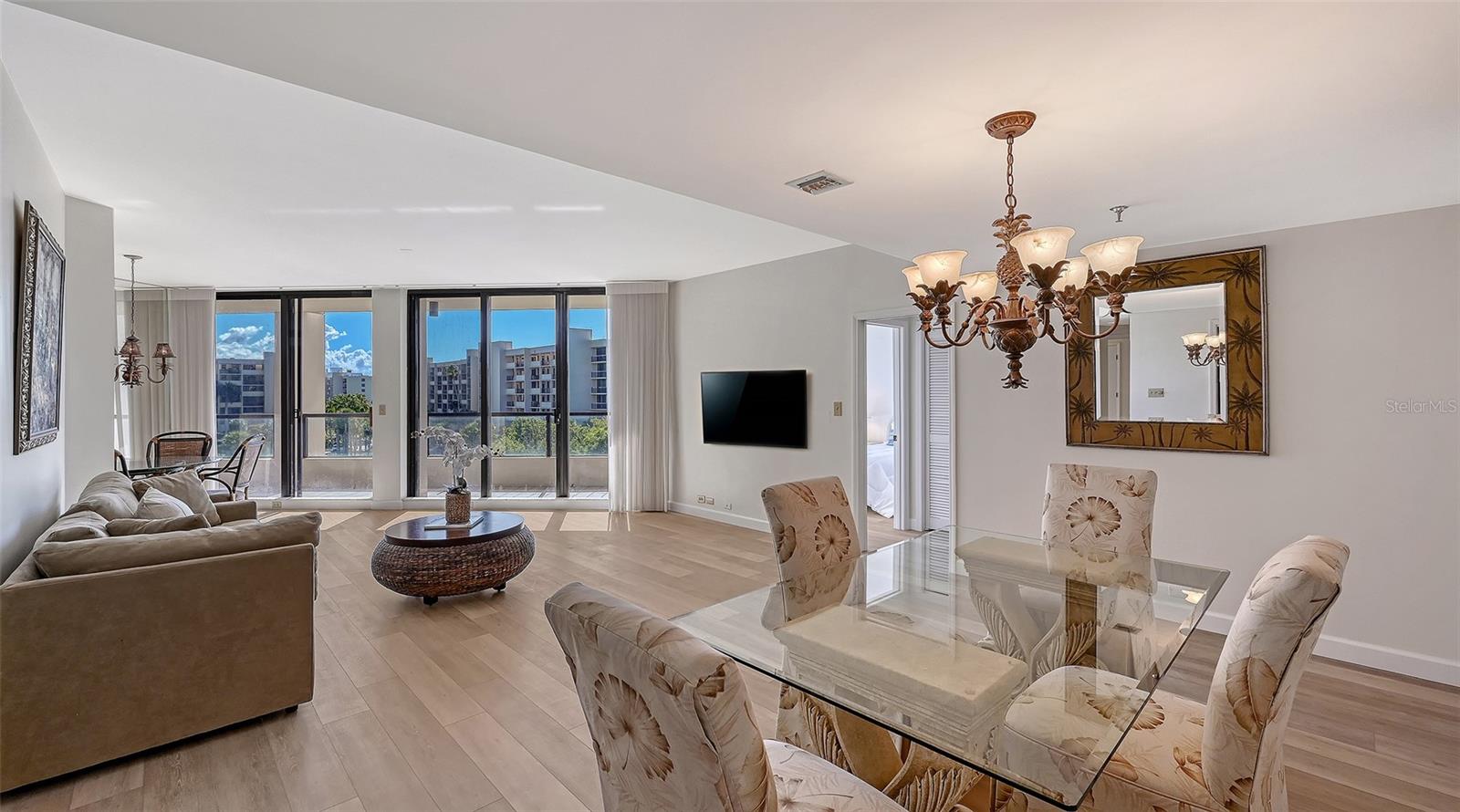 Welcome to this 2-bedroom 2 bath gulf-side residence in the Promenade on Longboat Key, where shimmering water views, swaying palms, and warm coastal breezes shape a lifestyle of relaxed sophistication. A welcoming foyer introduces freshly painted interiors and brand-new luxury vinyl wide-plank flooring, guiding you toward the main living room, where gulf and garden views take center stage. This light-filled space flows beautifully to the outdoors through two sets of sliders that open onto the balcony. The kitchen features wood cabinetry and granite counters, and the adjacent dining room features a granite topped wet bar. The primary suite is a serene retreat with lovely Gulf and garden views, a spacious dressing area, two walk-in closets, and an ensuite bath featuring a marble steam shower and spa tub. A desirable split plan provides privacy for the guest bedroom and marble guest bath. Additional conveniences include a full-size laundry closet with storage shelving, 1 assigned parking space in the secure under-building parking garage, and additional assigned storage space. Life at the Promenade is defined by exceptional amenities and a setting designed for daily enjoyment on the Gulf. The property spans more than 6 acres of landscaped grounds with a boardwalk that winds through tropical foliage to the white sand beach, where inviting tiki huts offer a peaceful, shaded place to relax by the gulf. Residents enjoy an oversized heated pool, whirlpool spa, new covered outdoor kitchen/grilling area, gulf side sundeck, inviting lobby spaces, concierge services, on-site management, a beachside gazebo, secure guard gated entry with twenty-four-hour security, an athletic center, 4 Har-Tru tennis courts, and beautifully appointed gathering spaces including the Sunset Room and Sunrise Room. Longboat Key living offers a rare blend of natural beauty, coastal elegance, and everyday convenience. Residents enjoy pristine beaches, gulf breezes, and a serene island atmosphere, all while being just moments from the vibrant cultural scene of Downtown Sarasota, the shopping and dining of St. Armands Circle, and easy access to SRQ Airport.