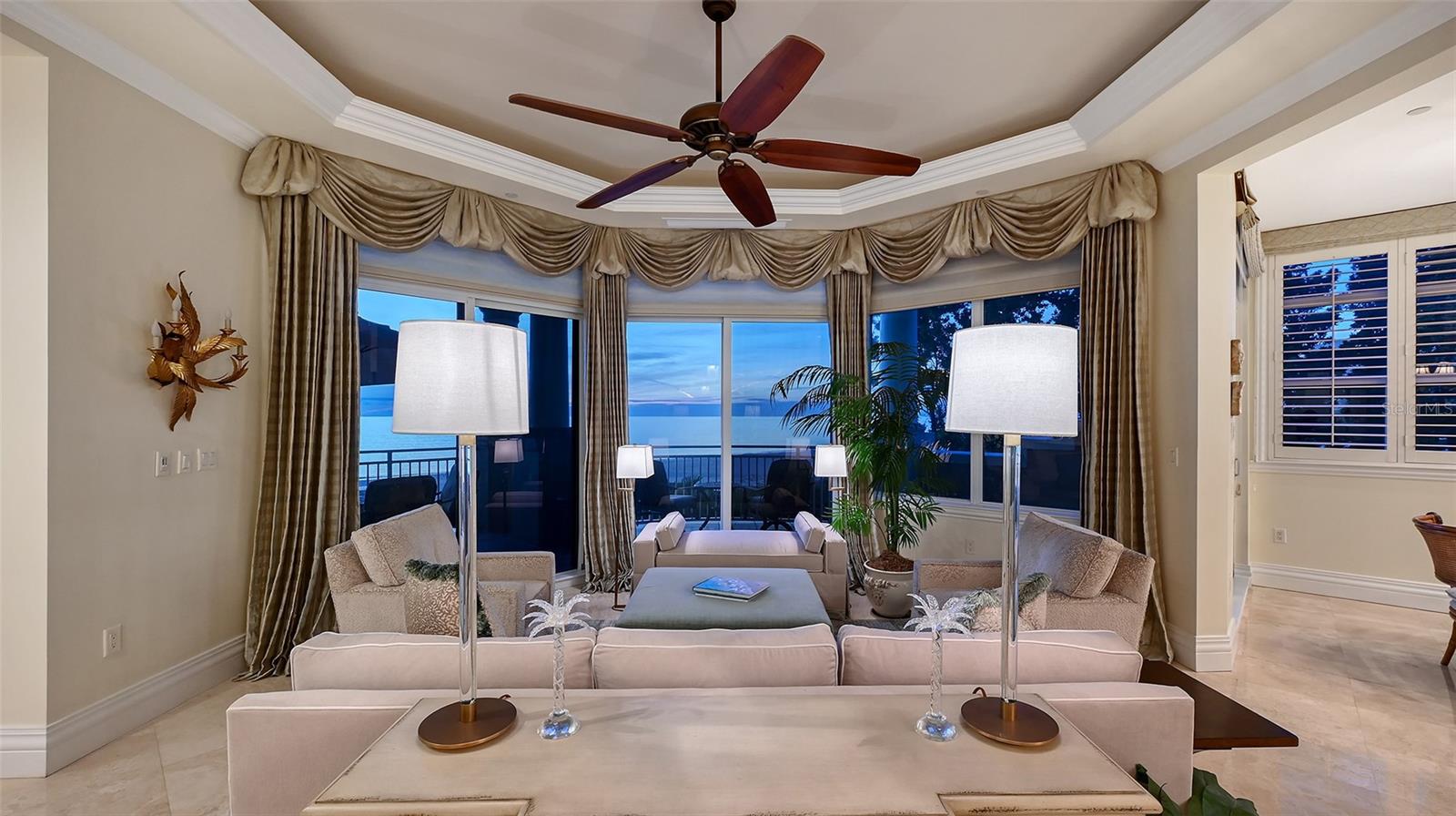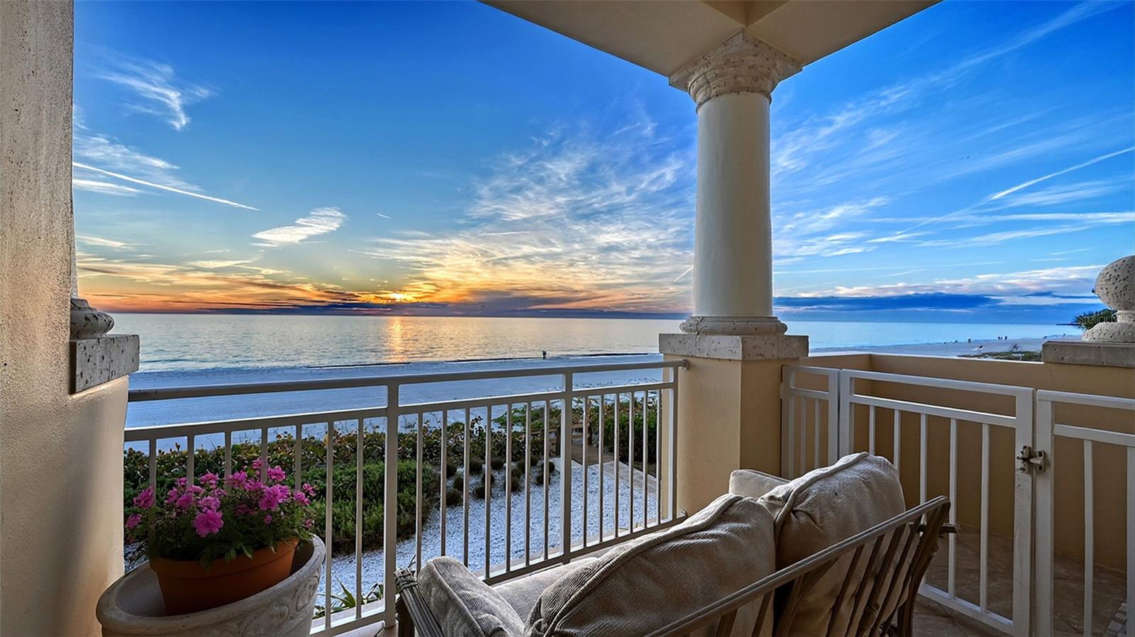 Spectacular Gulf of Mexico views define this exceptional three-bedroom, three-and-a-half-bath residence that lives like a single-family home. A large wraparound terrace with a built-in grill offers seamless indoor-outdoor living, and private steps leading directly to the sandy beach – perfect for sunset entertaining or morning walks along the shore. Enter the home through a private elevator into a formal foyer with double door entry into the residence. The gracious living room is framed by expansive windows showcasing endless water views and exceptional sunsets flowing effortlessly to a built-in wet bar complete with wine refrigerator, ice maker, and a dedicated desk area—ideal for entertaining or casual work-from-home moments. A formal dining room with elegant ceiling detail makes hosting a dinner party a treat. Plantation shutters throughout the residence add a coastal and private touch. The gourmet kitchen is designed for both function and style, offering a large island for gathering, side-by-side Sub-Zero refrigerator and freezer, Wolf gas cooktop, Wolf oven with warming drawer, generous pantry, and a cozy desk area for browsing favorite recipes. A large center island and charming breakfast nook are the perfect spots for morning coffee or casual meals. Adjacent to the kitchen, the inviting keeping room opens to a private east-facing terrace with beautiful sunrise and views of Sarasota Bay. The expansive owner’s suite is a true retreat, featuring its own breakfast bar with sink and refrigerator for enjoying morning coffee while overlooking the Gulf. Two oversized, custom-built walk-in closets provide exceptional storage. The spa-inspired bath includes double vanities, a glass-enclosed shower, a private water closet with bidet, and refined finishes throughout. Two en-suite guest bedrooms with large custom-built closets open onto a private terrace with views of Sarasota Bay, ensuring comfort and privacy for family and guests alike. This rare beachfront residence combines luxury, privacy, and the ease of coastal living, all with breathtaking views and thoughtfully designed spaces for everyday enjoyment and elegant entertainment. Residents of La Firenza enjoy a boutique, gated setting with private beach access, a heated beachfront pool and spa, fitness facilities and secure garage parking.
