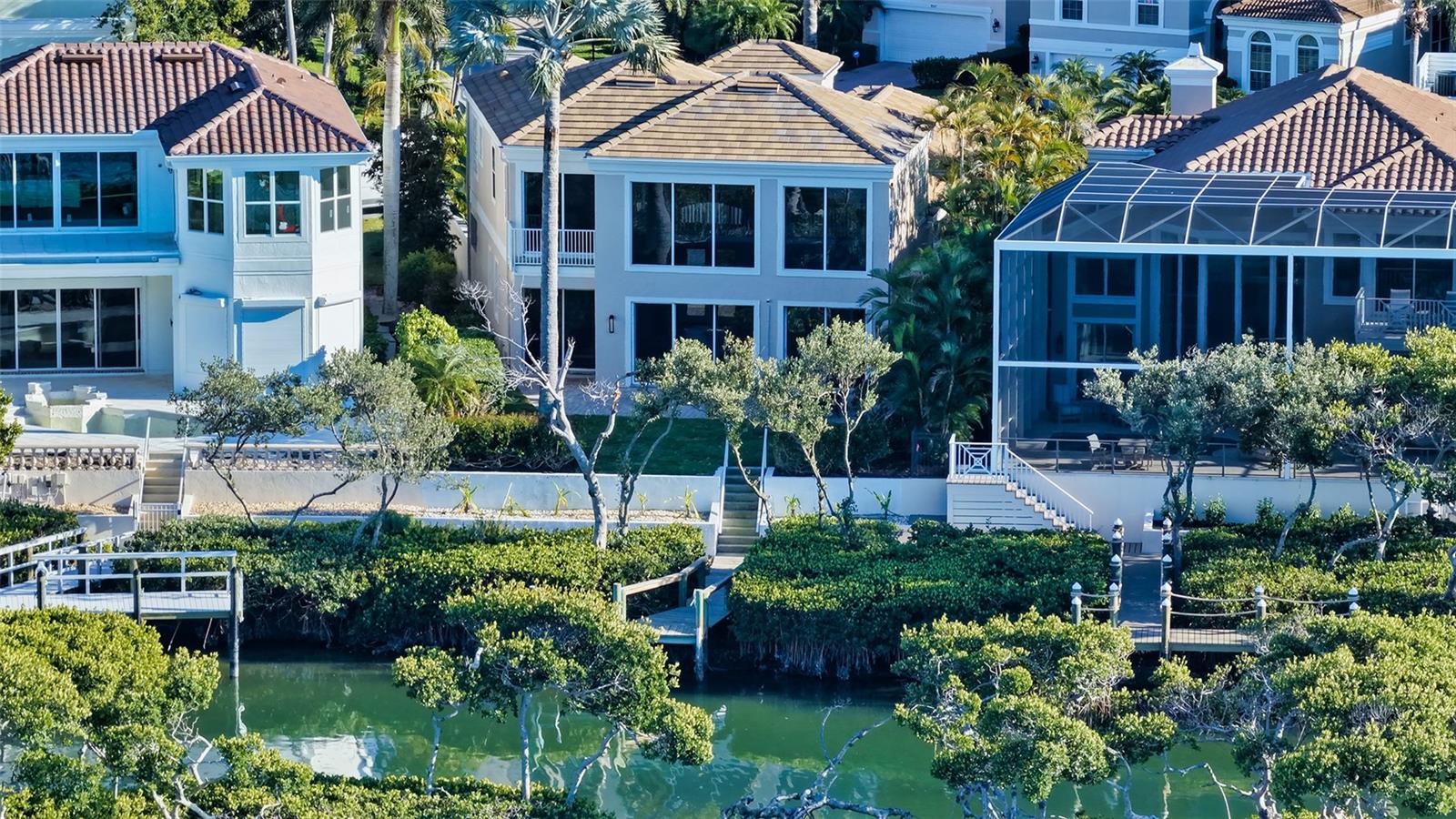 Located within the gated Queens Harbour enclave in Bay Isles, this direct bayfront residence offers a well-designed courtyard-style floor plan with water views, flexible living spaces, and a private dock—set on a quiet cul-de-sac in one of Longboat Key’s most established communities. Spanning approximately 3,470 square feet of living space across two levels, the home features four bedrooms, four full baths, and one half bath, with a layout that prioritizes privacy and functionality. The first floor hosts three en-suite guest bedrooms, a dedicated office, and the main living areas, while the entire second floor is reserved for the primary suite, creating a true owner’s retreat. The main level welcomes you with an open living and dining arrangement highlighted by cathedral ceilings, tile flooring, and walls of sliding glass doors that open to the bayfront patio. This seamless indoor-outdoor connection frames tranquil water views, ideal for relaxing or entertaining. The formal dining space also enjoys bayfront exposure and flows naturally into the kitchen. The kitchen is thoughtfully positioned for daily living and gatherings, offering solid wood cabinetry, stone countertops, a center island, breakfast bar seating, pantry storage, and a full suite of stainless-steel appliances. Adjacent family and living spaces enhance the home’s livability while maintaining clear sightlines to the water. Two of the first-floor guest bedrooms include en-suite baths, while a third guest suite—a private cabana across the pool courtyard—offers flexibility for visiting family or multi-generational living. The office is also located on the first level, providing the ideal amount of separation. Upstairs, the primary suite occupies the entire second floor, offering privacy and elevated views. This retreat features a spacious bedroom, walk-in closet, and a well-appointed en-suite bath with dual sinks, soaking tub, separate shower, and private water closet. Outdoor amenities include a private pool courtyard, open dock with direct bay frontage, providing access for boating and paddle sports. A new tile roof was installed in 2023, and the property includes a two-car garage. Queens Harbour residents enjoy a maintenance-free lifestyle with 24-hour guard-gated security, community tennis courts, and a heated pool and spa located just across the street. Ownership also includes deeded access to the private Bay Isles Beach Club, offering Gulf-front pavilions, grilling areas, and pristine beaches just minutes away. Perfectly positioned behind the gates of Bay Isles, this residence is close to Harbourside Golf & Marina, the Longboat Key Club, and island dining. St. Armands Circle, Lido Beach, and downtown Sarasota are all within easy reach, providing access to shopping, waterfront restaurants, cultural venues, and year-round events. A well-located bayfront opportunity offering space, privacy, and a flexible floor plan in one of Longboat Key’s most desirable communities.