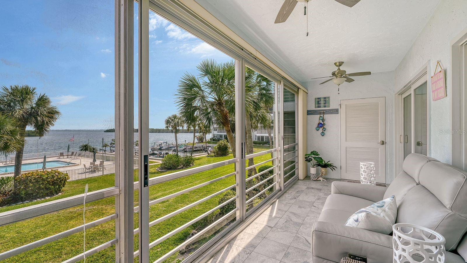 This is the one you have been waiting for!! INCREDIBLE UNOBSTRUCTED BAY VIEWS & BREATHTAKING SUNRISES from this light-filled CORNER unit in the beach-to-bay community of Sutton Place. Enjoy stunning vistas from nearly every room through impact windows and doors! Meticulously maintained and beautifully renovated, this spacious two-bedroom, two-bath coastal retreat is truly exceptional. The thoughtfully designed open concept chef’s kitchen with premium cabinetry, plentiful storage, and Cambria quartz countertops seamlessly connects to the expansive living area through a custom dining island with wraparound seating. Plantation shutters throughout the kitchen and living area add to the coastal island feel. The enclosed lanai, featuring walls of glass that span along the rear of the unit, provides an ideal setting for morning coffee, evening relaxation, remote work, or accommodating additional guests. The spacious primary and secondary bedrooms provide exceptional views, each with direct access to the lanai through impact-rated sliding doors. The serene primary bedroom boasts a generous walk-in closet fitted with a custom organizer and an elegantly renovated bathroom with a walk-in shower, complete with a linen closet. The secondary bedroom offers ample storage with a double closet, also fitted with custom organizers. The adjacent guest bath has been tastefully renovated. Parking is easy with a covered, assigned space in a convenient location, plus plenty of overflow and guest parking. While the stairs are easily accessible; there is also an elevator for added convenience. The in-building storage unit provides extra space for any additional storage needs. Sutton Place offers a wide range of amenities, including two heated swimming pools, a community clubhouse, marina facilities with boat slips (current wait list but only $300 annually!!), kayak storage equipped with electric launch, a fish cleaning station, designated grilling areas, car wash stations, and deeded beach access with private beach pavilion featuring storage lockers, showers, and restrooms. The community successfully endured the recent storms, experiencing minimal overall damage and no impact to any individual units. With its exceptional location, unmatched views, and wonderful amenities, this property is an opportunity not to be missed! Schedule your private showing today!