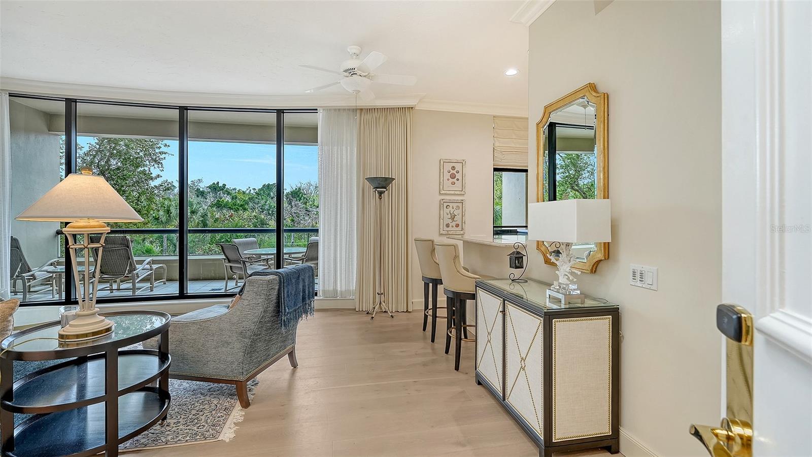 Welcome to a little piece of paradise on Longboat Key at the stunning gated Gulf-front condominium community of Water Club, which offers a coastal lifestyle complete with direct access to sandy beaches, high-end amenities and exceptional security and concierge services. This designer-inspired, furnished two-bedroom, 2.5-bath condominium is on the newer north building's plaza level and features nearly 1,400 square feet, 10-foot ceilings, double crown molding, plank wood flooring in the living areas, natural colors and floor to ceiling storm impact windows and doors. An open floor plan offers garden views from the spacious living room and the kitchen, which has both a breakfast bar and a seating area. A beautiful kitchen renovation was completed in December 2025 with handsome wood cabinets, stone countertops and GE Profile appliances. The split plan allows privacy for owners and guests in the two separate primary en-suite bedrooms, each with large windows, custom drapes and carpet, wall closets with built-ins and baths with combination tub/showers. ?An expansive balcony with glass railing barriers can be accessed through the living area and one of the primary suites. This lovely condo conveniently has a stack washer and dryer, linen closet, underbuilding storage unit and assigned parking and its own front desk concierge. Behind the 24-hour guarded-gate is true luxury living with a modern clubhouse, state-of-the-art fitness room, locker room and spa, sauna, bar and lounge, library, game room, ballroom and catering kitchen and outside terrace for gatherings and watching sunsets over the Gulf waters. Besides the magnificent beach and Florida-friendly landscaped grounds, the outdoor amenities include a peaceful courtyard, fire pit, resort-style pool and hot tub and new Har-tru tennis courts. Water Club is conveniently near island golf courses and Publix, and a short distance from St. Armands Circle and downtown Sarasota for dining, shopping, entertainment and cultural venues.