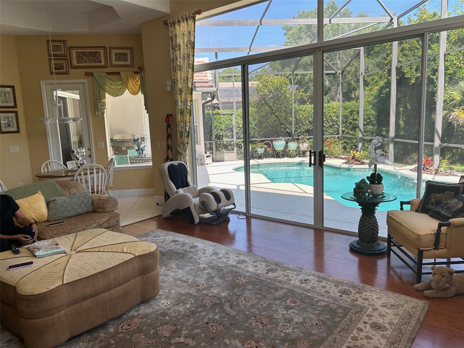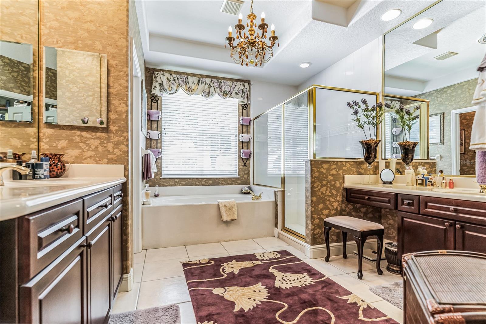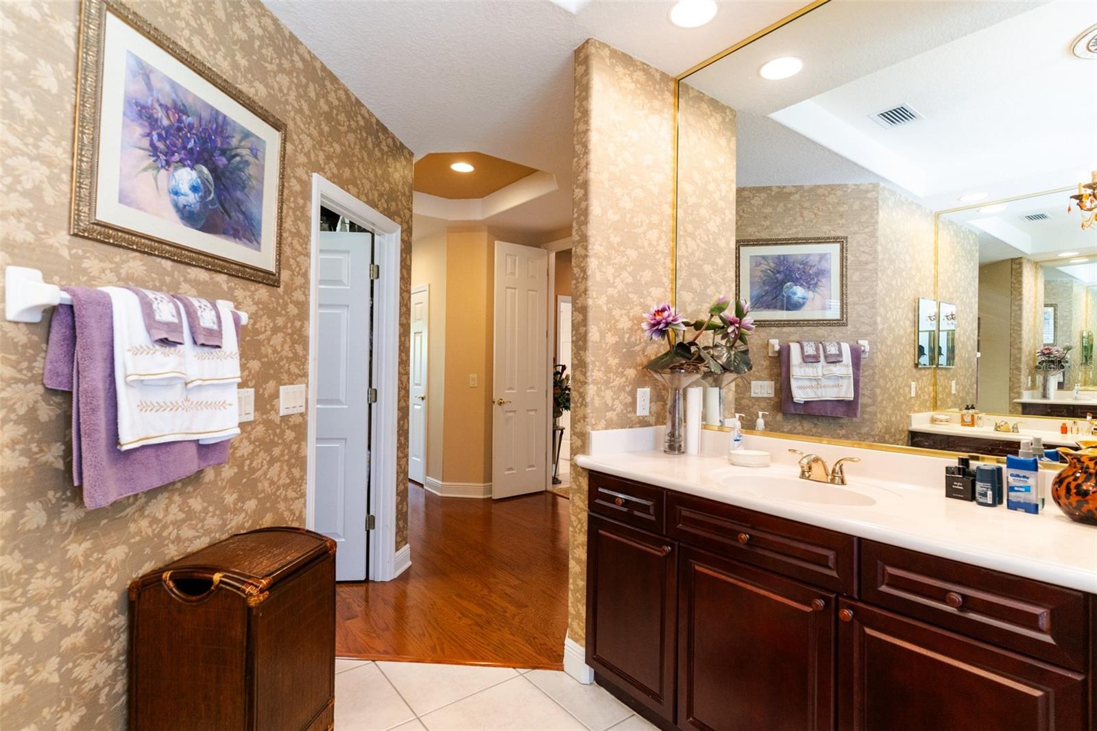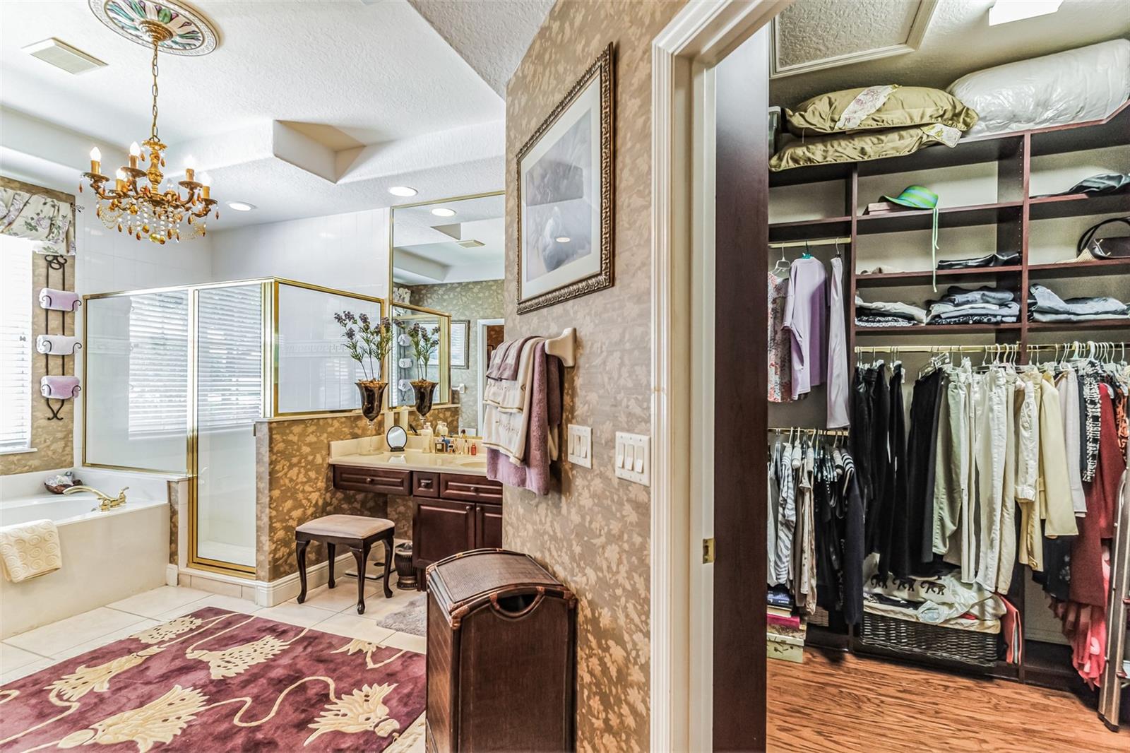 This gorgeous retreat is nestled in Alaqua Lakes amongst the Tom Fazio design 18 hole golf course and tennis community. The custom features of this designer home will envelope your senses and garner your attention as you enter. As you open the front door your eyes will be drawn to the inviting living room adorned with silk drapery at the sides of the massive sliding glass doors that gives you a view of the swimming pool and the magnificent forestry of trees at the back of the house, that emanate from the conservation of nature in its truest form. The current owners spared no expense on the custom finishes. Natural light flows throughout the home and the high 12 feet ceilings along with openness of the floor plan is ideal for entertaining. The floor plan has the Owners Primary Suite to the left as you enter the house, another suite and 3rd bedroom is to the right, and there are a total of 4 full bathrooms. The office/optional 4th bedroom with French doors located to the left as you enter the house, looks out onto the beautiful landscaped yard. The room has custom built-in shelving and arches, ideal for remote work. The windows in all common areas are tinted to let in natural light whilst blocking heat and glare and protecting furnishings from fading. The Owners Primary Suite to the left of the house is separated by its own hallway. The suite boast his and hers custom made built-in closet by closet maid. The bathroom has a Jacuzzi soaker tub for two, separate showers, His and Hers vanity. Her vanity is made with space for a make-up bench. The toilet has its own private room. The owner’s suite has access to the screened Lanai and pool. To the right side of the home the other suite is a vast expanse of space with its own bathroom that includes a double vanity, shower and bath combination and a custom built-in linen closet. The 3rd bedroom comes with a custom Walkin closet and has a dedicated bathroom with double vanity and shower and bath combination. The 4th full bathroom serves guests and can be accessed from the pool. The formal dining room is across from the formal living room which leads to the family room and kitchen with 45-inch cabinets. The family room has a vast custom-made picture window, with custom built entertainment cabinets and fireplace. The flooring in all primary rooms and bedroom is finished with gleaming Mohawk hardwood floors. The laundry room is decked out with custom cabinetry that includes a broom closet. The bright and airy laundry room leads to a 3-car garage and in the garage there is a pull down step that leads you to ample storage above the garage. The expansive lanai made for outdoor entertaining with it's own custom made built in stainless steel grill and stainless steel sink makes clean up a breeze. Shops and Restaurants for dining out are just a few minutes away. Easy access to I-4 going East will take you to Daytona Beach and Daytona Racetrack, and going West will take you to Disney World. All of this beauty is enclosed in a manned 24 hr. security gate. Bedroom Closet Type: Walk-in Closet (Primary Bedroom).