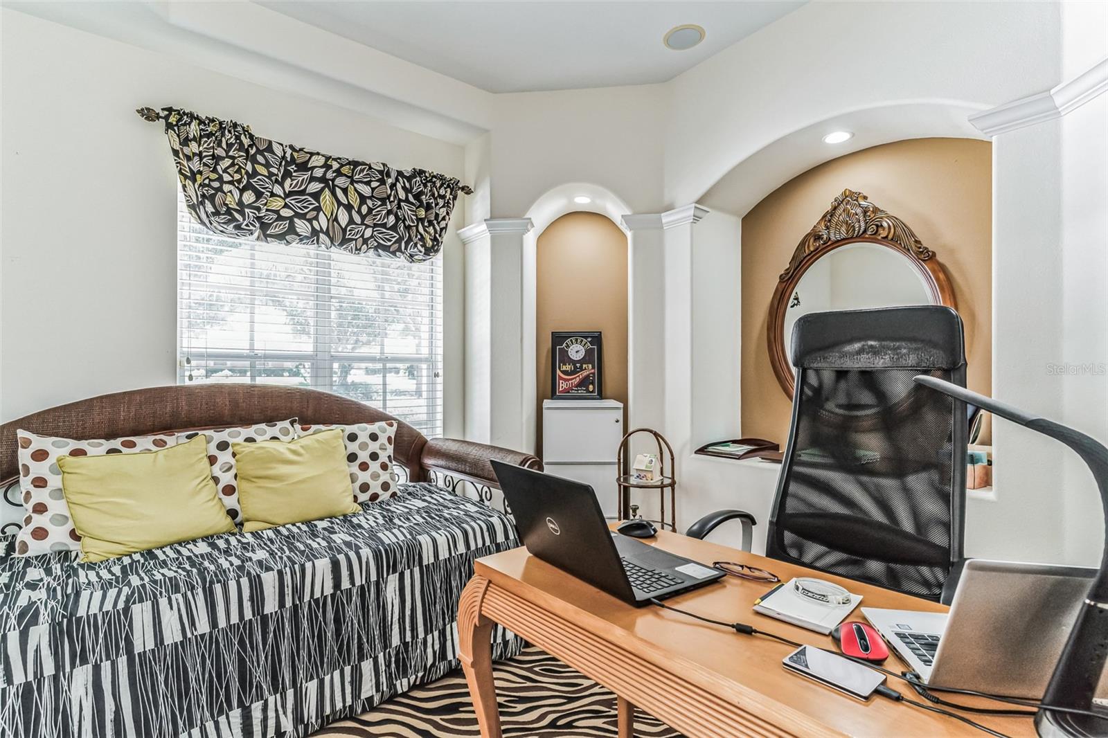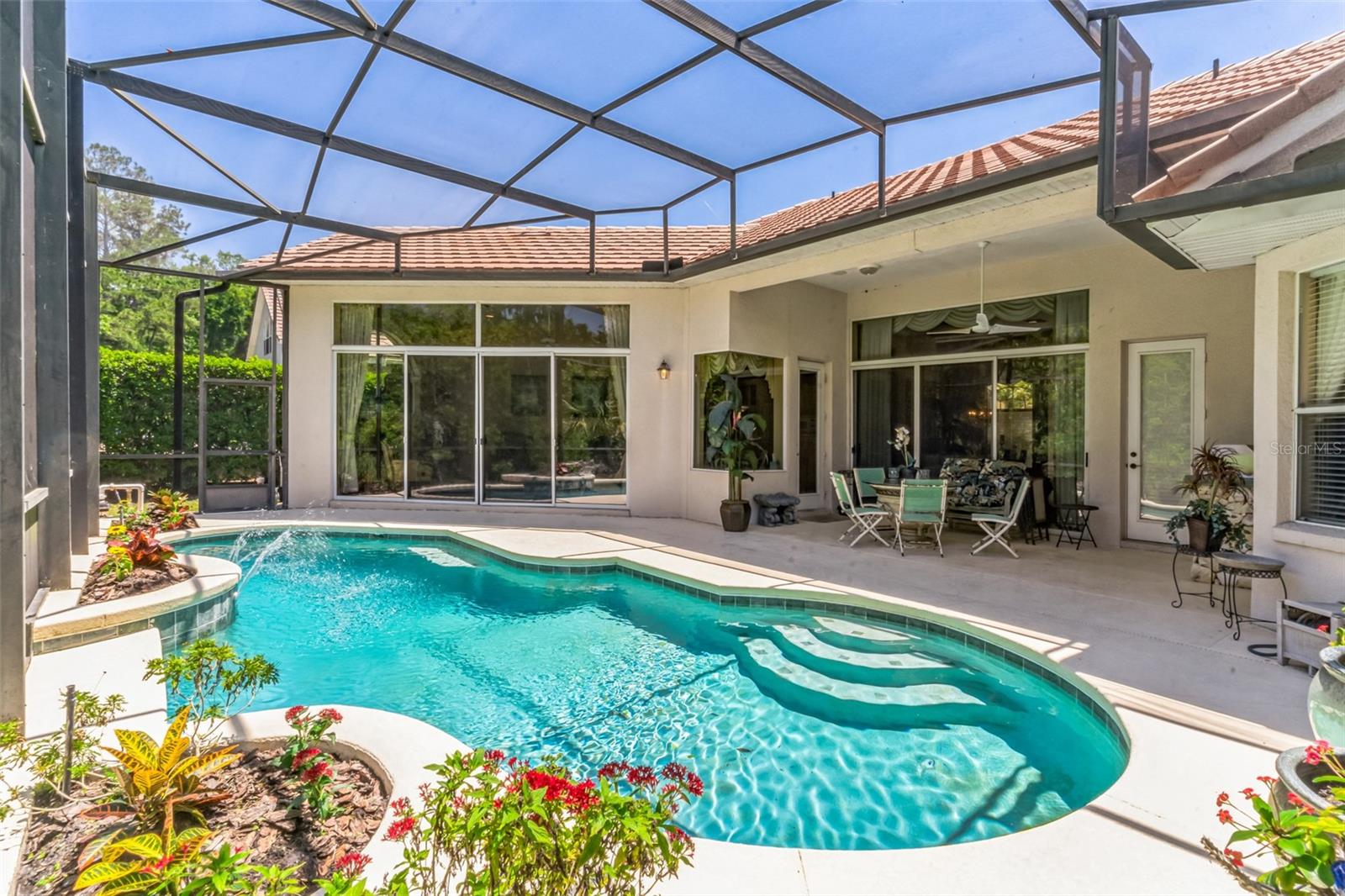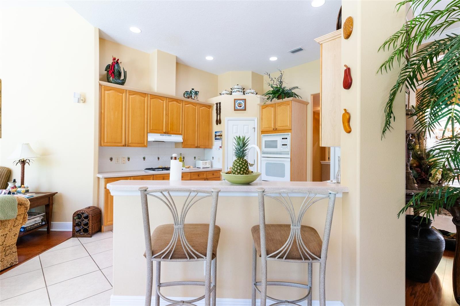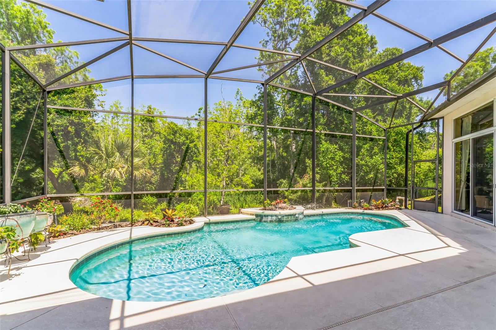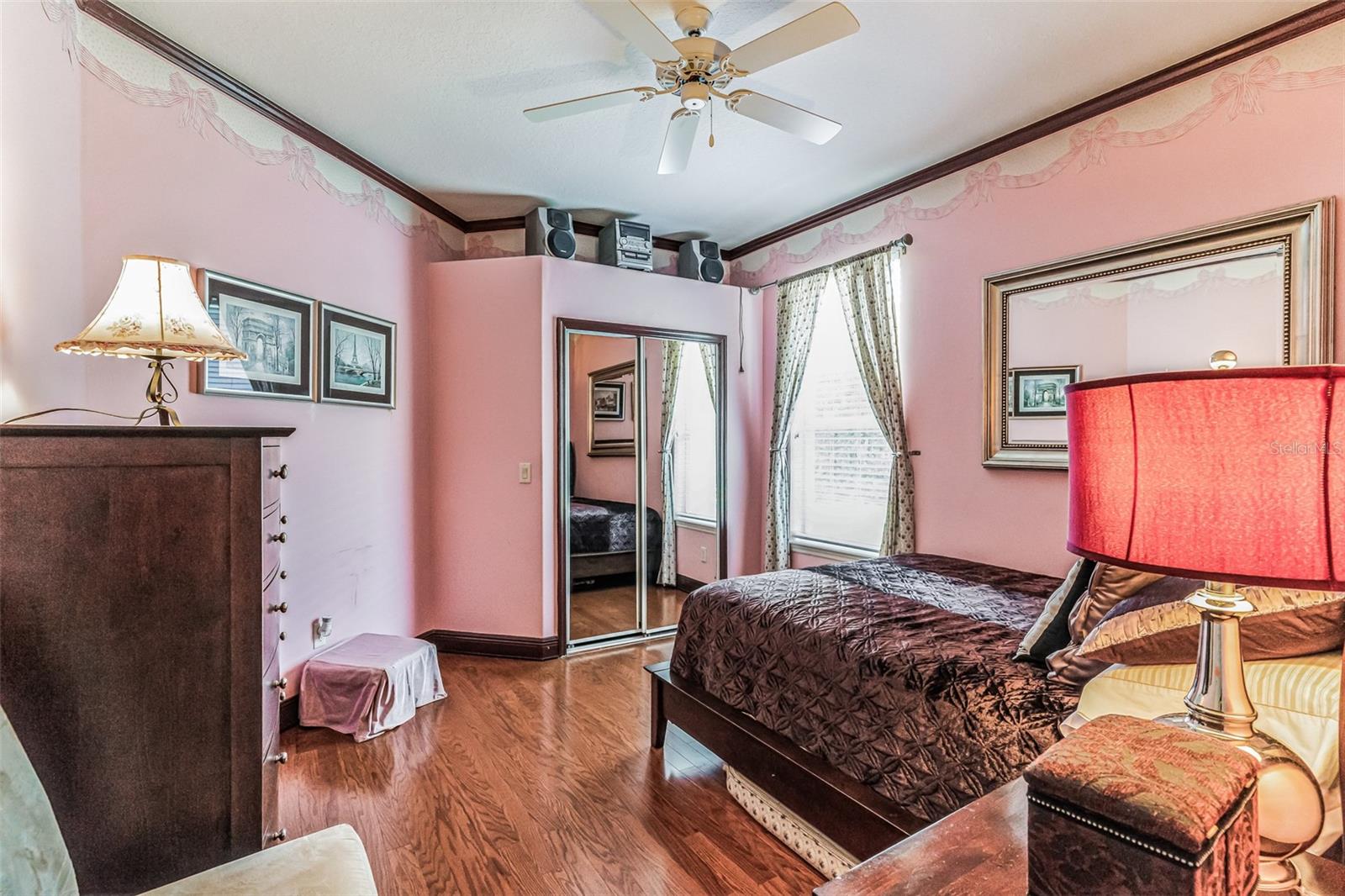 This gorgeous retreat is nestled in Alaqua Lakes amongst the Tom Fazio design 18 hole golf course and tennis community. The custom features of this designer home will envelope your senses and garner your attention as you enter. As you open the front door your eyes will be drawn to the inviting living room adorned with silk drapery at the sides of the massive sliding glass doors that gives you a view of the swimming pool and the magnificent forestry of trees at the back of the house, that emanate from the conservation of nature in its truest form. The current owners spared no expense on the custom finishes. Natural light flows throughout the home and the high 12 feet ceilings along with openness of the floor plan is ideal for entertaining. The floor plan has the Owners Primary Suite to the left as you enter the house, another suite and 3rd bedroom is to the right, and there are a total of 4 full bathrooms. The office/optional 4th bedroom with French doors located to the left as you enter the house, looks out onto the beautiful landscaped yard. The room has custom built-in shelving and arches, ideal for remote work. The windows in all common areas are tinted to let in natural light whilst blocking heat and glare and protecting furnishings from fading. The Owners Primary Suite to the left of the house is separated by its own hallway. The suite boast his and hers custom made built-in closet by closet maid. The bathroom has a Jacuzzi soaker tub for two, separate showers, His and Hers vanity. Her vanity is made with space for a make-up bench. The toilet has its own private room. The owner’s suite has access to the screened Lanai and pool. To the right side of the home the other suite is a vast expanse of space with its own bathroom that includes a double vanity, shower and bath combination and a custom built-in linen closet. The 3rd bedroom comes with a custom Walkin closet and has a dedicated bathroom with double vanity and shower and bath combination. The 4th full bathroom serves guests and can be accessed from the pool. The formal dining room is across from the formal living room which leads to the family room and kitchen with 45-inch cabinets. The family room has a vast custom-made picture window, with custom built entertainment cabinets and fireplace. The flooring in all primary rooms and bedroom is finished with gleaming Mohawk hardwood floors. The laundry room is decked out with custom cabinetry that includes a broom closet. The bright and airy laundry room leads to a 3-car garage and in the garage there is a pull down step that leads you to ample storage above the garage. The expansive lanai made for outdoor entertaining with it's own custom made built in stainless steel grill and stainless steel sink makes clean up a breeze. Shops and Restaurants for dining out are just a few minutes away. Easy access to I-4 going East will take you to Daytona Beach and Daytona Racetrack, and going West will take you to Disney World. All of this beauty is enclosed in a manned 24 hr. security gate. Bedroom Closet Type: Walk-in Closet (Primary Bedroom).