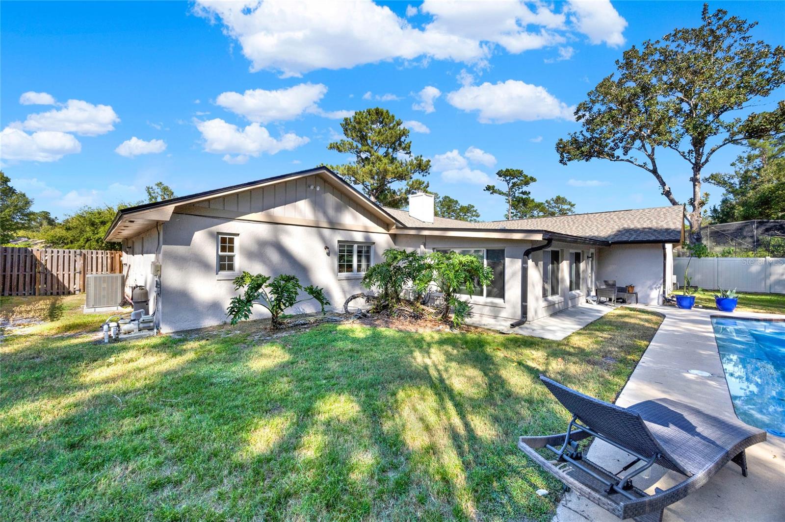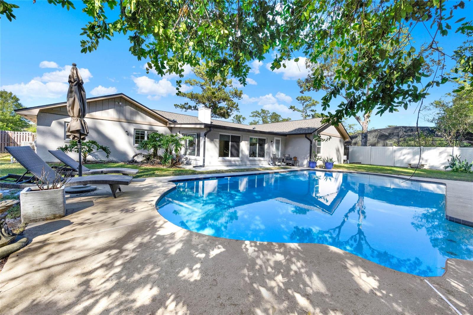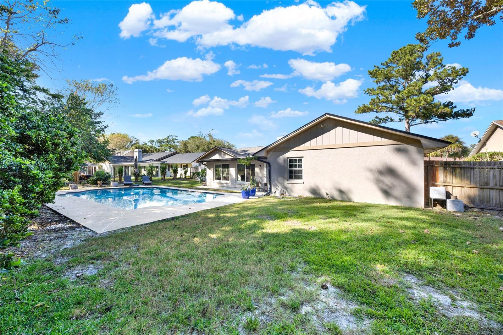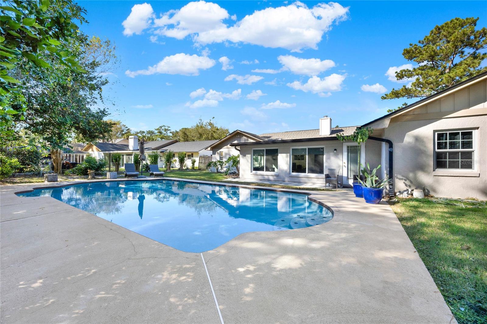 Don't miss seeing this lovely home in gorgeous Sweetwater Oaks! As you tour, take note of the large rooms throughout the house! This four-bedroom, two-bath, split floor plan features spacious rooms offering flexibility to use the space to suit your needs! As you enter, a large Dining Room is to your right, and an even larger Living Room is to your left. The Dining Room can accommodate a sizable table, and there is plenty of wall space for furniture. The Living Room would also make a great office/flex space. The cozy Family Room has SOARING VAULTED CEILINGS, WOOD BEAMS, and a STONE FIREPLACE. The Kitchen offers gleaming stainless steel appliances, abundant cabinet space, and room for a table. The primary suite has ample room for a king-size bed with room to spare. The second bath was beautifully remodeled and is located conveniently near the additional 3 bedrooms. A big, Sun Room gives you yet another wonderful living space and leads out to your backyard oasis! Venture outside to enjoy the HUGE OVERSIZED LAP POOL, which is great for exercise and water games. With its tree-lined streets and sidewalks, Sweetwater Oaks offers exclusive private amenities and top-rated schools. Enjoy the private beach on the shores of Lake Brantley, tennis, pickleball, and basketball courts, 2 playgrounds, 2 covered pavilions, a volleyball court, a fishing dock, a soccer field, a baseball field, a boat ramp, access to the Wekiva River by canoe, kayak or paddle board, and a community center that is available to rent for parties and special occasions. The BIG Ticket Items have been done for you! ROOF WAS REPLACED IN 2022, the A/C IN 2024, the POOL RESURFACED in 2022, the windows were replaced with PELLA WINDOWS throughout the home, a new rear fence was just installed, and a new garage door is on order to be installed in July!!!