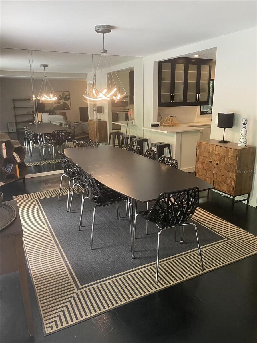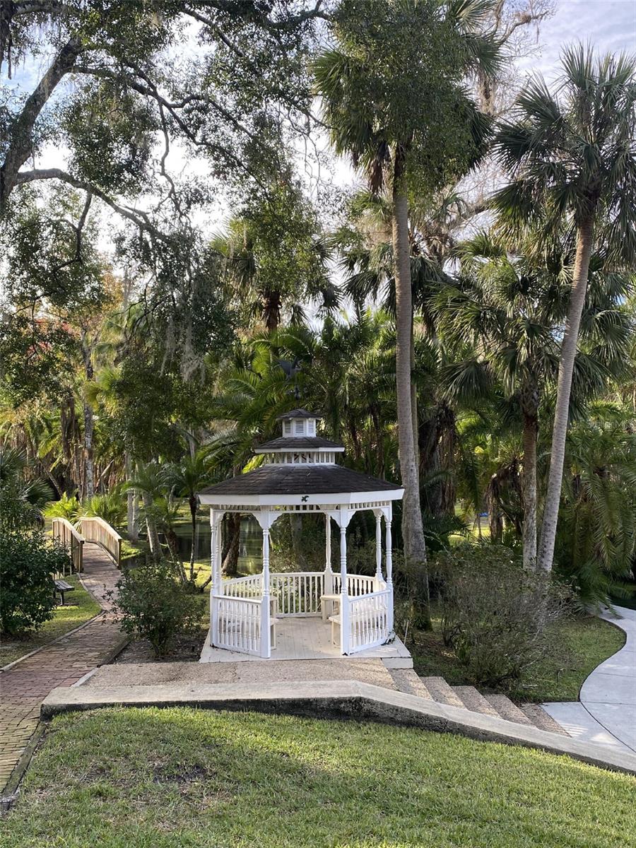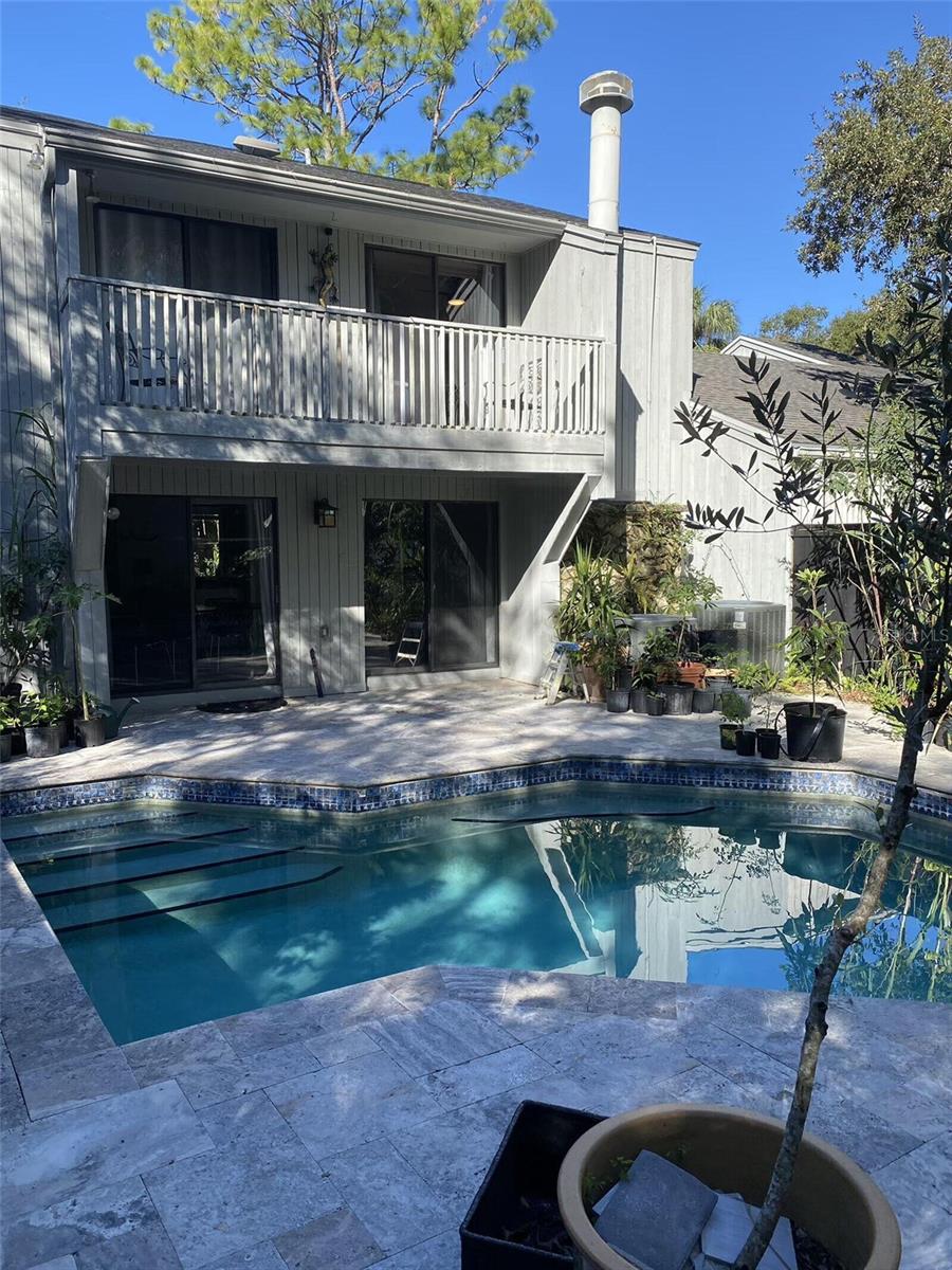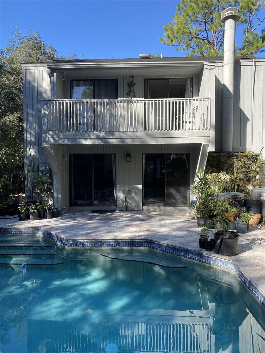 Nestled in the lush, wooded, highly sought-after enclave of The Springs in Longwood, this stunning 4-bedroom, 2.5-bath townhouse boasts character, comfort, and convenience, being sold by the owner. With a versatile bonus room featuring a cozy working wood stove, this space can transform into a 4th bedroom, family area, or your dream retreat. Gorgeous hardwood floors grace the stairs and upper level, while chic stained concrete floors lend a modern flair to the main level.The large master suite includes a spacious walk-in closet and an en-suite bath with dual vanities and a built-in storage cupboard. The master and the other sizable upstairs rooms feature new ceiling fans and share a balcony overlooking the sparkling backyard pool, creating a peaceful, private oasis. Each room, whether used as a bedroom, office or use of your choice, contains ample storage with oversized closets. The contemporary kitchen is a chef’s delight, featuring sleek cabinetry, a stacked microwave/convection and standard oven, stainless steel appliances, and plenty of counter space. Relax in the inviting family room with a dramatic ceiling fan and sliders that open to a tranquil side patio. Entertain in style in the dining room, which offers a mirrored wall and sliding doors leading to the backyard pool. The backyard is a gardener’s dream, adorned with an array of fruit-bearing trees and edible plants.Take in the serenity of your charming front cobblestone patio with a burbling fountain, enclosed for privacy and enjoy a peaceful morning coffee. Enjoy cozy evenings by the stone fireplace in the living room. A spacious, freshly-painted 2-car garage adds practicality and convenience. Located in a neighborhood with 24-hour guard-gated security, The Springs is renowned for its 8-stall barn, two natural springs, abundant wildlife, spa and private village pool in addition to the main community pool, basketball and racquet ball courts. Conveniently located near every imaginable amenity, this home is very close to major highways, the airport, amusement parks, local hospitals and beaches, making it great for weekend adventures or work. New roof in September, 2021. Home is being sold "AS IS" with the right to inspection and a fully paid one-year home warranty. Deep freezer and Murphy bed do not convey. This home blends contemporary living and natural beauty in a peaceful, secure setting. Don’t miss this rare opportunity to make this your dream home.