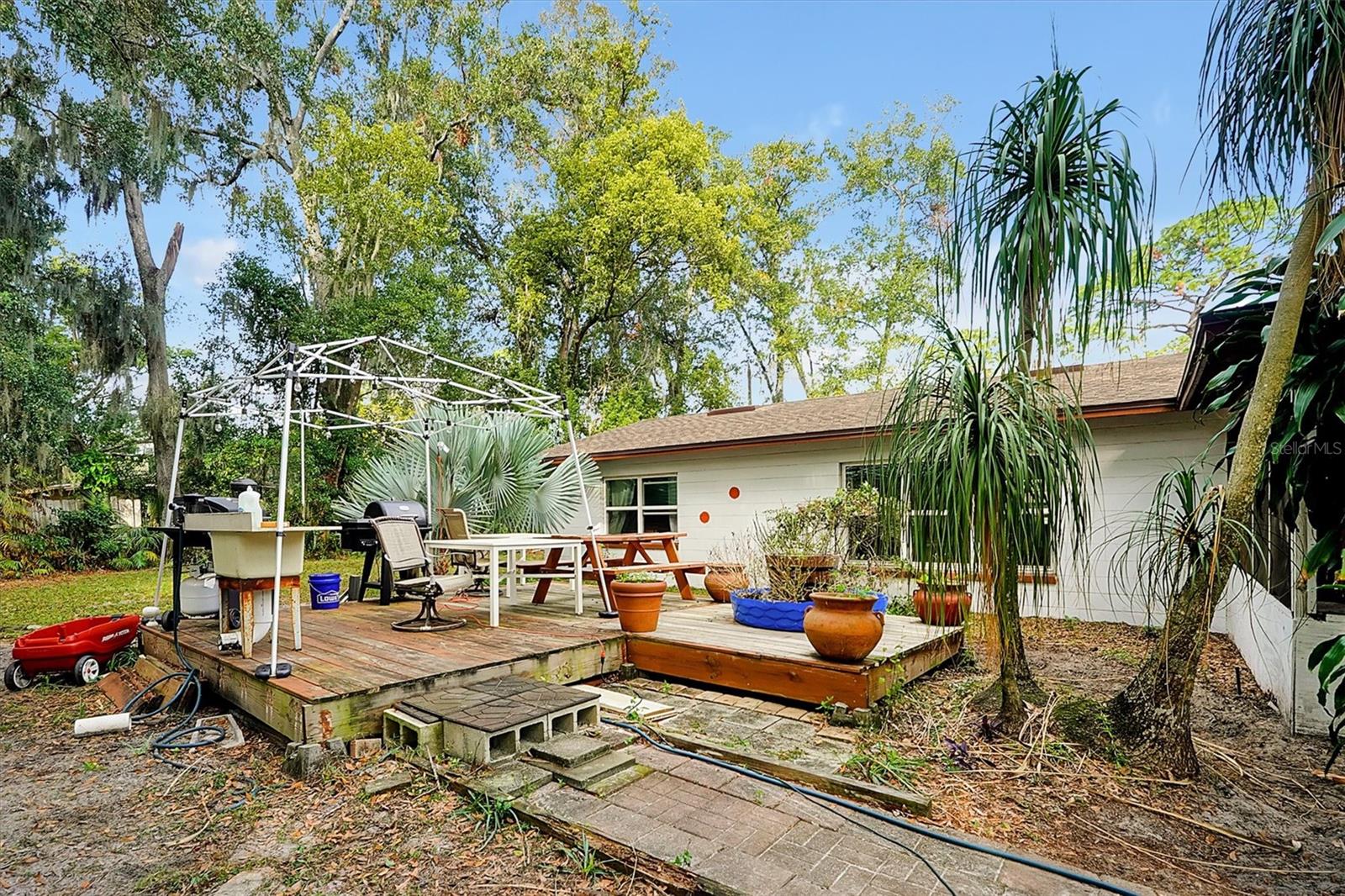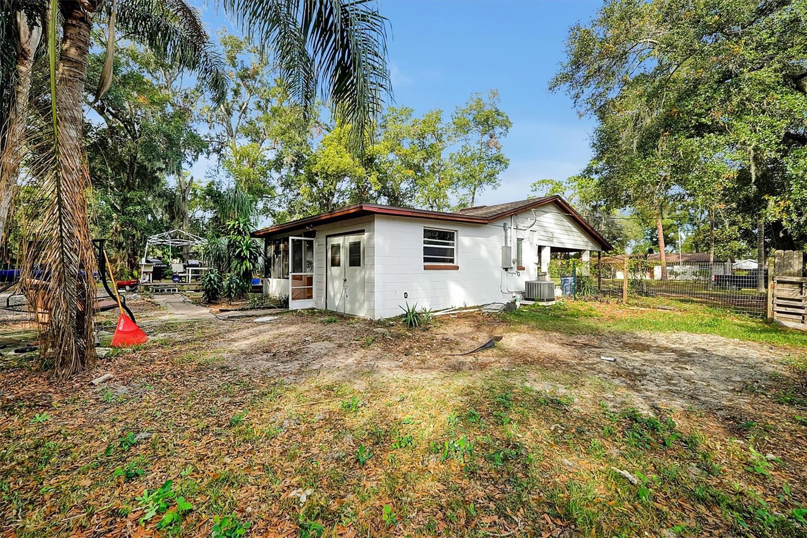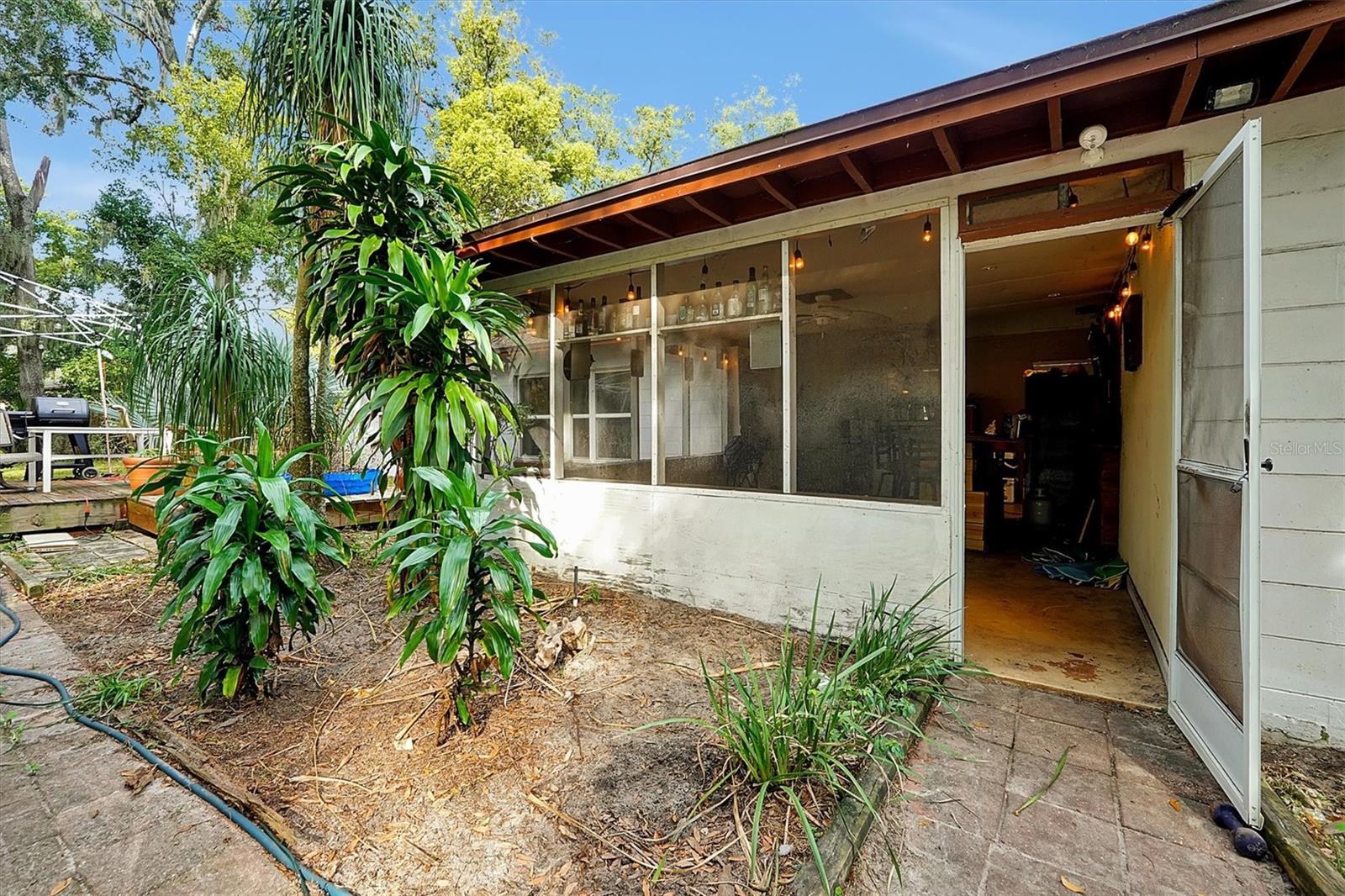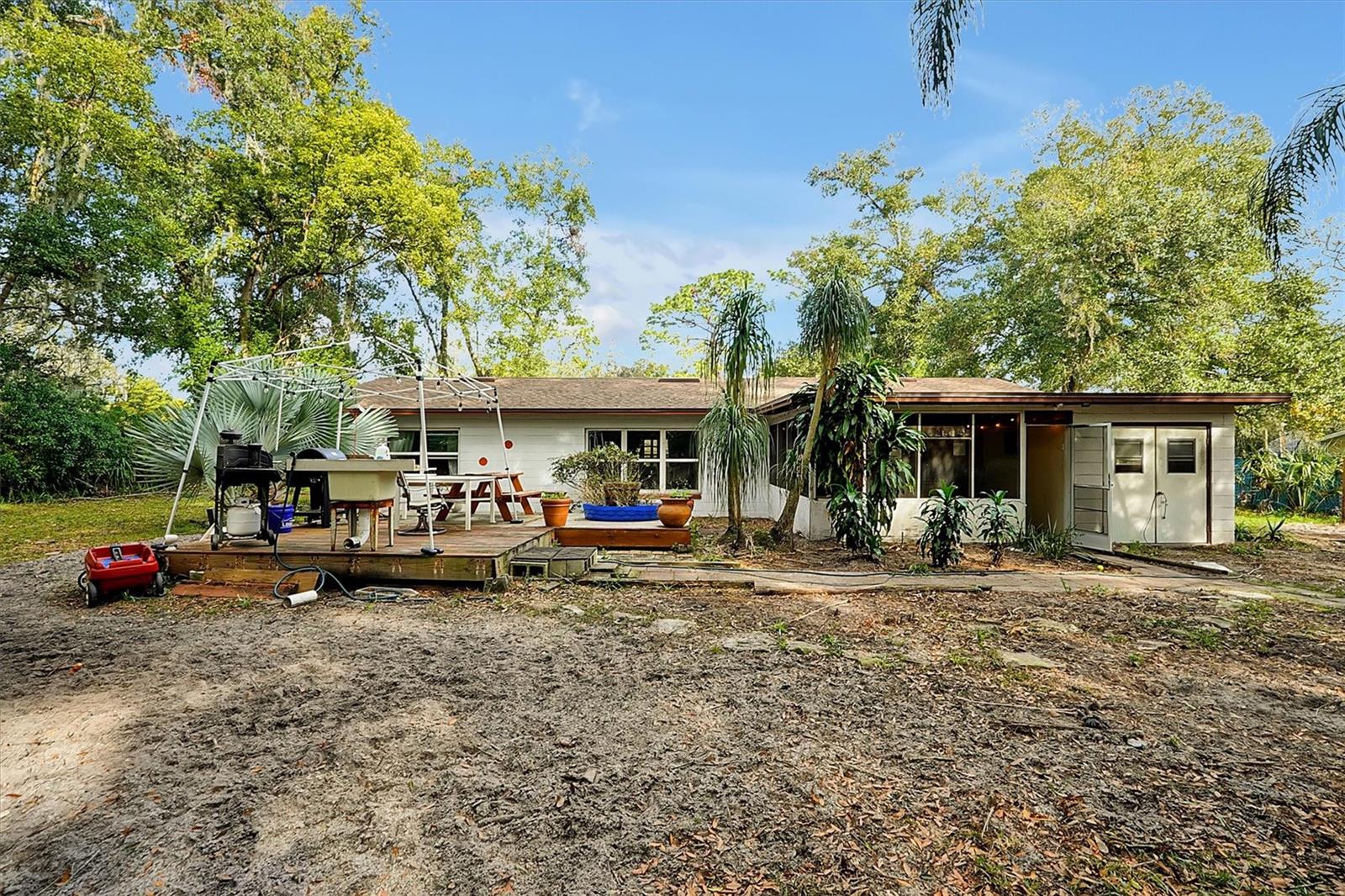 This charming 2-bedroom, 2-bath home is located in Longwood and is conveniently situated near shopping, hospitals, restaurants, and the interstate. Set on a spacious lot of nearly ½ acre, it boasts new windows and a roof installed in 2022, while the air conditioner was replaced in 2020. The electrical panel has been updated, and the home has been replumbed. New tile flooring flows throughout the space. The property features a fully fenced yard with a new wooden deck, and all appliances will remain with the home. Enjoy a large screened room complete with a tiki bar, as well as a separate laundry area that includes a full bath. This home offers the potential to easily convert into a 3-bedroom by enclosing the screened room or dining area. Easy show