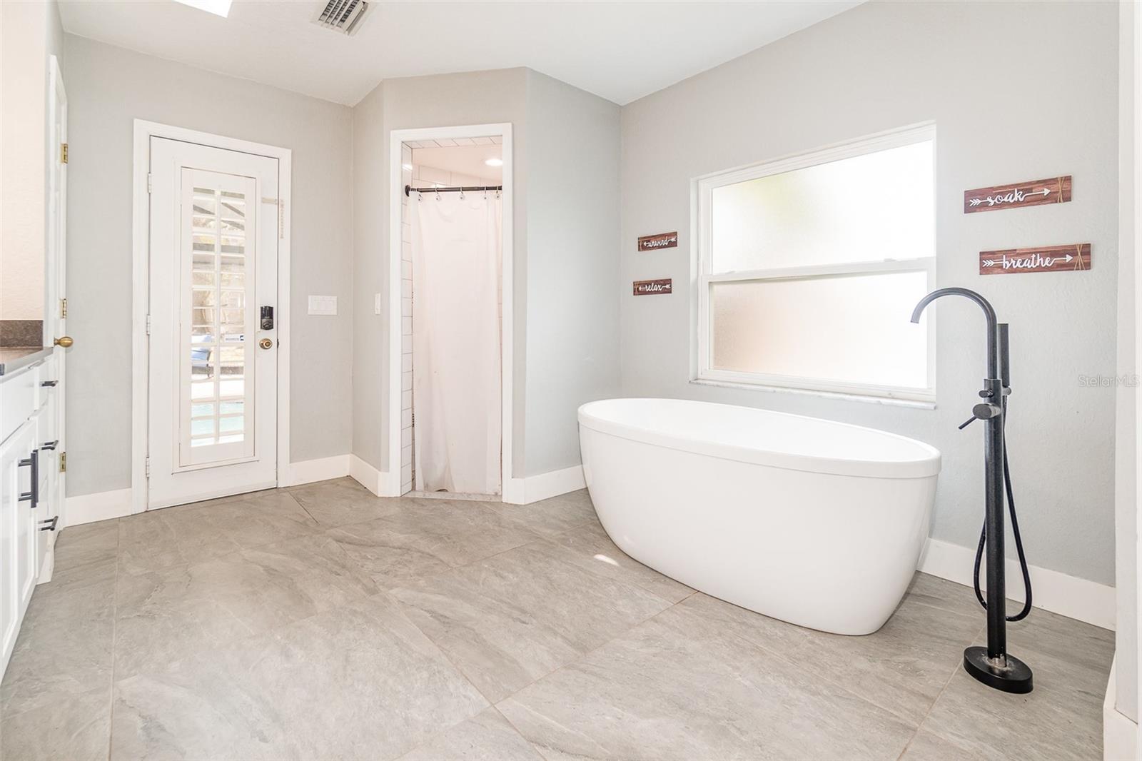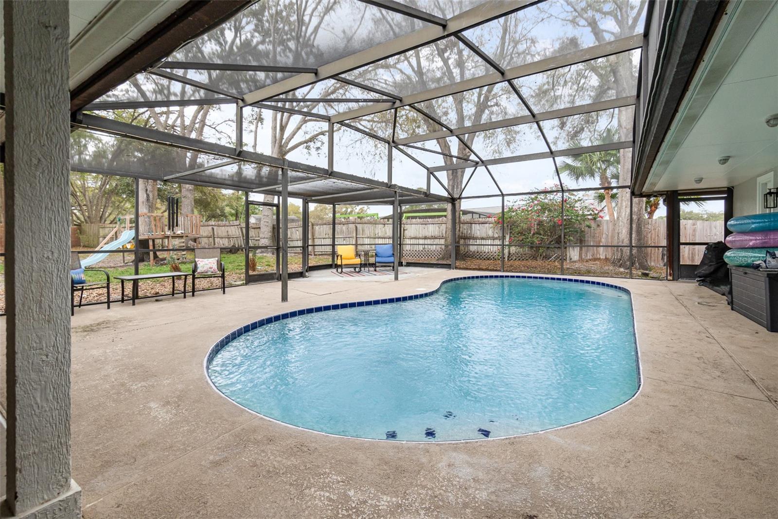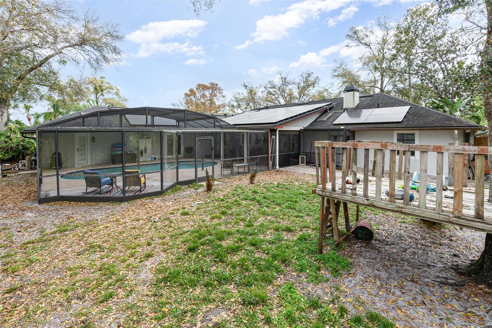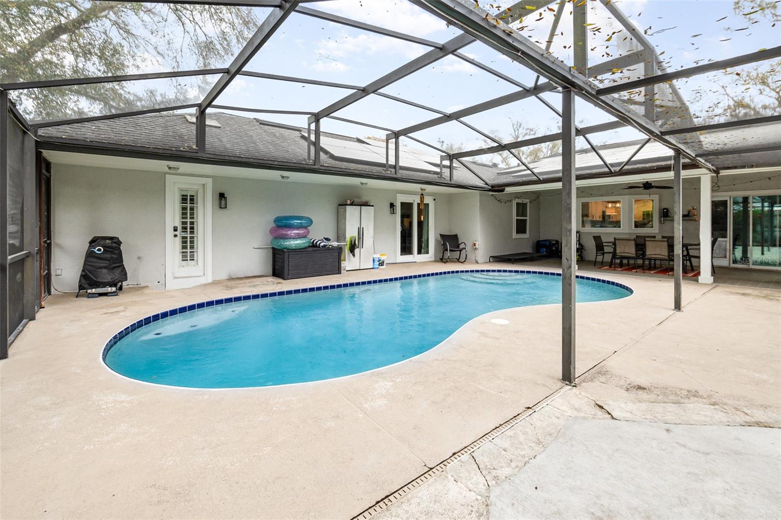 Located in the desirable Sabal Point community, this stunning 4 bedroom home with FLEX ROOM (Flex room can be a 5th bedroom or part of a 2-bedroom in-law suite) has a split floor plan offering privacy and flexibility. UPGRADED FLOORING flows throughout, complemented by a bonus half bath with a dog wash. The MODERN KITCHEN has ample counter space and breakfast nook. NEW ROOF (roof installed prior to closing) and UPDATED PLUMBING AND WIRING bring you peace of mind for many years. The oversized lot provides plenty of outdoor space. Relax in the screened-in lanai or enjoy the NEWLY RESURFACED / RE-TILED POOL and new screen. A bonus room above the garage offers endless possibilities. The primary suite hosts a vast bedroom with pool access, ensuite bath with LUXURIOUS TUB, walk-in shower, dual vanities, and dual walk-in closets. Solar panels keep energy bills low, and SKYLIGHTS provide natural light. Located near top schools, this home is the perfect blend of comfort, luxury, and efficiency.