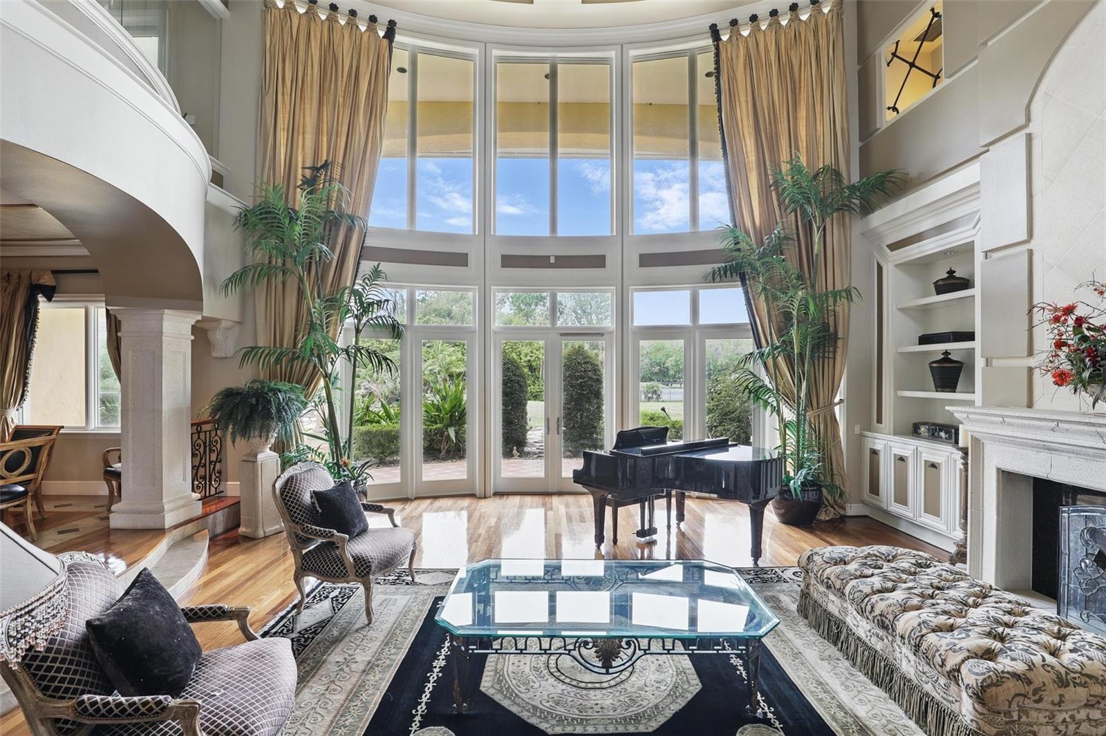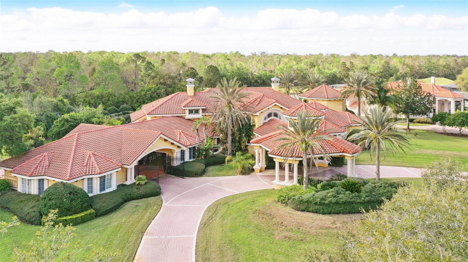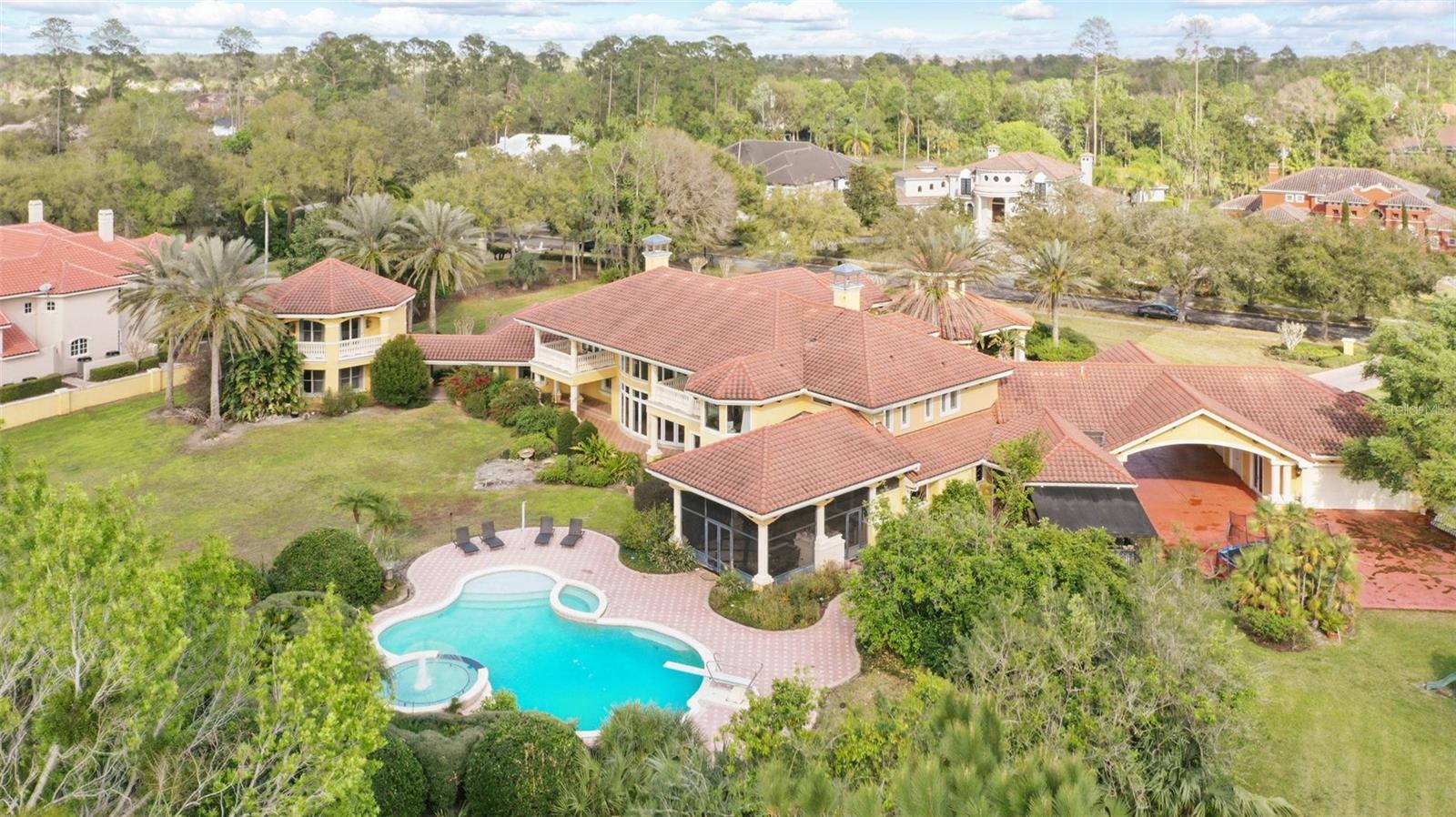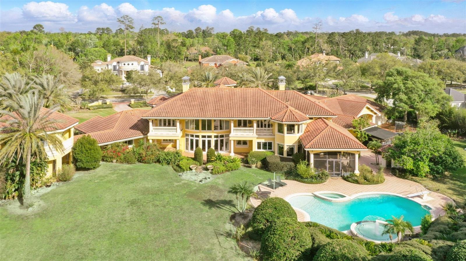 Exquisite Mediterranean Estate in the Exclusive Alaqua Community! Welcome to your dream home, nestled within the exclusive guard-gated community of Alaqua. This breathtaking Mediterranean estate sits on over two acres, offering stunning views of the Champion Golf Course. As you step into the grand foyer, you are immediately captivated by the elegance of dual spiral Mediterranean-style staircases leading to the luxurious second-floor master suite. To the other side, yet another beautifully designed in-suite bedroom. The first-floor features three spacious en-suite bedrooms, a movie theater, and a stunning custom Mediterranean-style kitchen, complete with a cozy living area and breakfast nook. The 2 living rooms and dining room showcase custom furnishings, creating a refined yet inviting ambiance. Step outside to your private outdoor oasis, where a covered patio with a fireplace and built-in grill sets the perfect stage for entertaining. The resort-style pool, complete with a diving board, offers endless relaxation and fun. This home boasts a private gym and an attached garage ensuring convenience. Additionally, it features a two-level guest house/ in-law suite, with a complete living area, kitchenette, and half bathroom on the main level. Upstairs you will find a spacious bedroom suite with a full bathroom. This exceptional estate is a rare opportunity to experience elegance, privacy, and world-class golf course views in one of Longwood’s most sought-after communities.