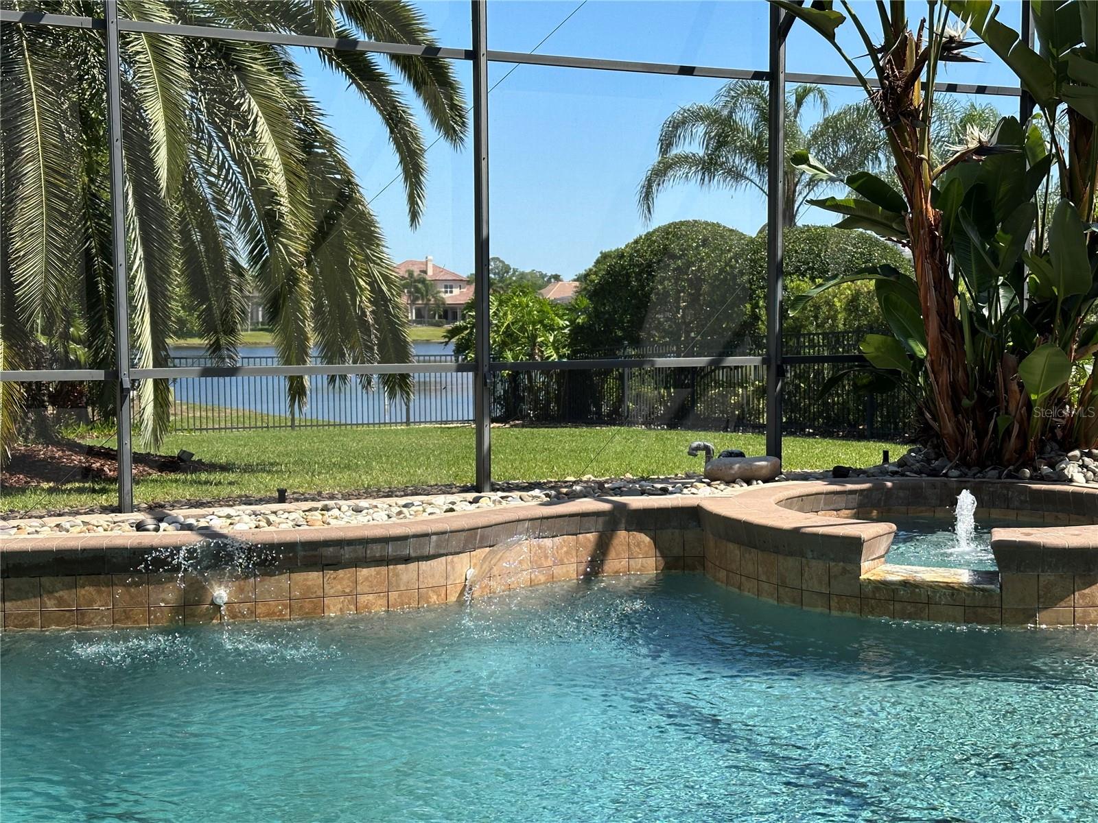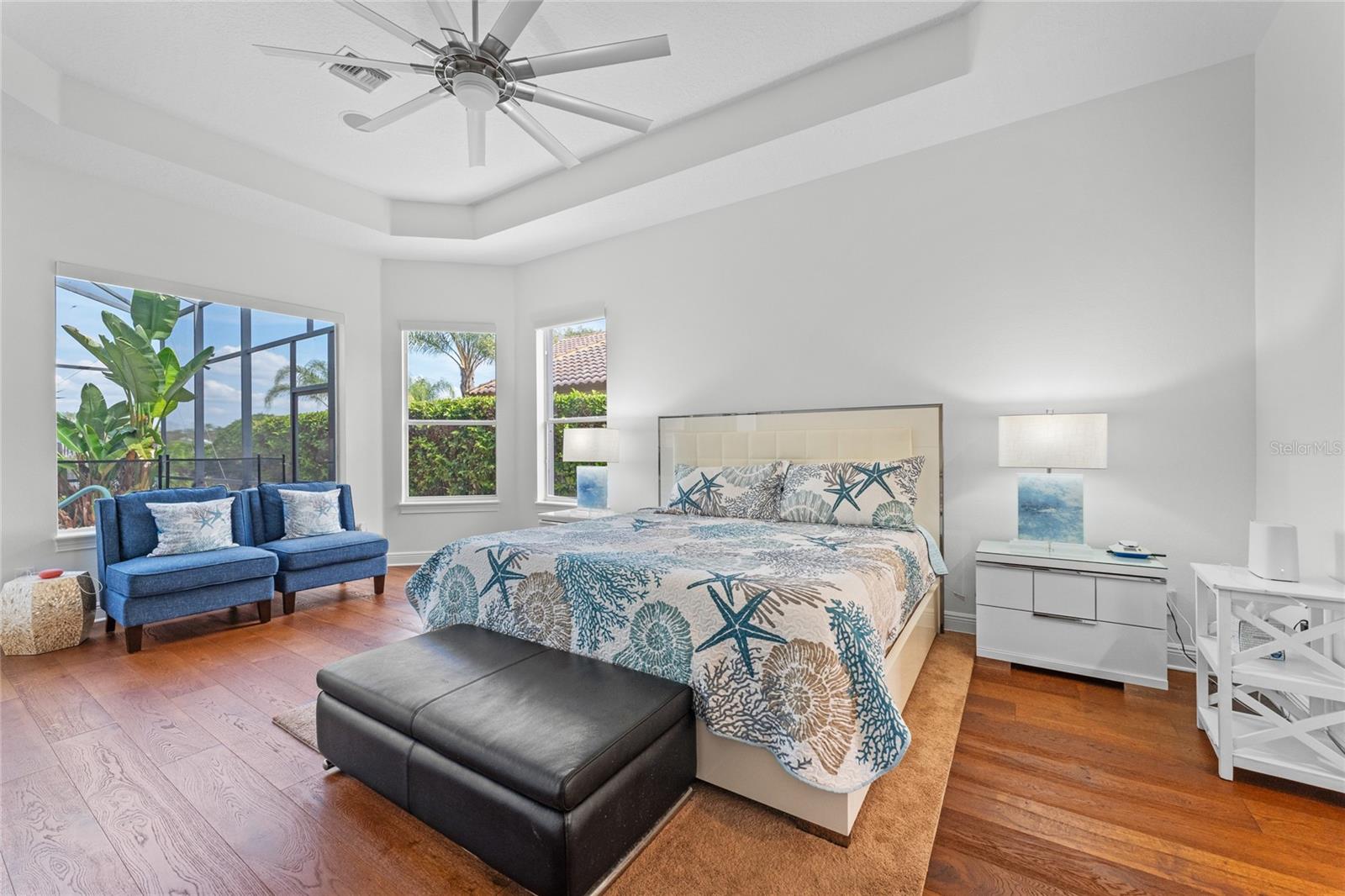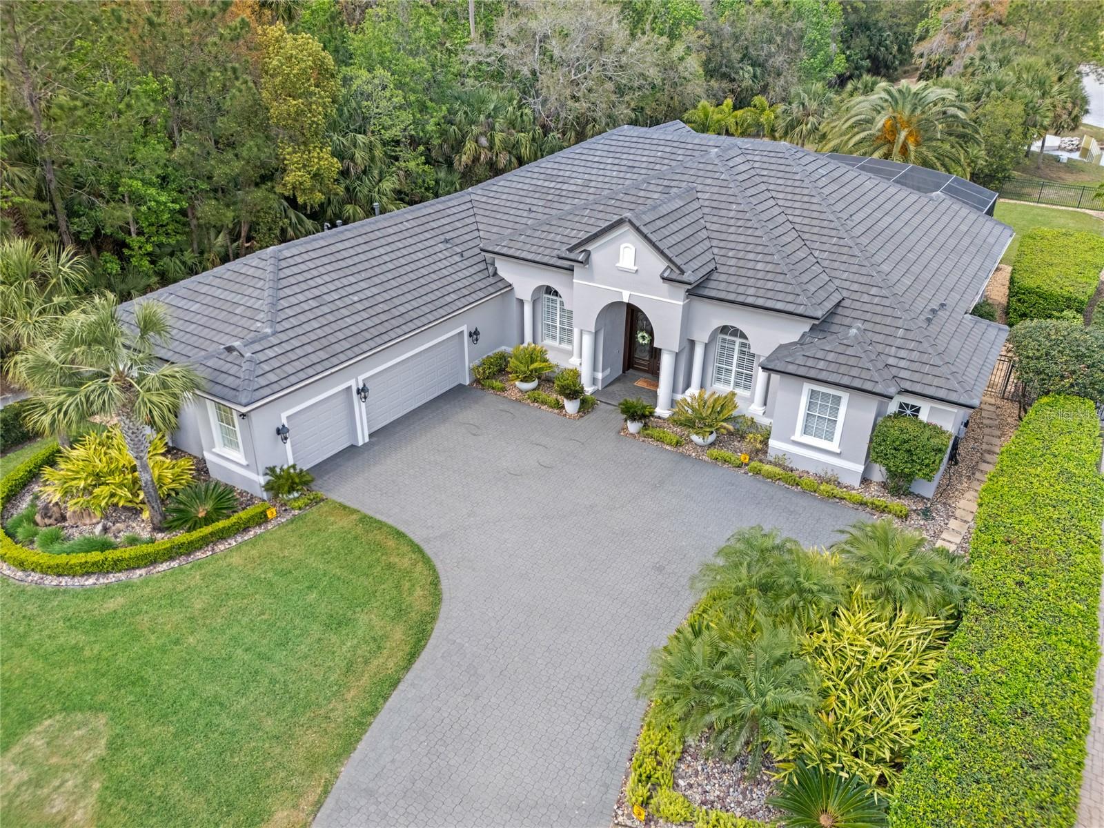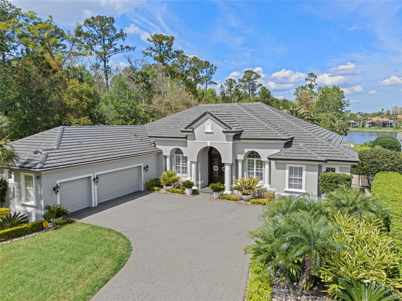 Tucked away on what is arguably the most private oversized homesite (.66 acres) in the prestigious 24-hour guard-gated community of Alaqua Lakes, this single-level executive estate is perfectly positioned at the end of a cul-de-sac offering serene water views and ultimate privacy. This thoughtfully updated 4-bedroom, 3.5-bath home with a dedicated office and spacious bonus room has been extensively upgraded for a truly move-in ready experience. Recent enhancements include: NEW Tile Roof (2023), NEW Trane A/C System (2022), NEW Generac Whole-House Generator (2023), NEW Tankless Water Heater (2022), NEW Quartz Kitchen Counters & Stainless Appliances (2022), NEW Heated Pool System & Aqualink Control (2023)...and so much more! The bright, open layout is perfect for both everyday living and entertaining. With tile and hardwood flooring throughout—no carpet anywhere, this home delivers a clean and modern aesthetic. A brick paver driveway welcomes you home, leading to new mahogany double entry doors that open into a sunlit interior. The living room features a custom electric fireplace, creating a cozy yet contemporary focal point. The chef's kitchen shines with new quartz countertops, high-end stainless appliances, and dual wine/beverage fridges for ample cool storage. Step outside to enjoy the Florida lifestyle at its finest with a screened, covered lanai overlooking the sparkling, heated pool, fenced backyard, and peaceful water views. The private primary suite boasts newly installed hardwood flooring, dual walk-in closets, and a luxurious bath with quartz counters. A large bonus room tucked at the rear of the home is ideal for game day gatherings or movie nights. Residents of Alaqua Lakes enjoy exclusive access to a 7-acre community park with an open-air pavilion, tennis courts, a multi-purpose field, and more—just minutes from top-tier shopping, dining, business hubs, and major roadways. This exceptional property combines privacy, luxury, and convenience—schedule your private showing today! This property may be under audio/visual surveillance.