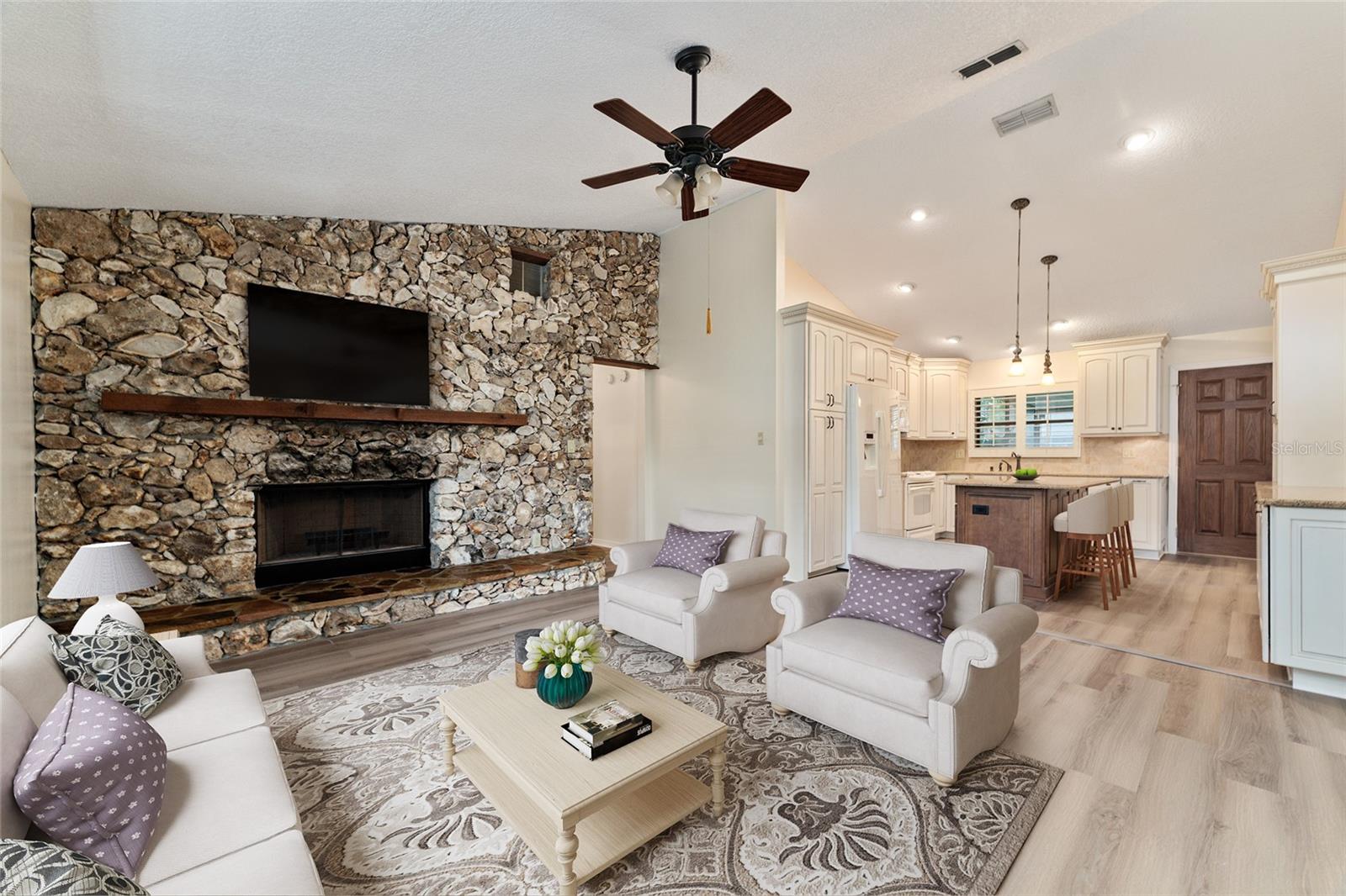 NEW ROOF (see new ext pictures). Beautifully remodeled 3-bedroom, 2-bath home perfectly situated on a quiet cul-de-sac in the desirable Wekiva community! This move-in-ready single-story home features brand-new luxury vinyl plank flooring throughout, fresh interior and exterior paint, and new modern hardware. The stunning kitchen showcases high-end cabinetry, fixtures, and premium appliances, while the remodeled primary suite offers a custom vanity, upgraded shower, and organized closet system. Updated plumbing and electrical, newer A/C (2018), double pane windows throughout and new sod in the front. The spacious family room with fireplace and large backyard are perfect for relaxing or entertaining. Close to parks, trails, shopping, and top-rated schools—this home combines comfort, quality, and timeless style! One or more photo(s) has been virtually staged.