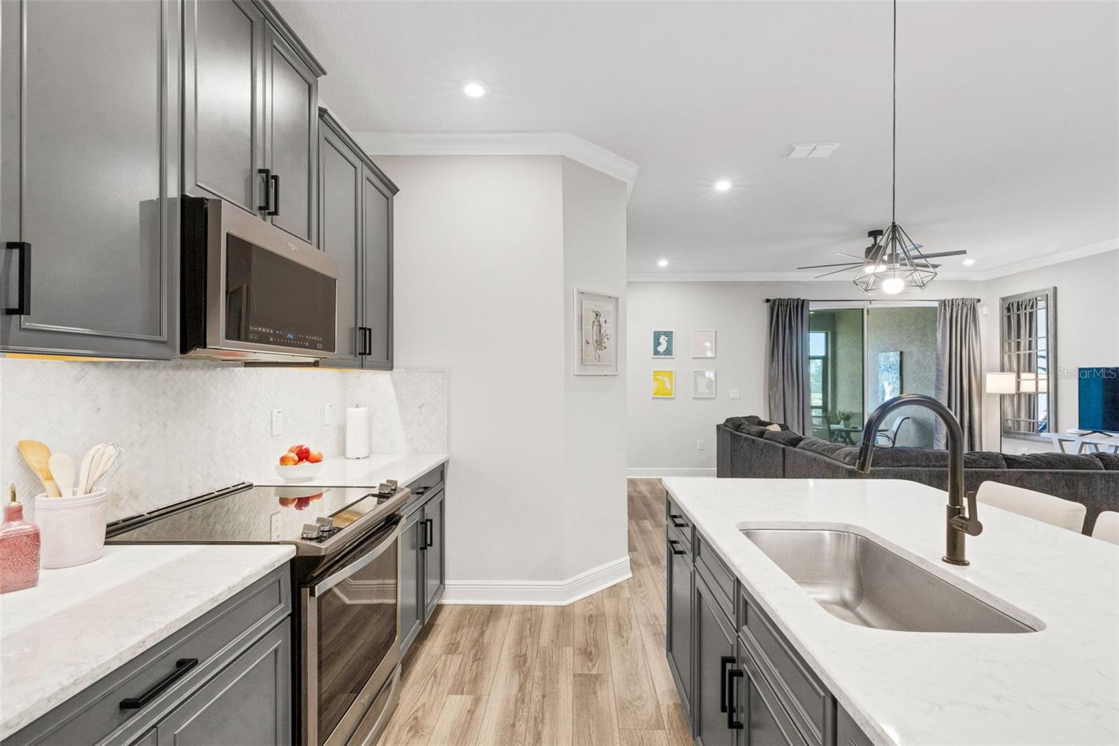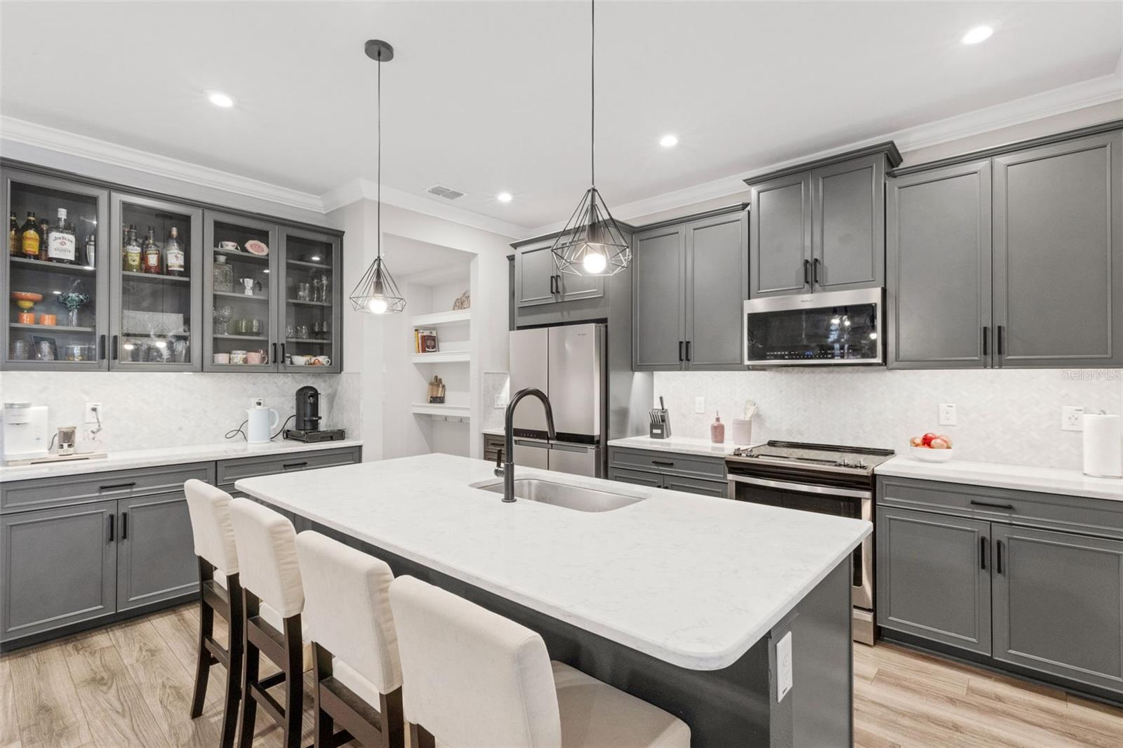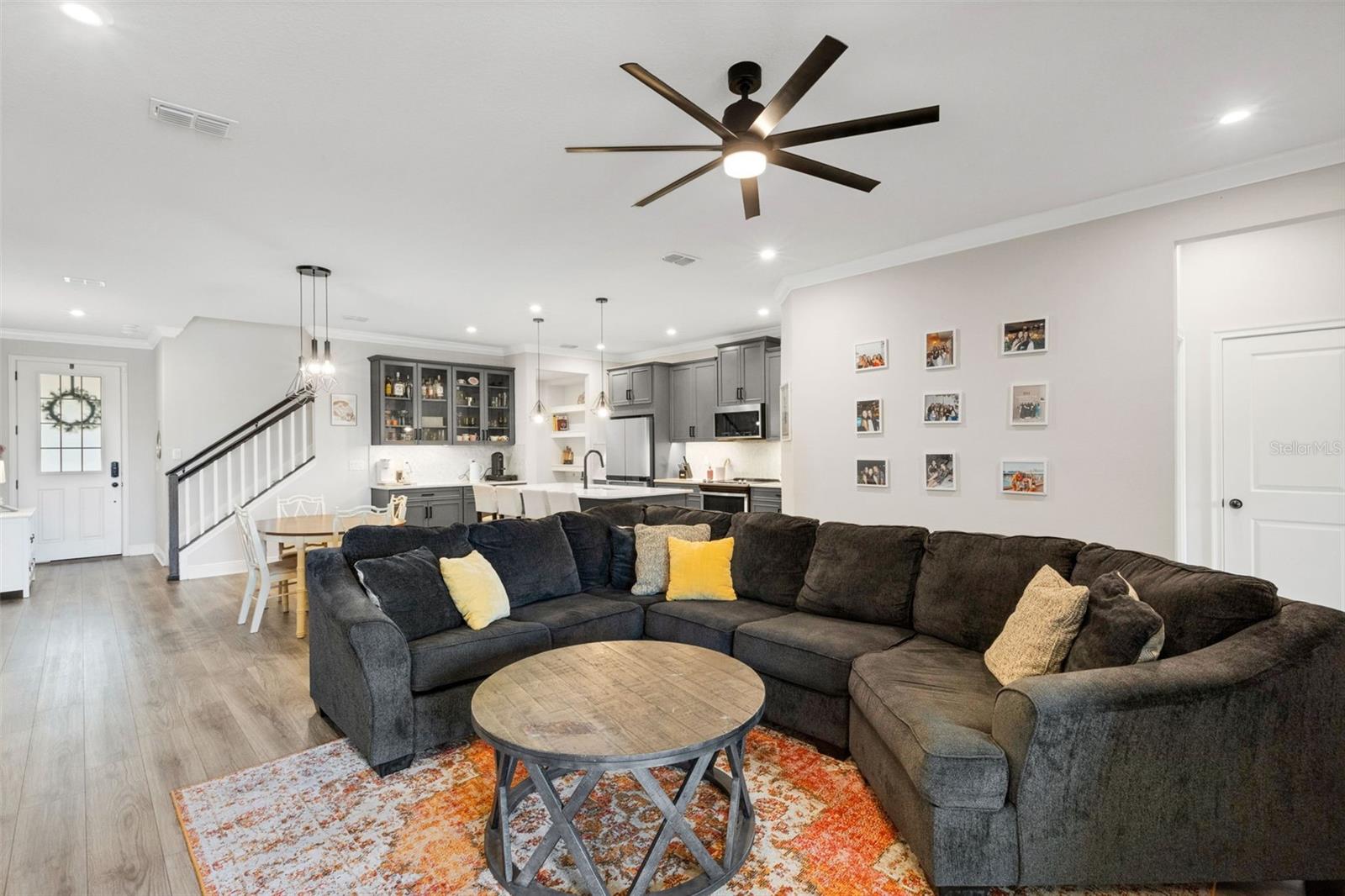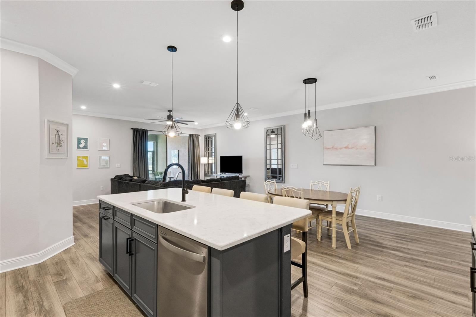 Welcome to the Venice model townhome (built in 2021) by Mattamy Homes in the highly desirable community of Parkview at Long Lake Ranch. Situated on a premium waterfront lot, this impressive two-story residence offers nearly 2,600 square feet of thoughtfully designed living space, featuring 4 bedrooms, 3 full bathrooms, a spacious bonus loft, and a 2-car garage. The first floor showcases a bright and open floor plan ideal for both everyday living and entertaining. The designer kitchen is the heart of the home, featuring abundant cabinetry, generous counter space, a large center island with breakfast bar, Whirlpool stainless steel appliances, and convenient under-stair storage that functions perfectly as an oversized pantry. The kitchen flows seamlessly into the combined living and dining areas, where sliding doors lead to a covered and screened lanai overlooking tranquil water views—the perfect spot to relax and unwind. A first-floor bedroom or home office and full bath adds flexibility for guests or remote work. Upstairs, you’ll find an expansive loft/bonus room, ideal as a second living area, media room, or play space. The owner’s suite is generously sized and highlighted by a tray ceiling and a luxurious ensuite bathroom featuring dual raised vanities with quartz countertops, an oversized super shower, and a massive walk-in closet. Two additional bedrooms also feature large walk-in closets and share a well-appointed hall bath. A spacious second-floor laundry room adds everyday convenience. Nearly every available builder upgrade, including the premium lake/preserve lot, crown molding, luxury vinyl and tile flooring, upgraded cabinetry, quartz countertops, enhanced lighting and fixtures. and more. Additional features include custom blinds, new washer and dryer, epoxy garage floor, ceiling fans, and a leased water treatment system. Enjoy low HOA fees that include water, along with access to the gated community’s resort-style amenities, including a sparkling pool, park, playground, and dog park. Conveniently located near shopping, dining, grocery stores, and everyday essentials. This home is also just 3 miles from the Veterans Expressway and 8 miles from I-75, offering easy access throughout the Tampa Bay area. Move-in ready and beautifully upgraded—schedule your private showing today.