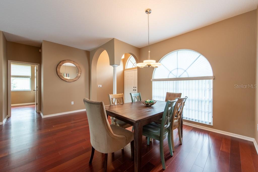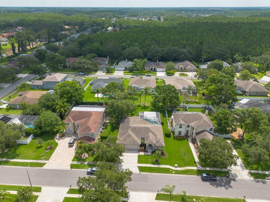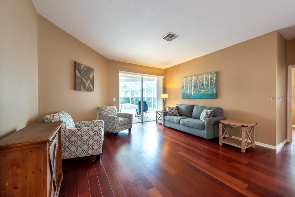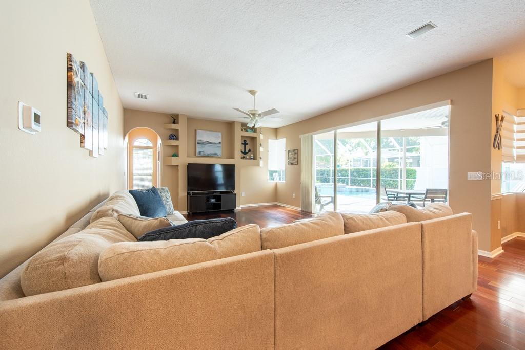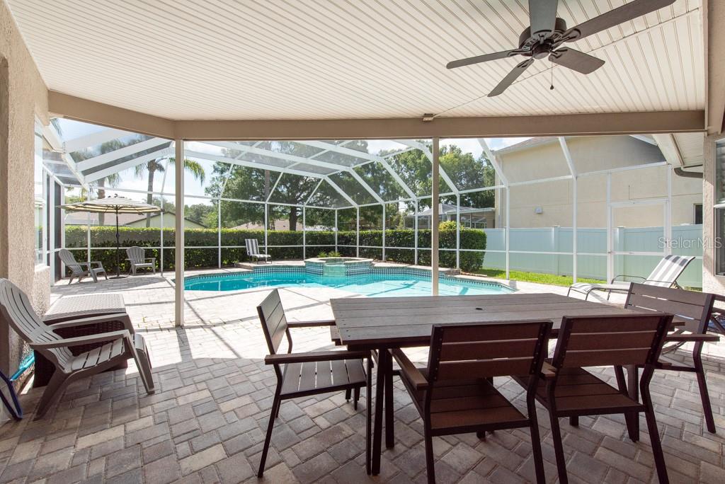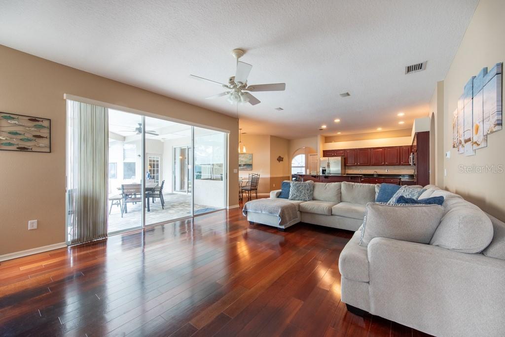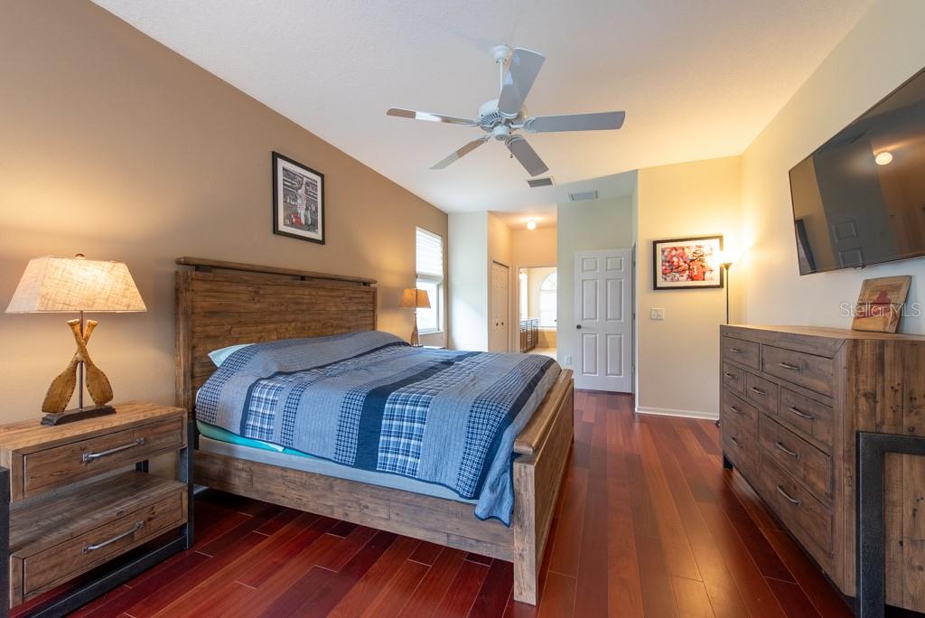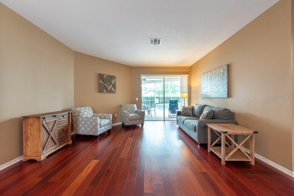 Sunshine, style, and space—this stunning 4-bedroom, 3-bath pool home delivers it all in the sought-after Steinbrenner School District. With 2,574 square feet of beautifully designed living space, a 3-car garage, and a brand-new A/C, every inch of this home is built for comfort and function. Inside, rich wood flooring flows throughout the home, creating warmth and cohesion. The split-bedroom layout offers privacy and flexibility, with updated bathrooms and thoughtful touches throughout. The kitchen stands out with its solid wood cabinetry, breakfast bar, and generous storage—ideal for both everyday meals and hosting a crowd. The primary suite is a true retreat, complete with serene views of the pool, a spacious walk-in closet, and a spa-inspired en-suite featuring wide stone counters, dual sinks, a soaking tub, and a separate glass-enclosed shower. Step outside to your personal resort—an oversized screened-in pool and spa surrounded by a large backyard, perfect for barbecues, birthday parties, or simply relaxing in the Florida sun. Whether you're entertaining friends or letting the family and pets roam, there's plenty of room to spread out and enjoy. Set on a quiet street with low HOA fees and no CDD, this home pairs peace of mind with prime location. Zoned for some of the best schools in the area and meticulously maintained, it’s the kind of place you move into and never want to leave.
