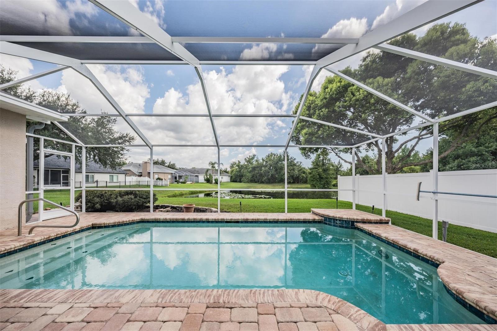 Price Improvement! Immaculate home in Willow Bend offering both elegance and practicality. You’ll find a formal living room, separate dining room, family room, three bedrooms, and a two-car garage. Nestled on a tranquil pond, this home features a split floorplan for enhanced privacy. Direct access to the pool is available from the formal living room, kitchen, family room, and primary suite; perfect for entertaining or peaceful relaxation. The dining room is ideal for hosting, while the family room’s rich hardwood floors create a warm and cozy ambiance. The kitchen has been upgraded, with solid-wood cabinetry, soft-close drawers, granite countertops, and a cozy eat-in area. Key additional improvements include epoxy-coated garage floors; a new HVAC system installed (July 2025), three new hurricane-impact windows added to the back of the house (July 2025), freshly sealed lanai pavers (July 2025), a newly painted and rescreened aluminum pool cage (July 2025), and a new pool motor (2024). The roof was replaced in 2016. No CDD fee! This home truly captures Florida living: thoughtful upgrades, a smart layout, and lovely outdoor space. Don’t miss your chance to call it yours!